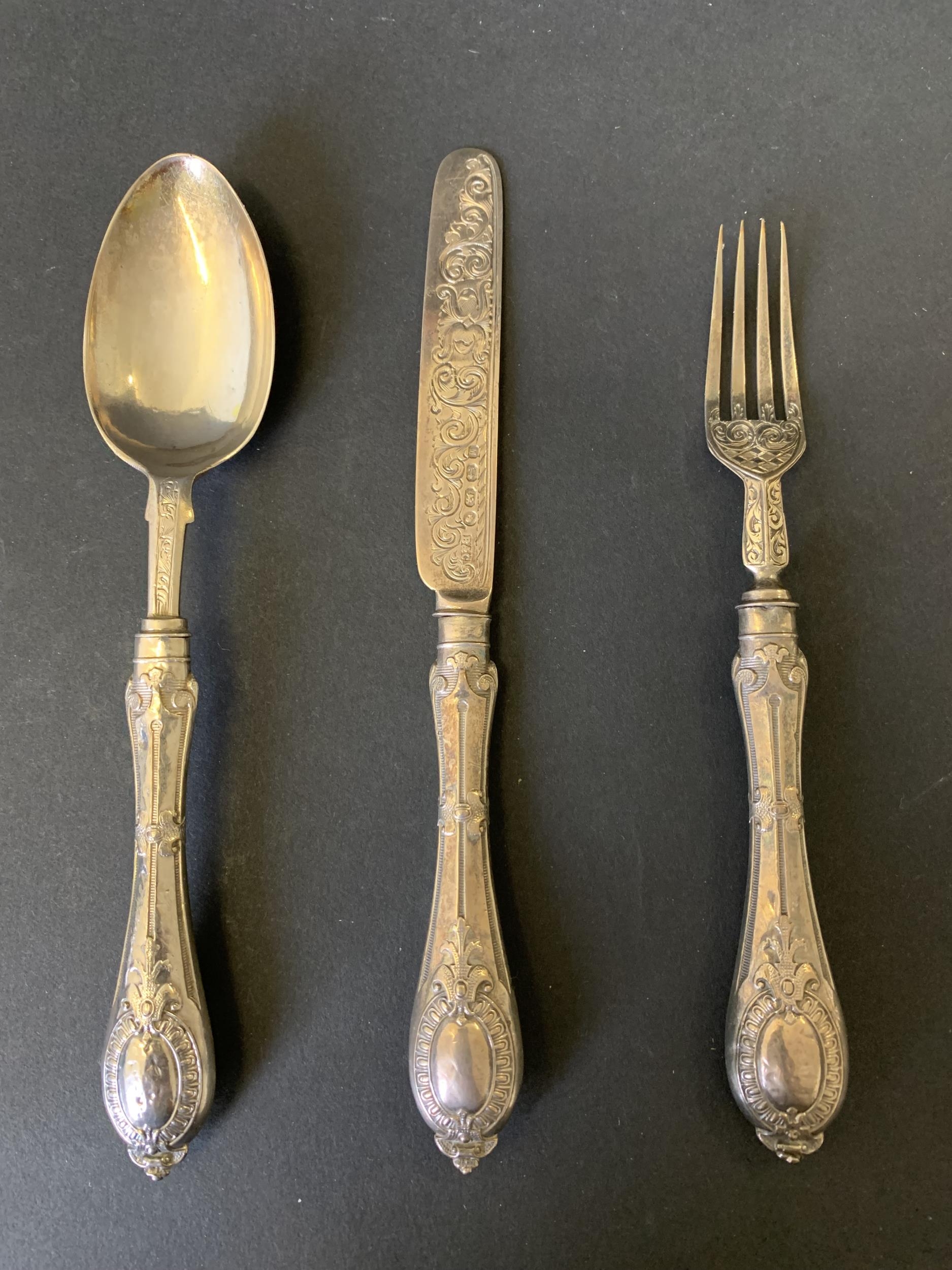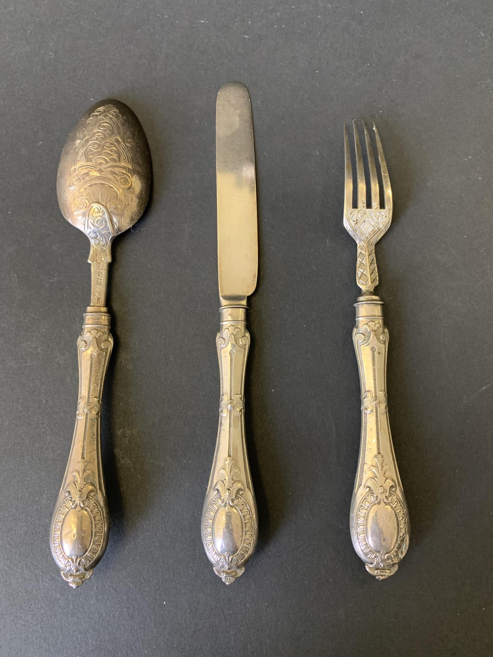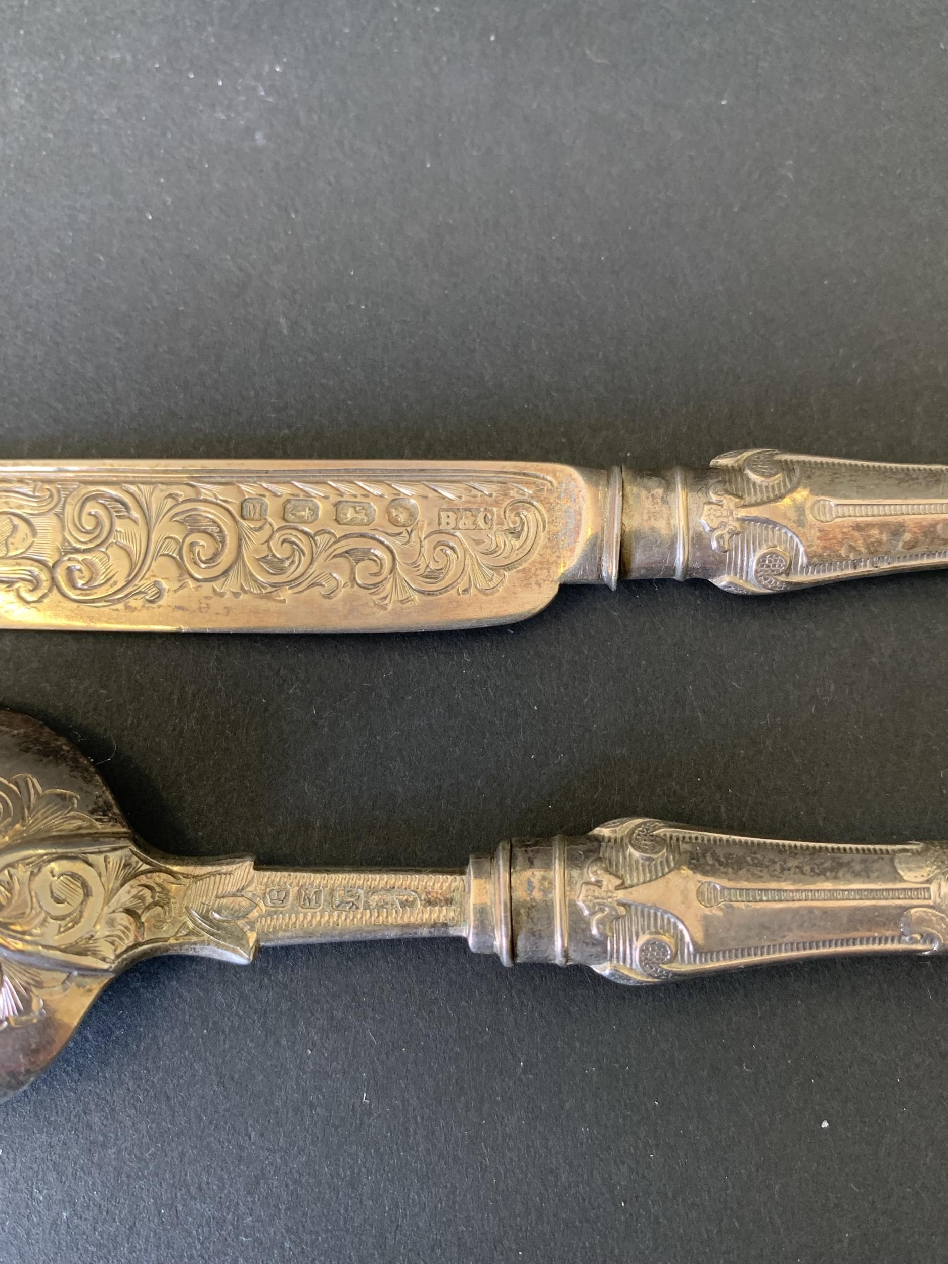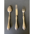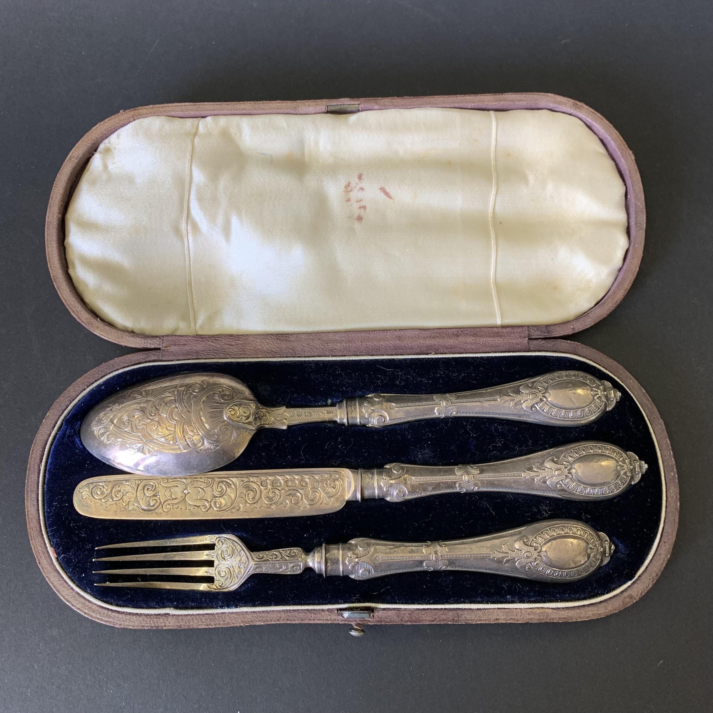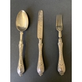 A cased set of silver flatware all in the same pattern but each marked differently, the spoon is Sheffield, the knife Victorian Birmingham, the fork is unmarked, total weight approx. 75g