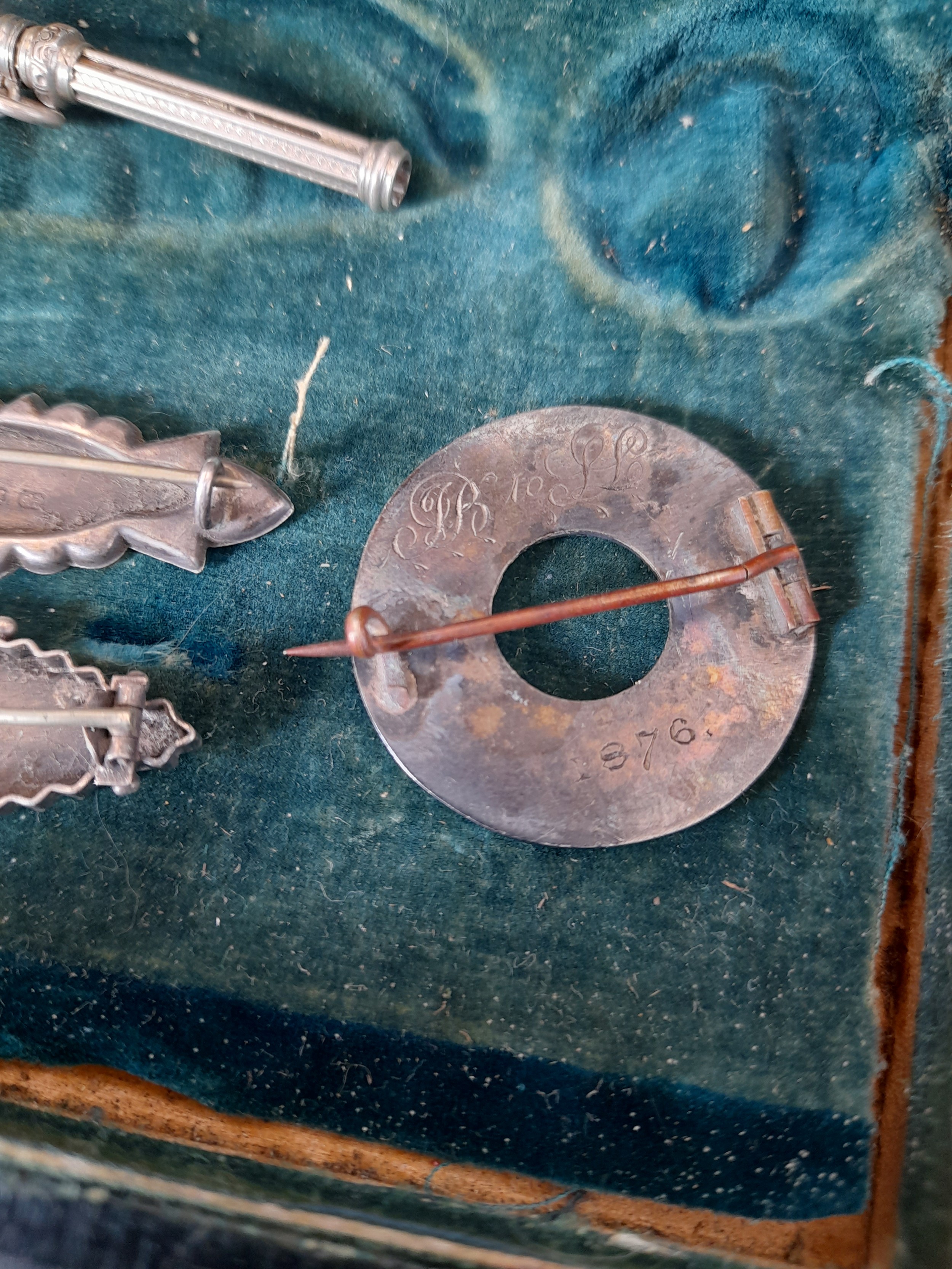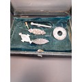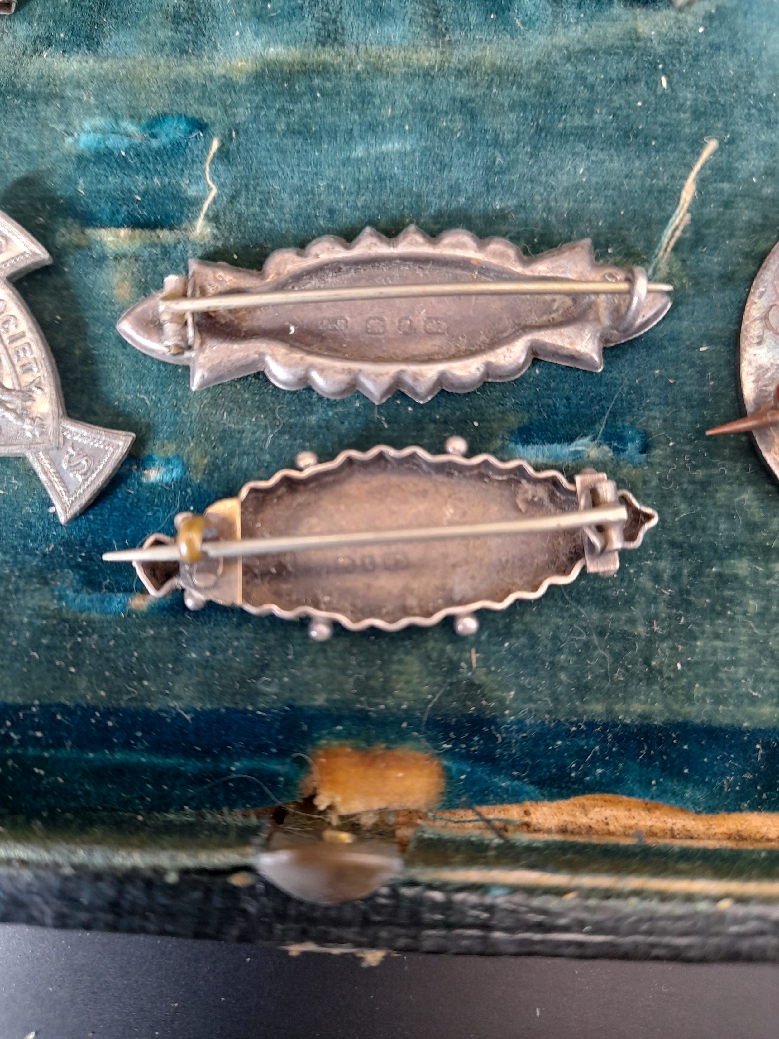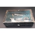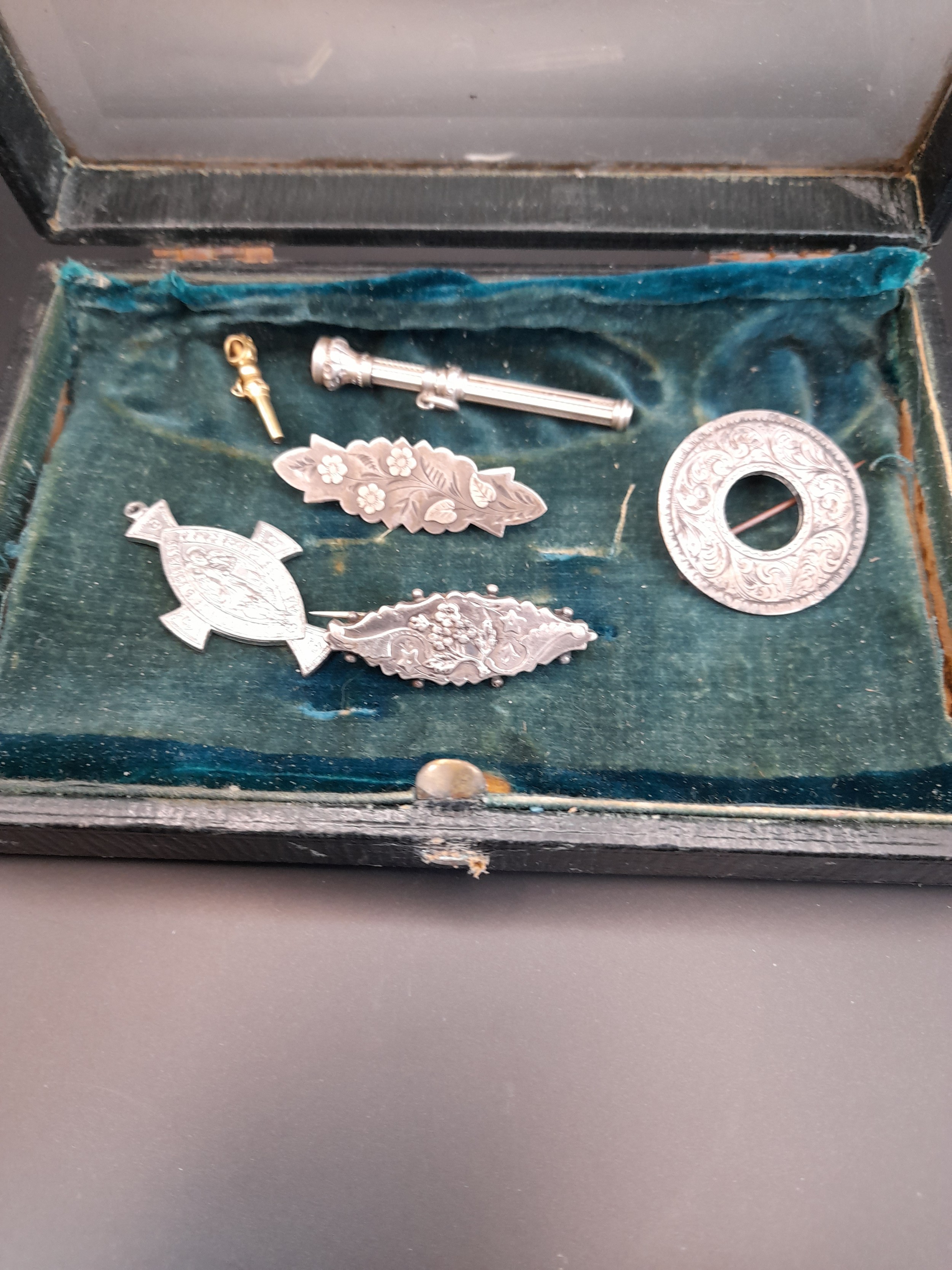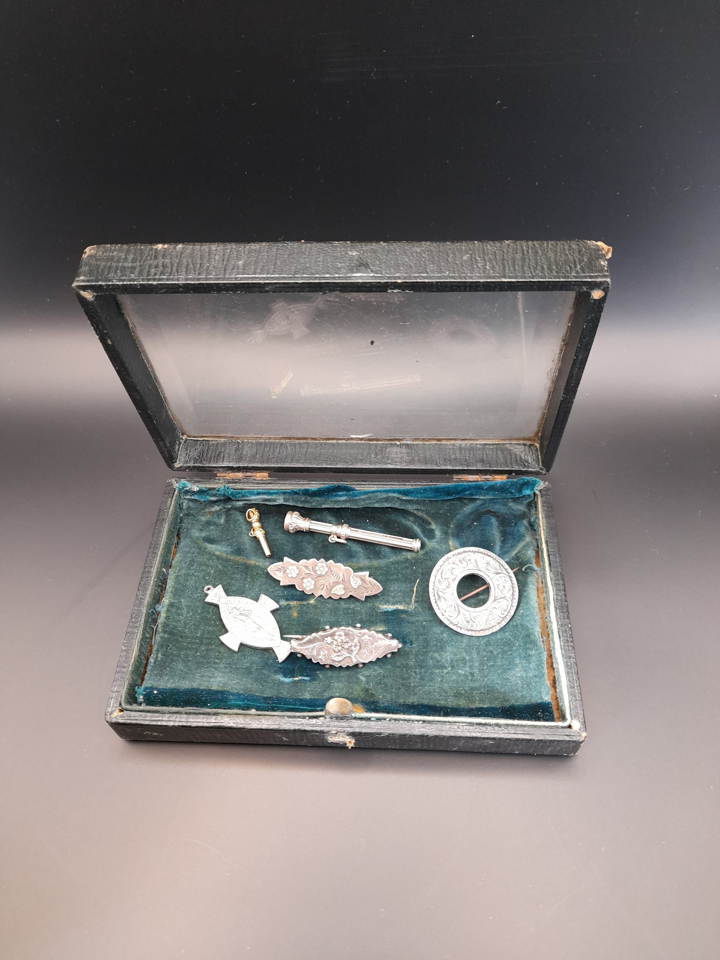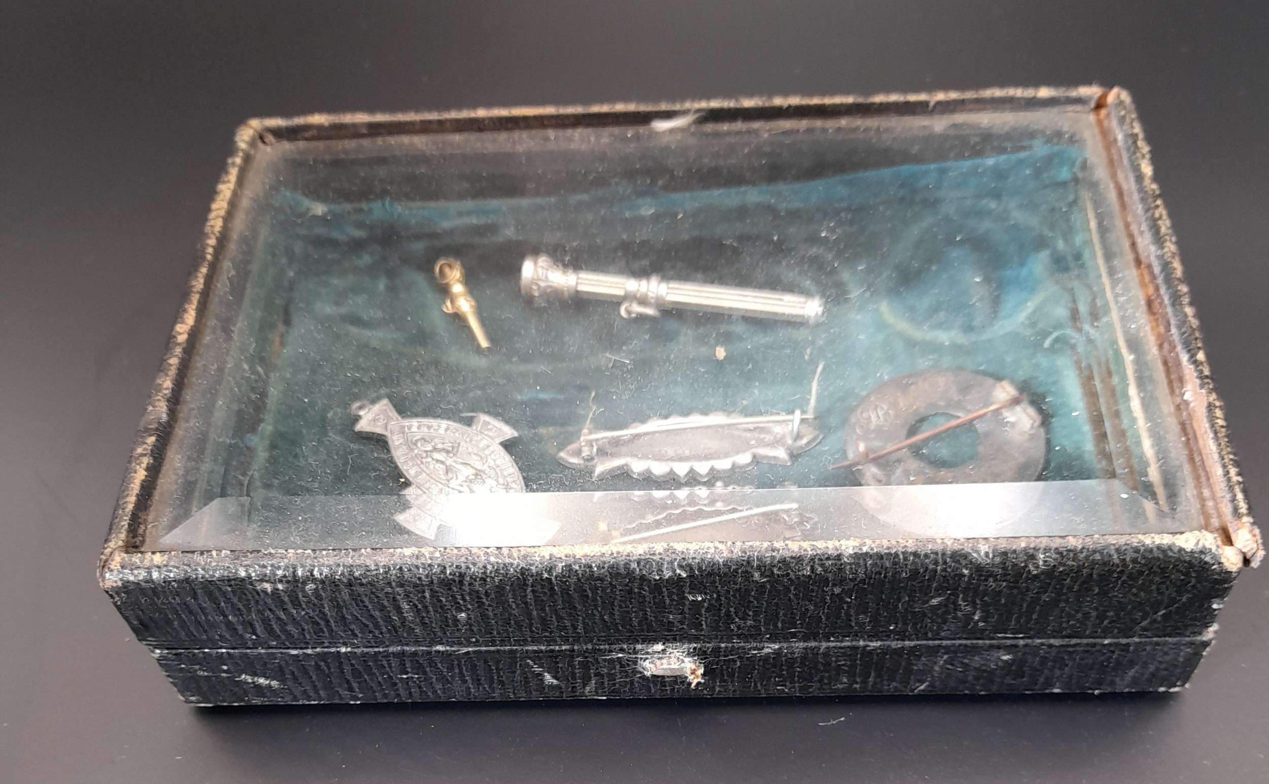 Small display box with bevel glass lid containing Silver Halmarked brooches and other items. (6+ box)