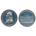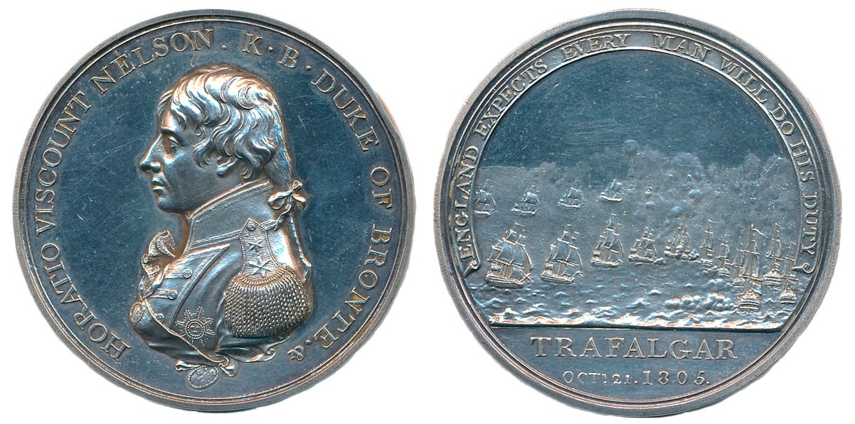 1805 Boulton’s Trafalgar Medal in silver, later re-strike without edge inscription, small holes in edge at 3 and 9 o’clock from being mounted, some light scratching in fields, otherwise good very fine. (See photo) (Y)