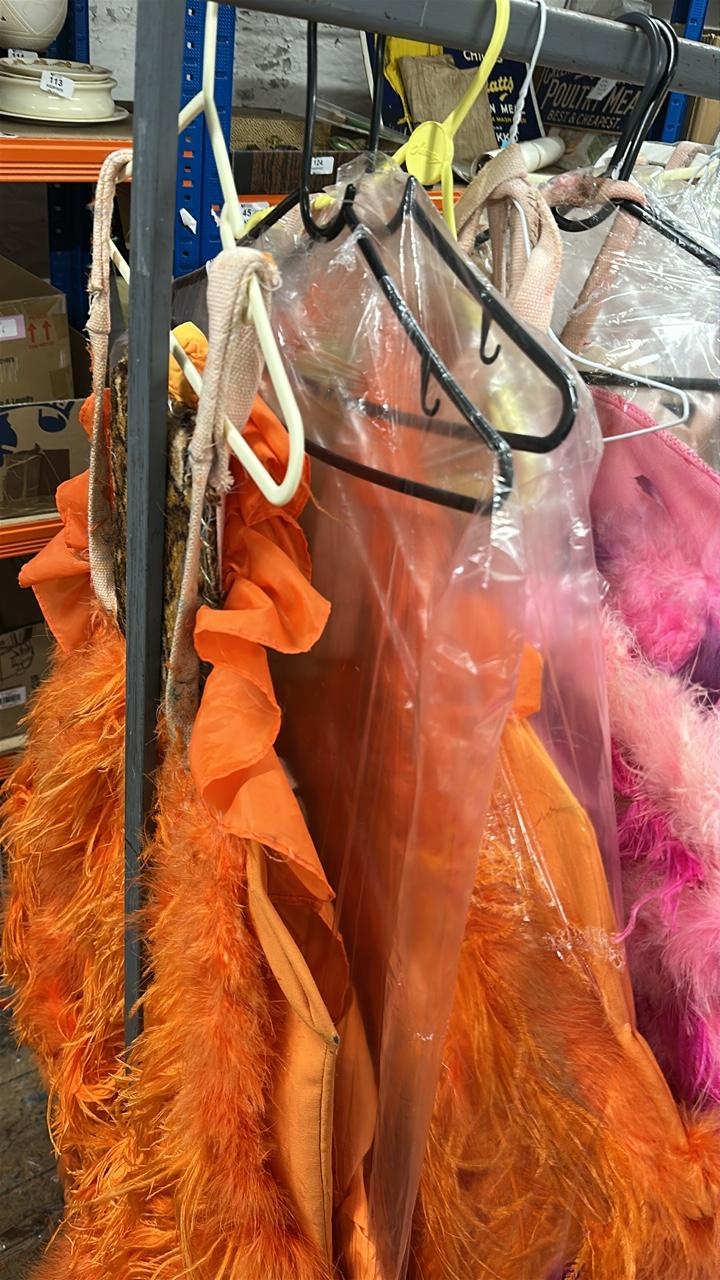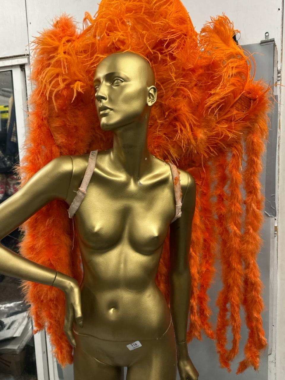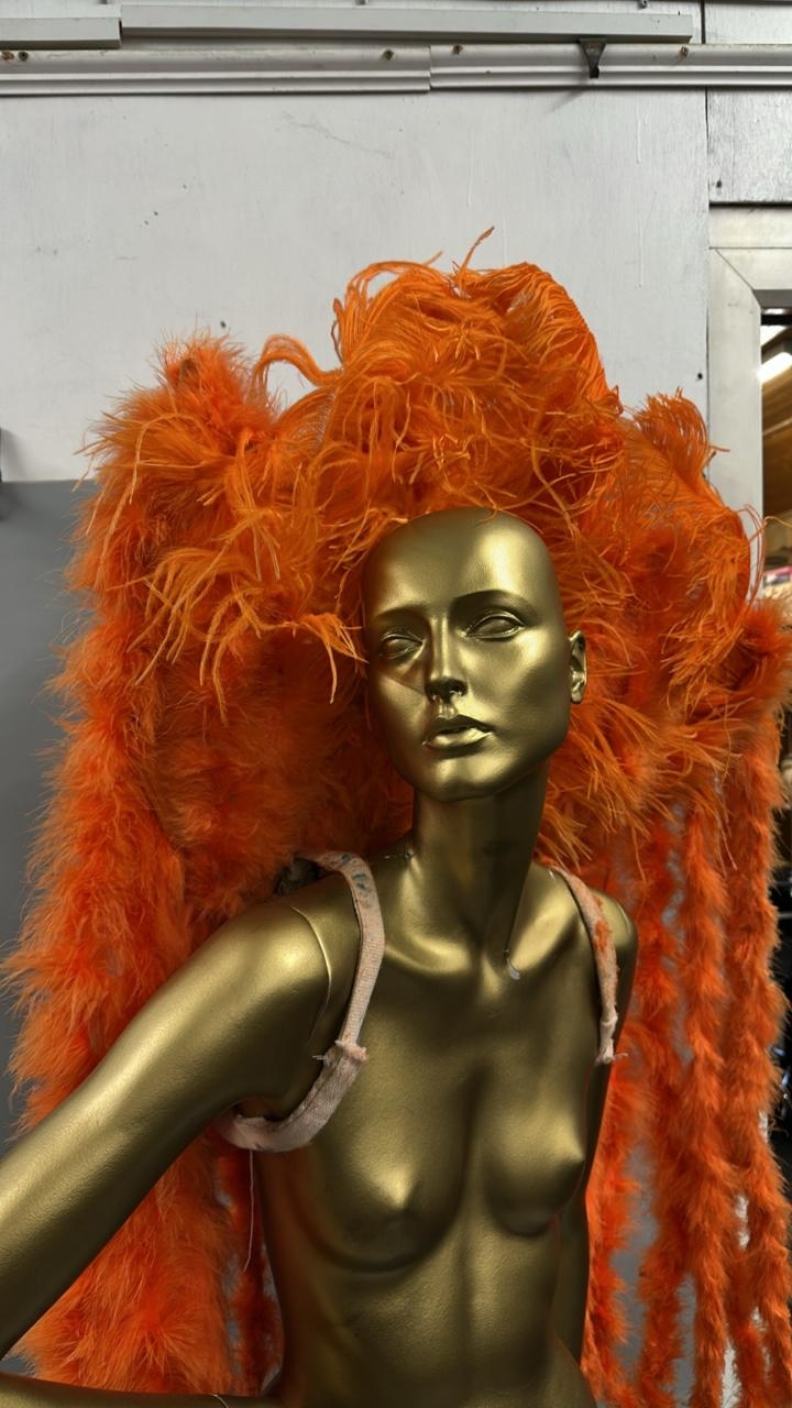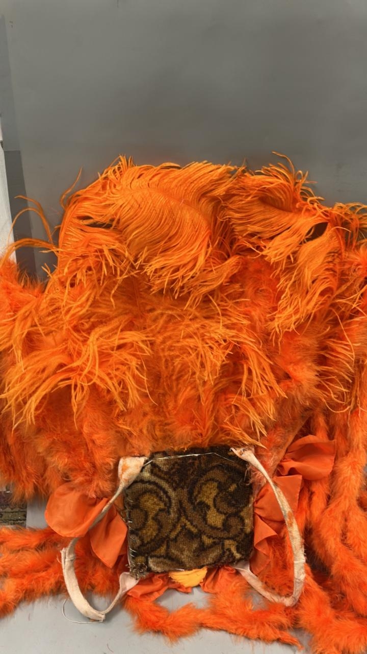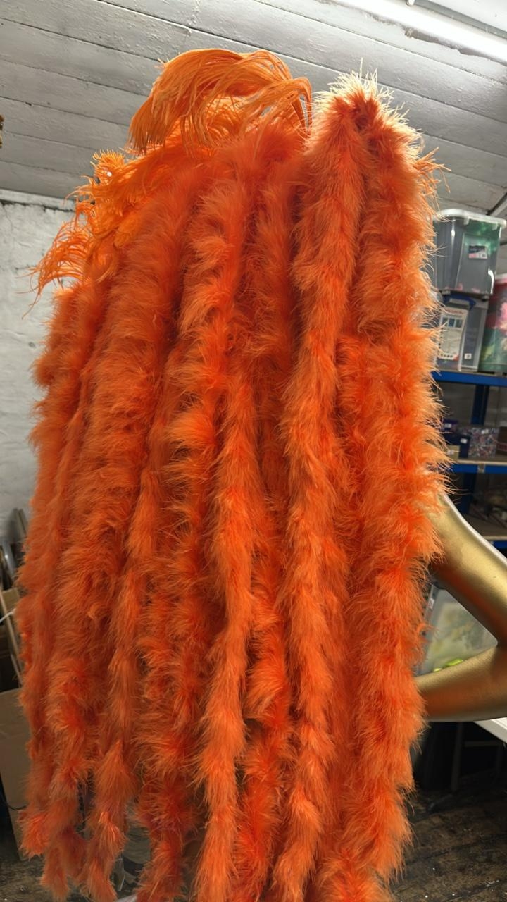 Three stage used showgirl orange feather back pieces / Rail 4