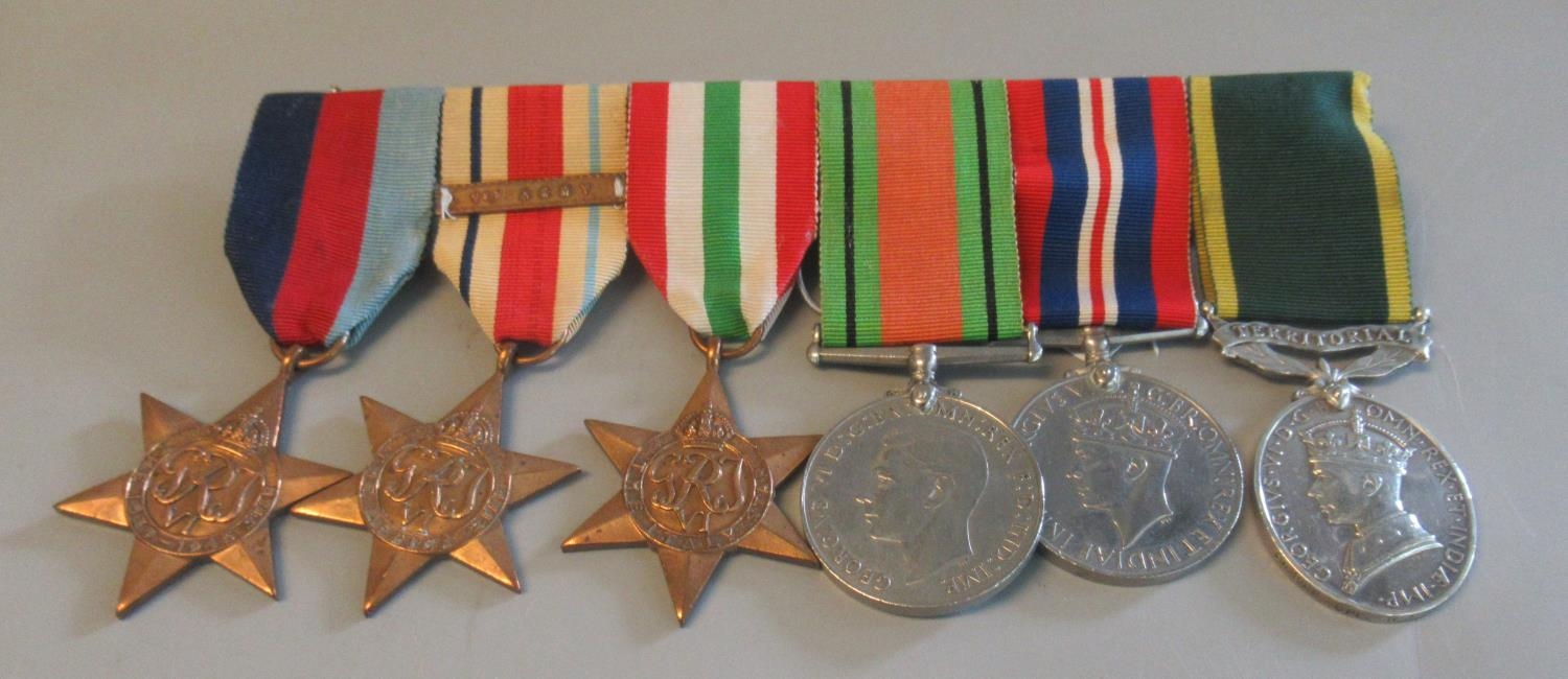 WWII Medal Group to include 1939-45 Star, Africa Star, Italy Star, War Medal, Defence Medal and Territorial For Efficient Service Medal. Named 3691568 Corporal H J Ding REME (6)