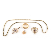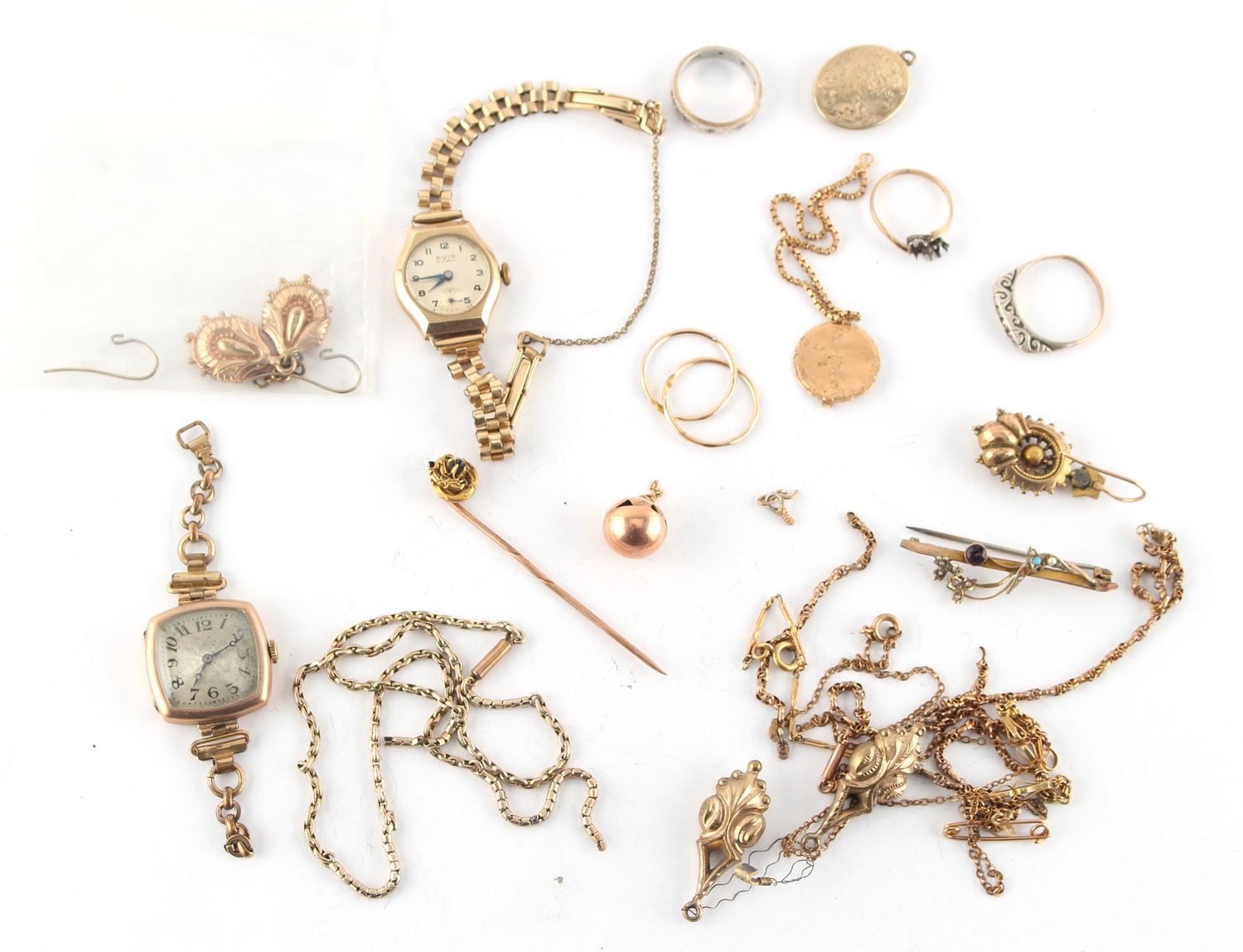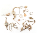 Property of a lady - a bag containing two gold cased watches and assorted gold & yellow metal jewellery & scrap jewellery including including pairs or earrings & rings (a lot).