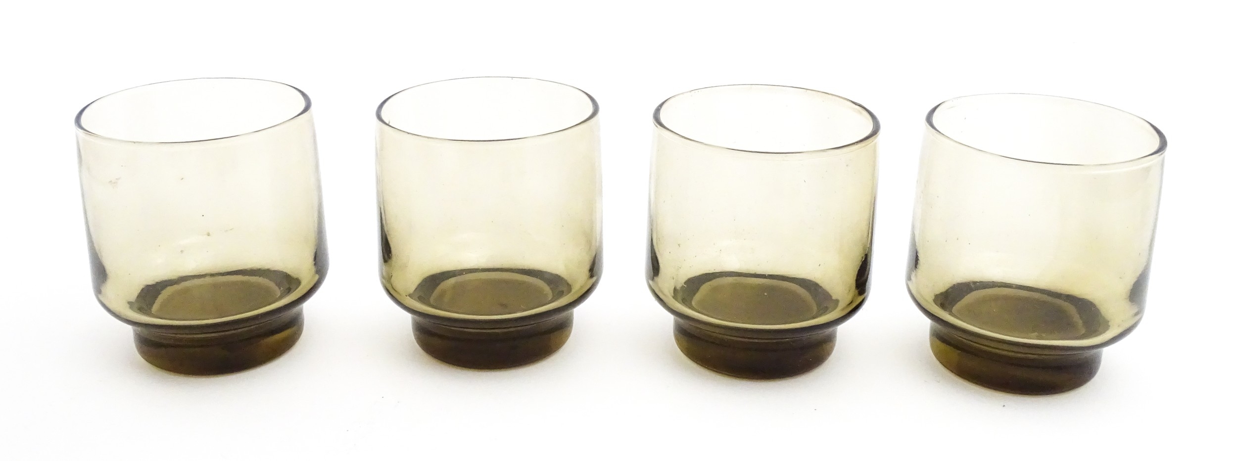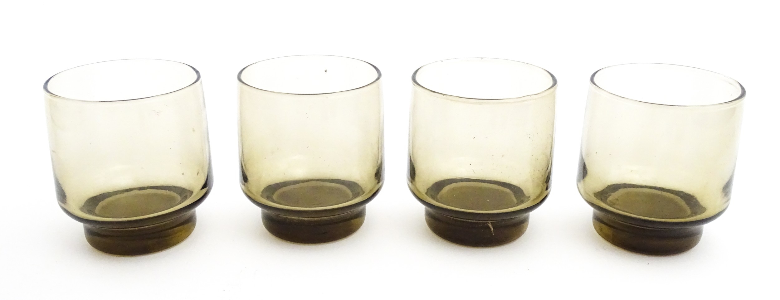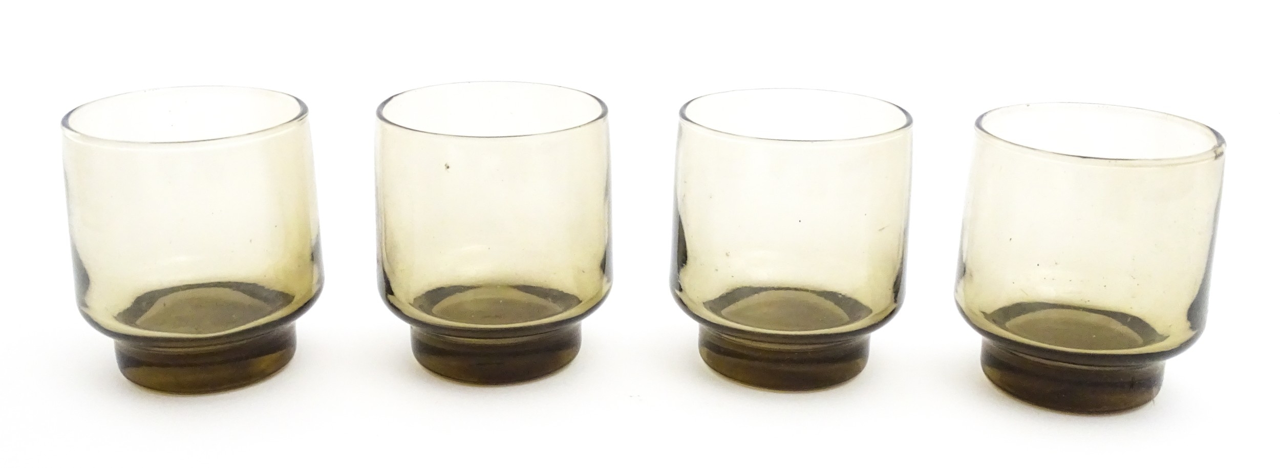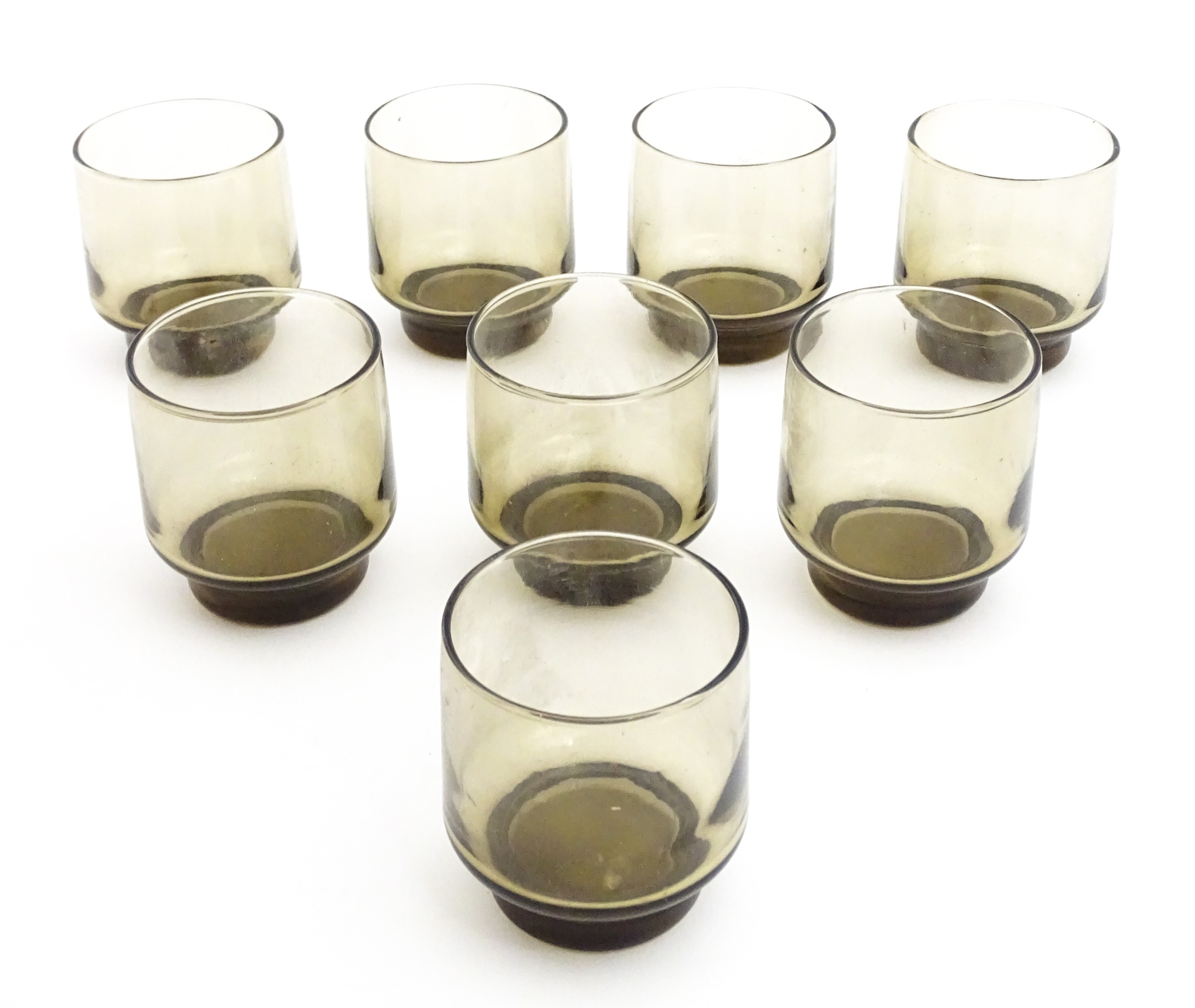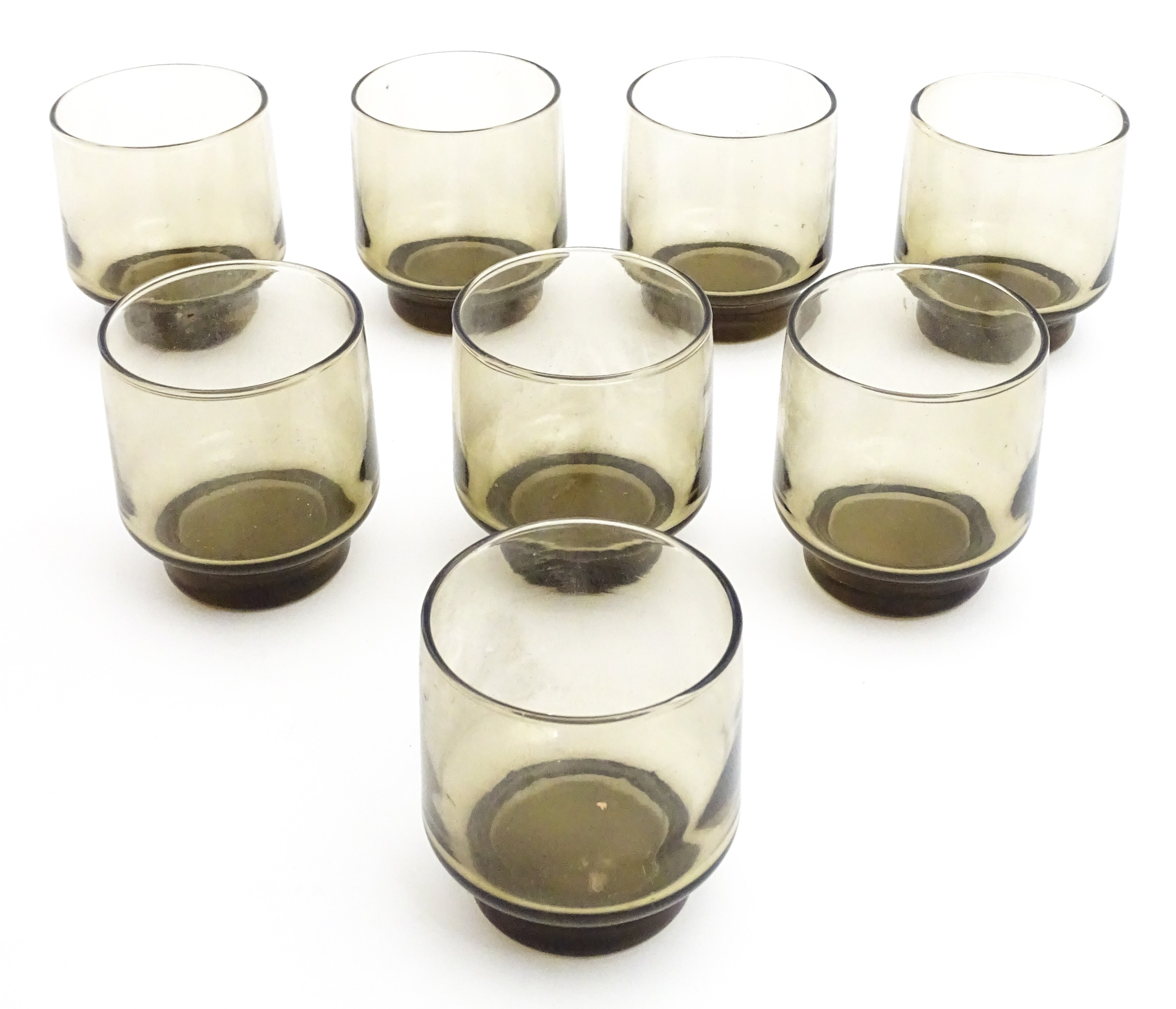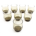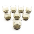 A set of eight retro glass drinking glasses. Approx 3 1/2" high (8)