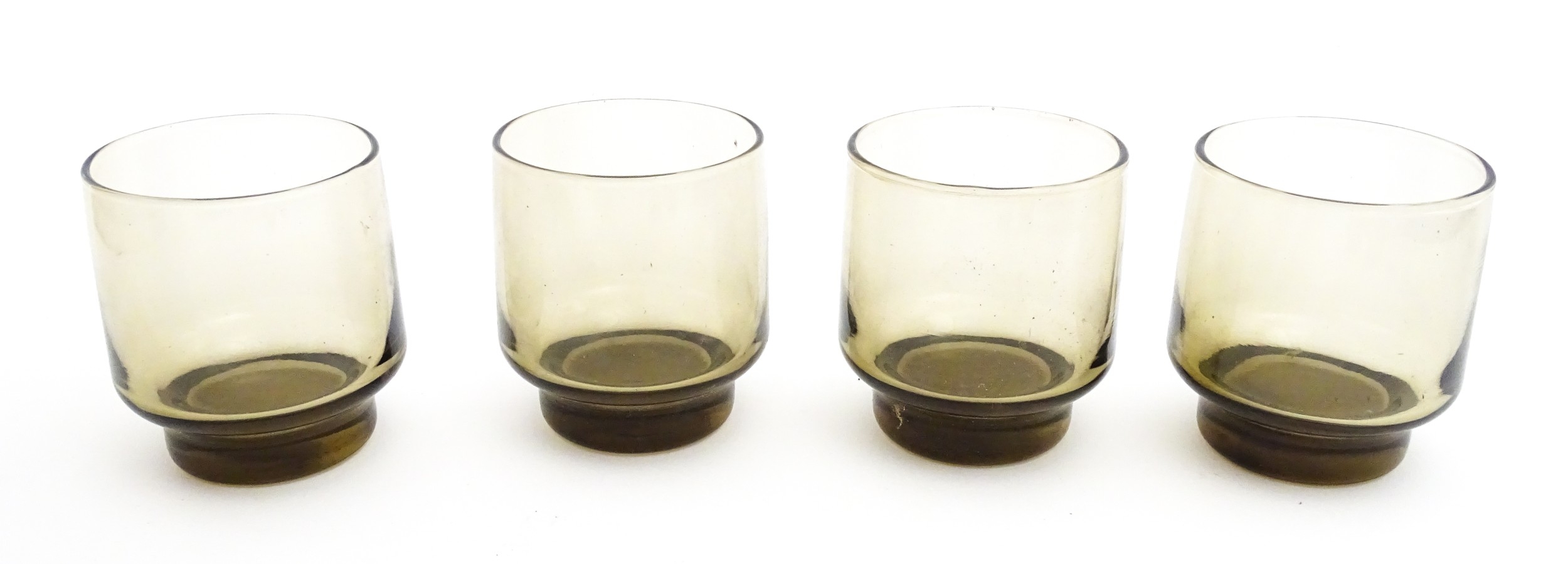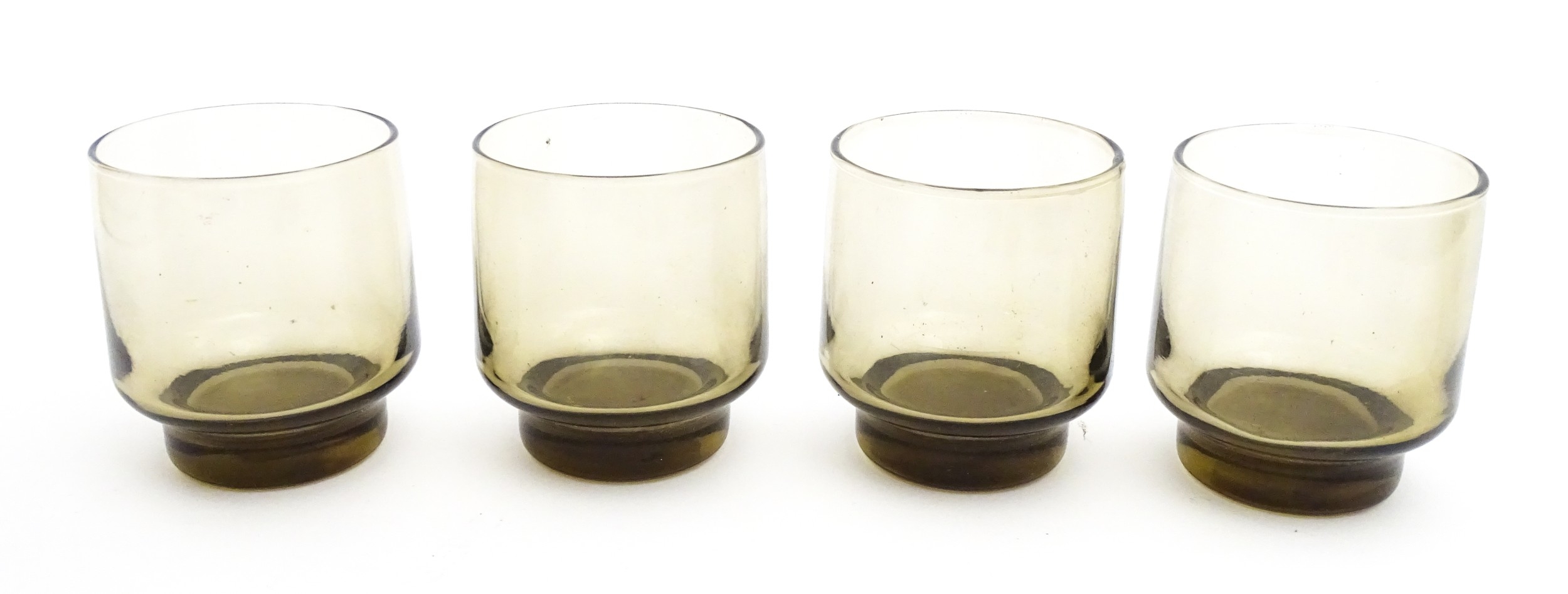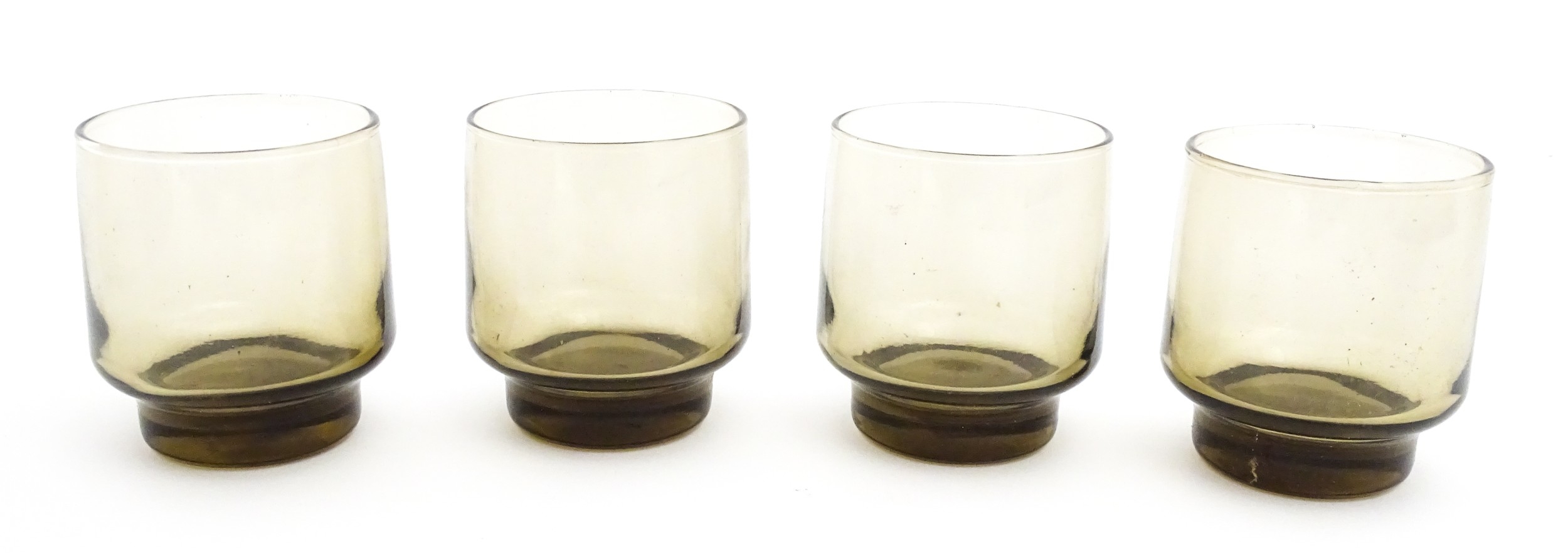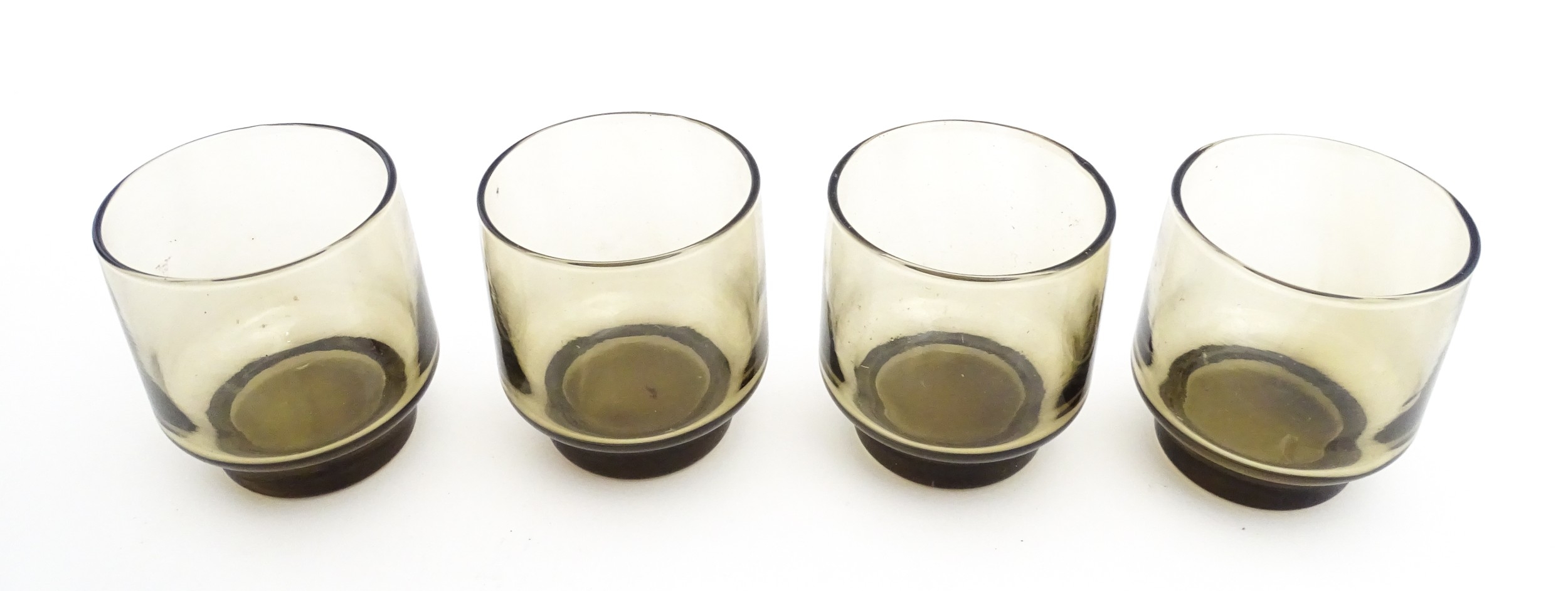 A set of eight retro glass drinking glasses. Approx 3 1/2" high (8)