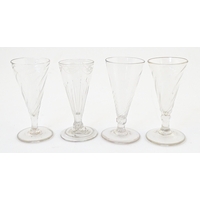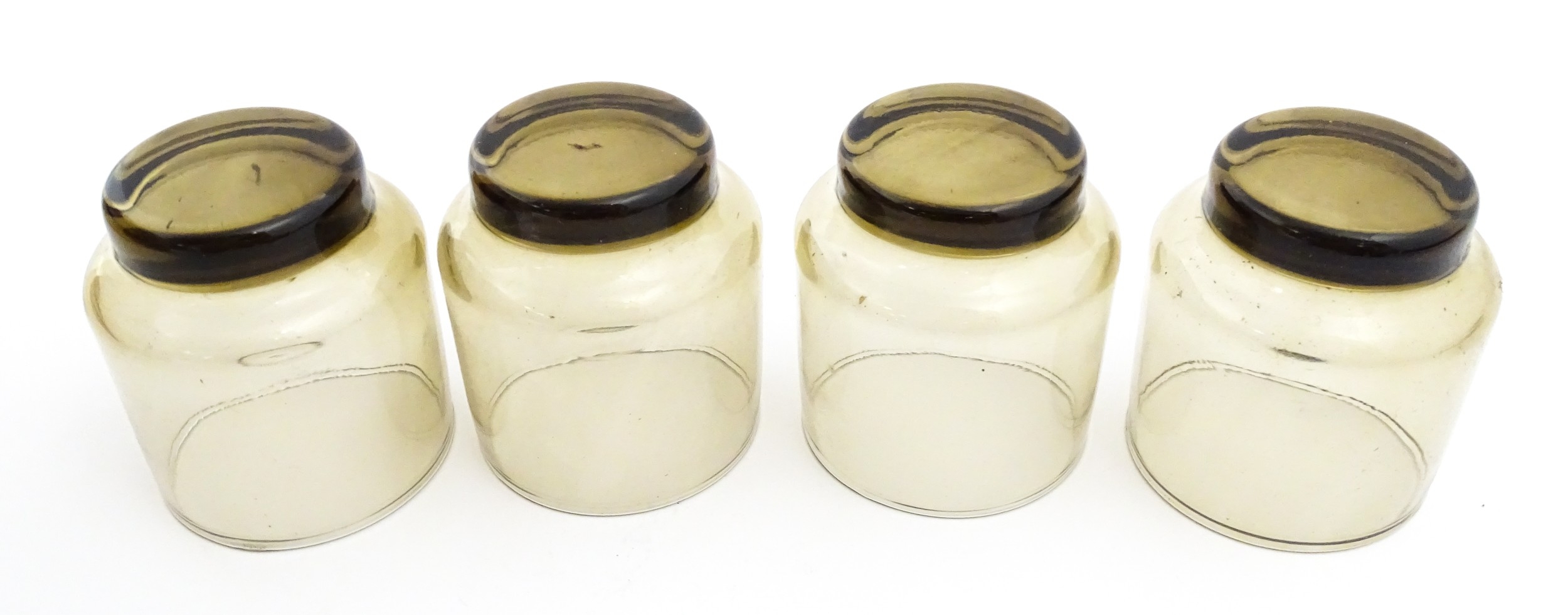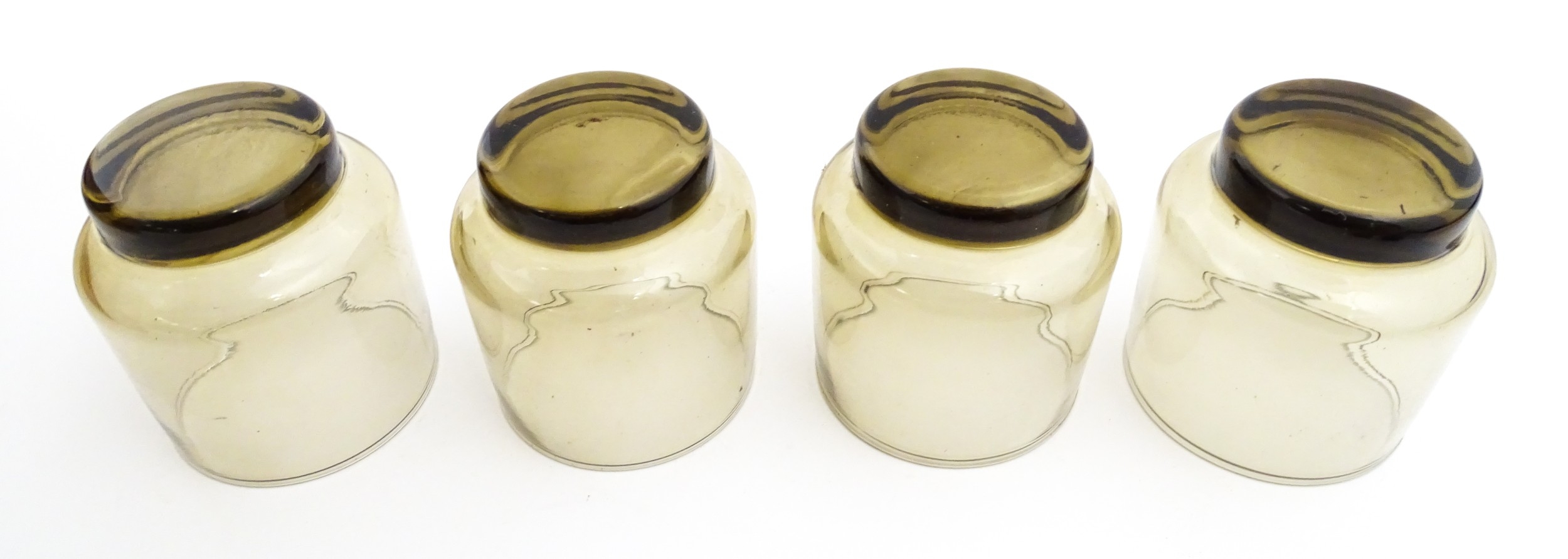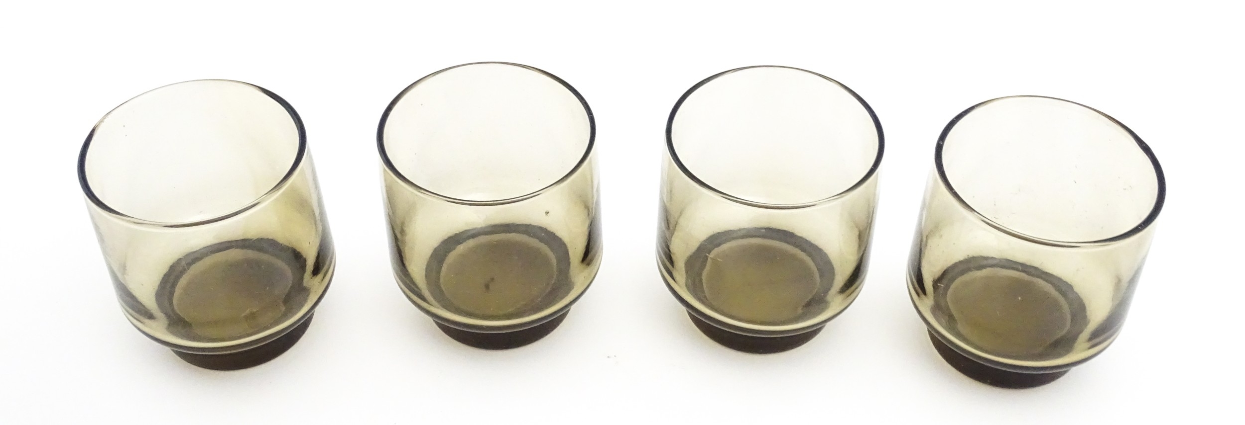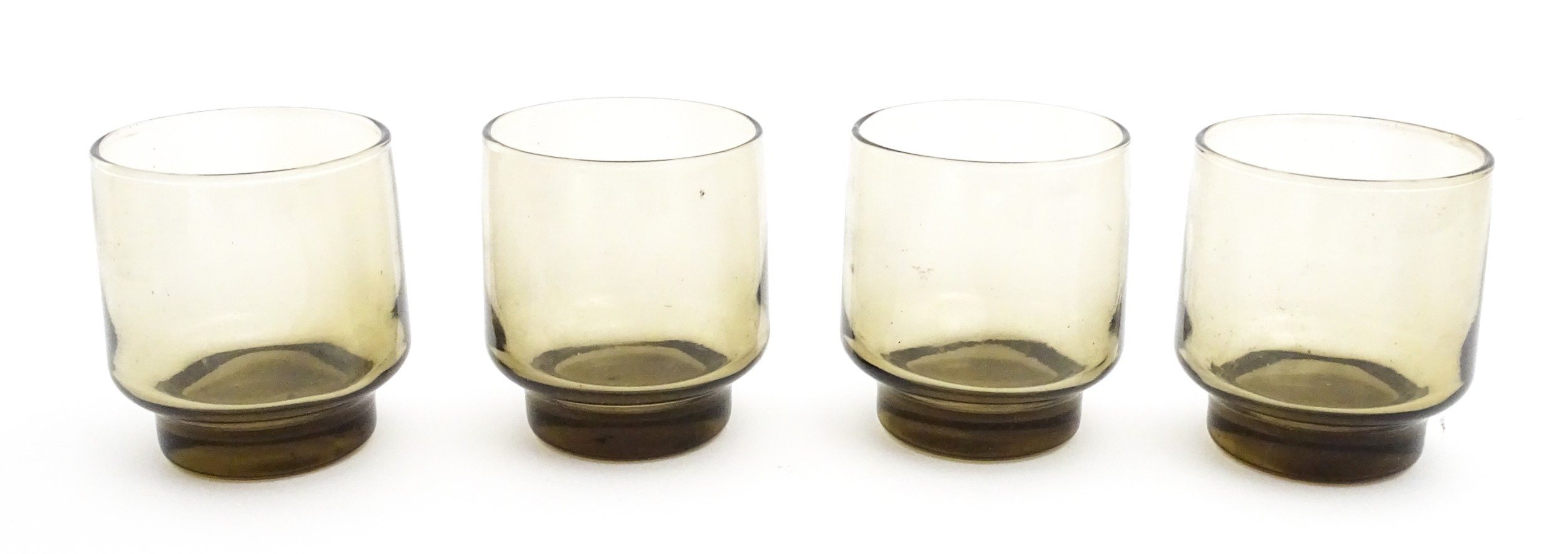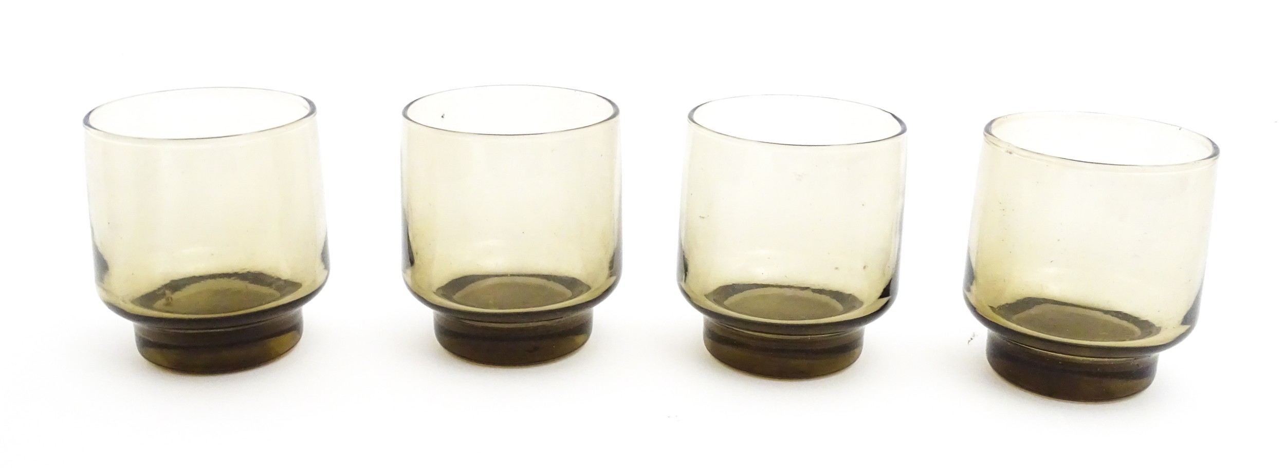 A set of eight retro glass drinking glasses. Approx 3 1/2" high (8)