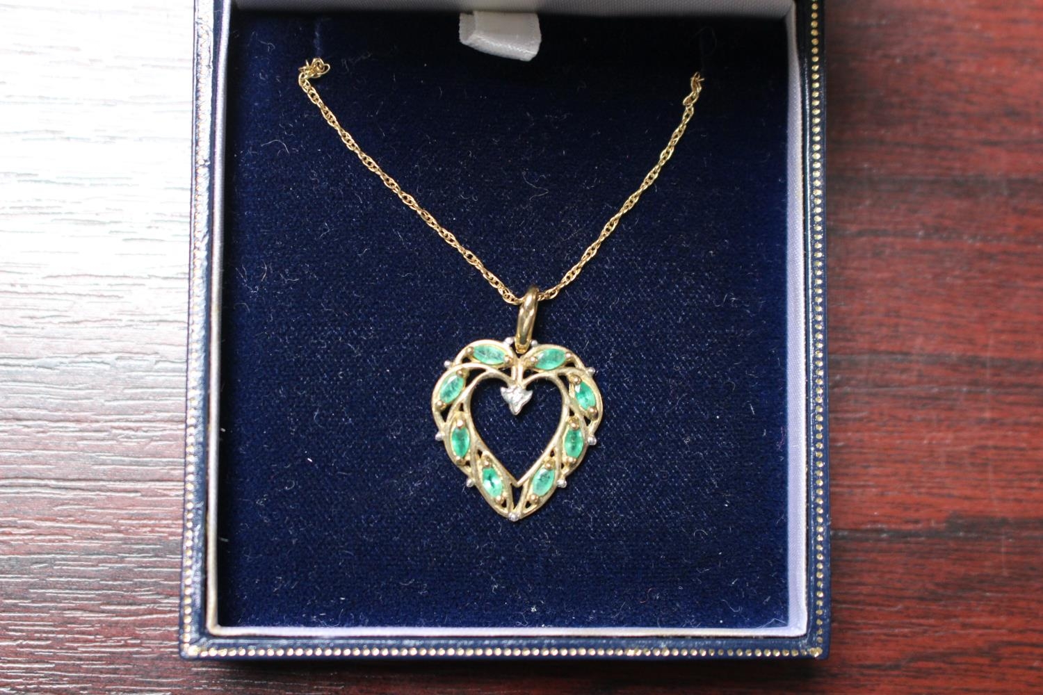 Ladies 9ct Gold Emerald and Diamond Set Heart shaped pendant on chain 2.5g total weight