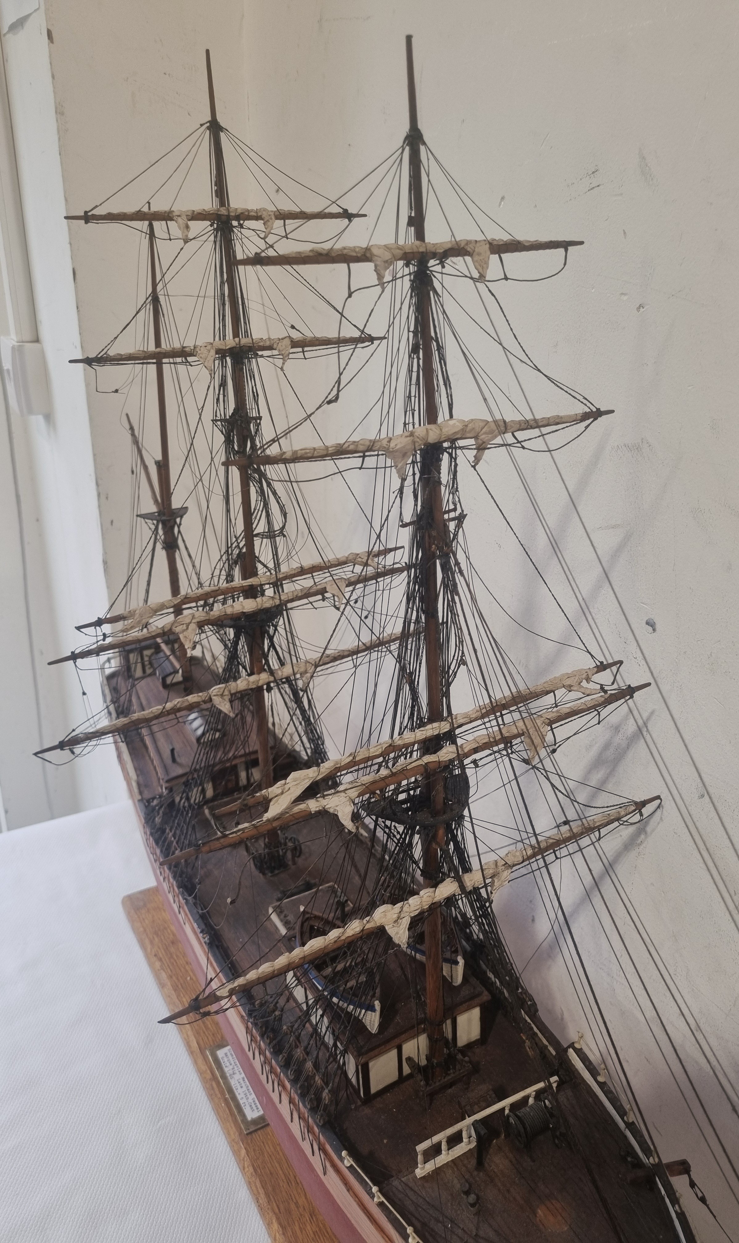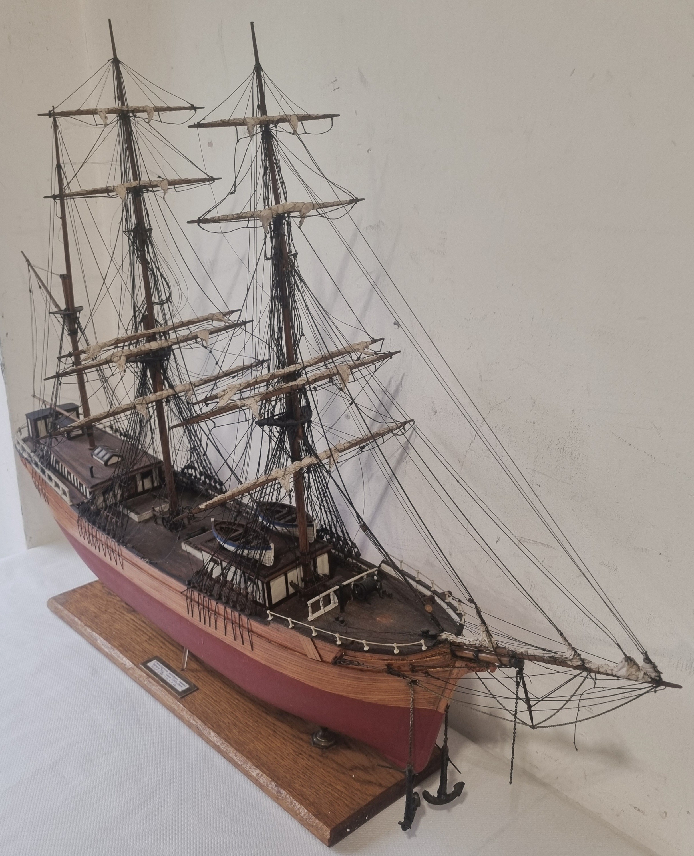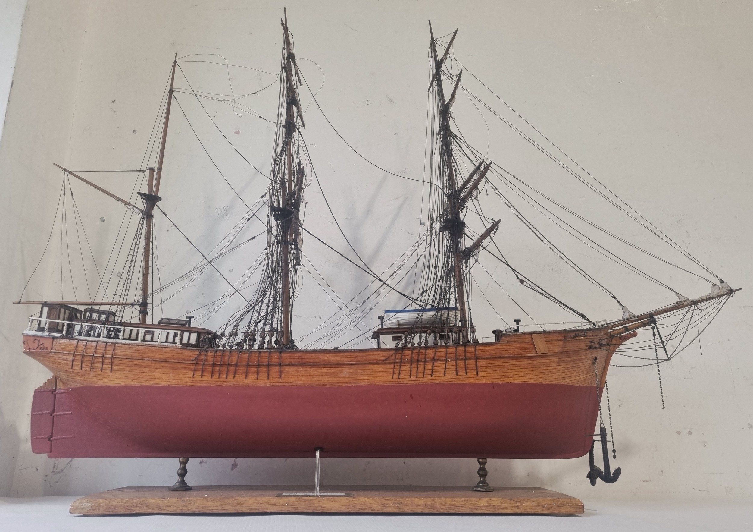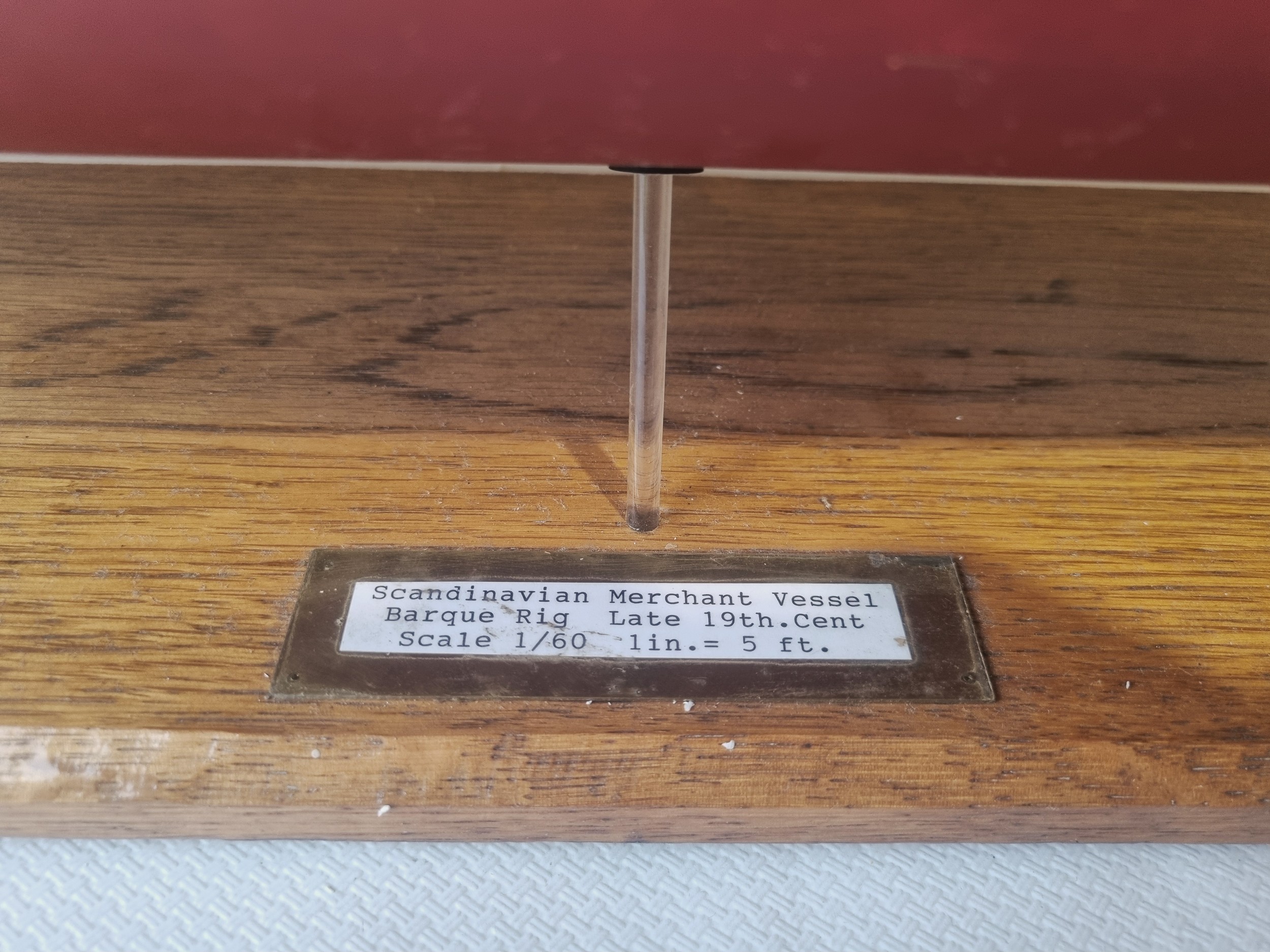 A hand built 1:60 scale wooden model of a 19th century barque rig Scandinavian Merchant vessel on wood stand 106cm L x 78cm H. No Shipping. Arrange collection or your own packer and shipper, please.