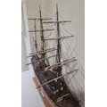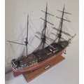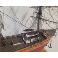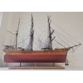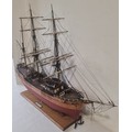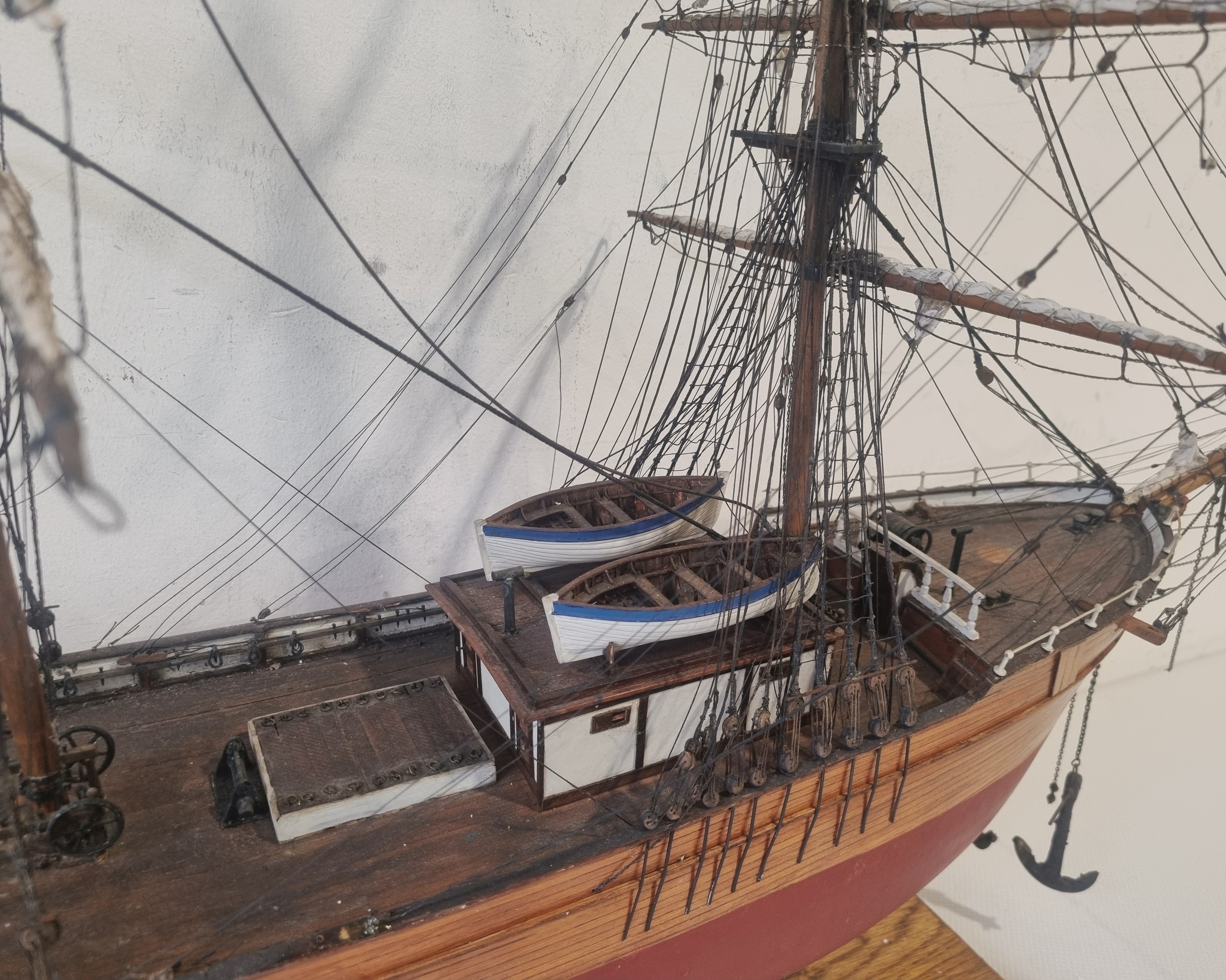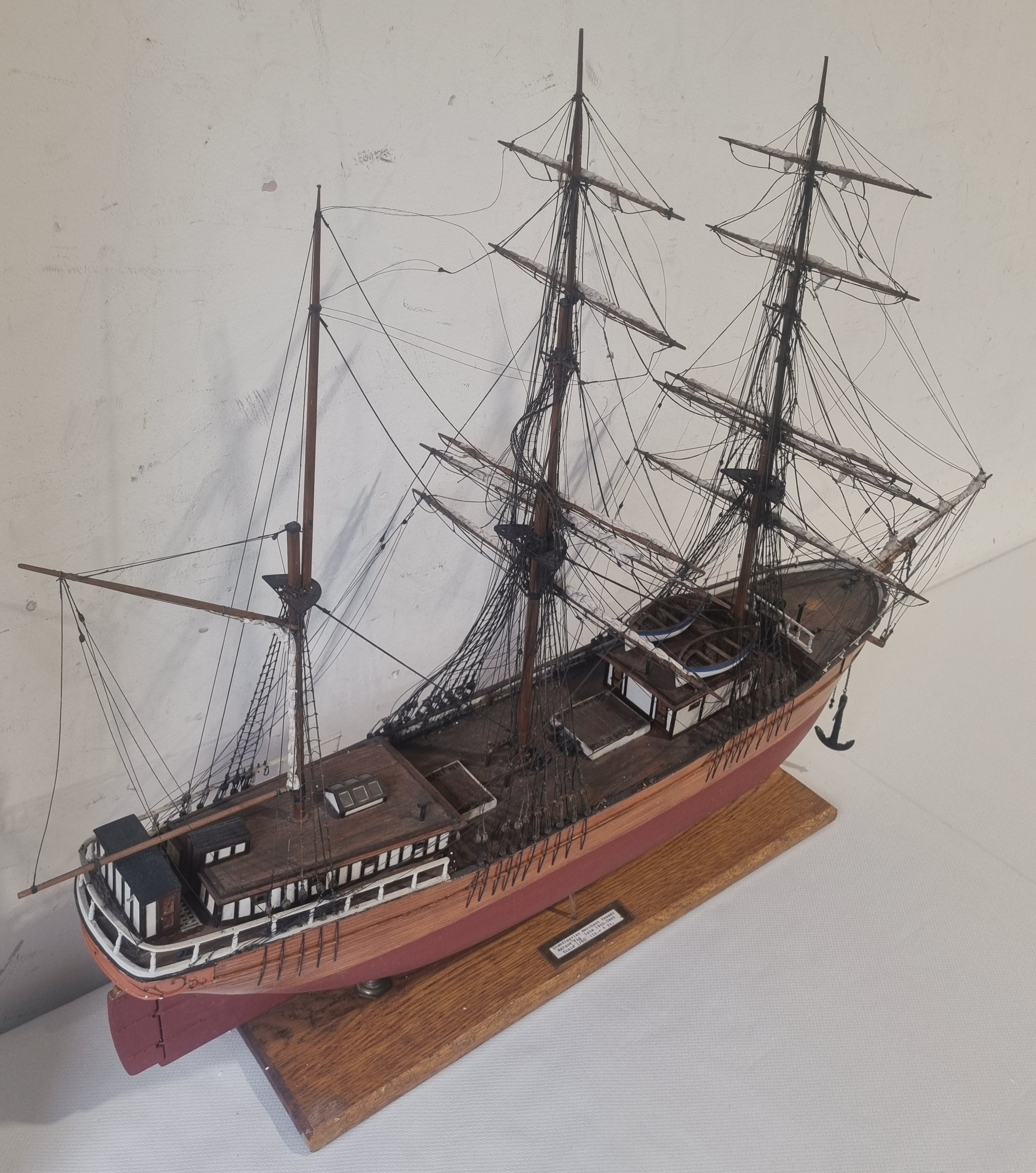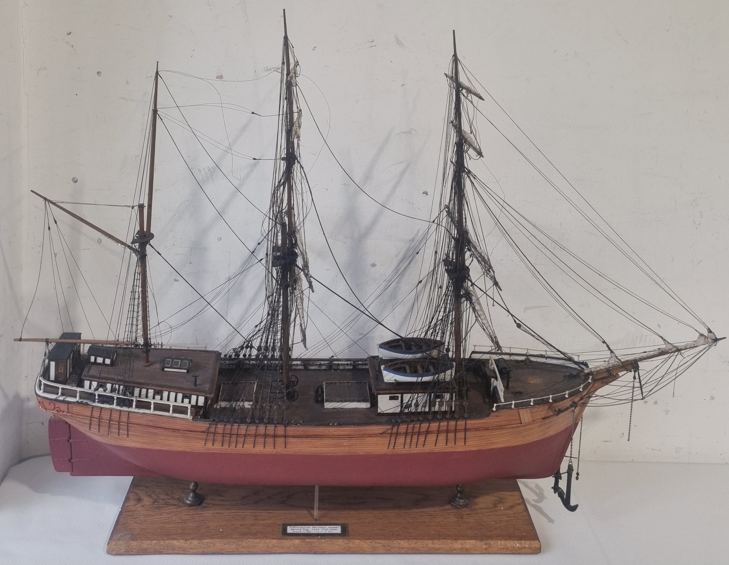 A hand built 1:60 scale wooden model of a 19th century barque rig Scandinavian Merchant vessel on wood stand 106cm L x 78cm H. No Shipping. Arrange collection or your own packer and shipper, please.