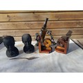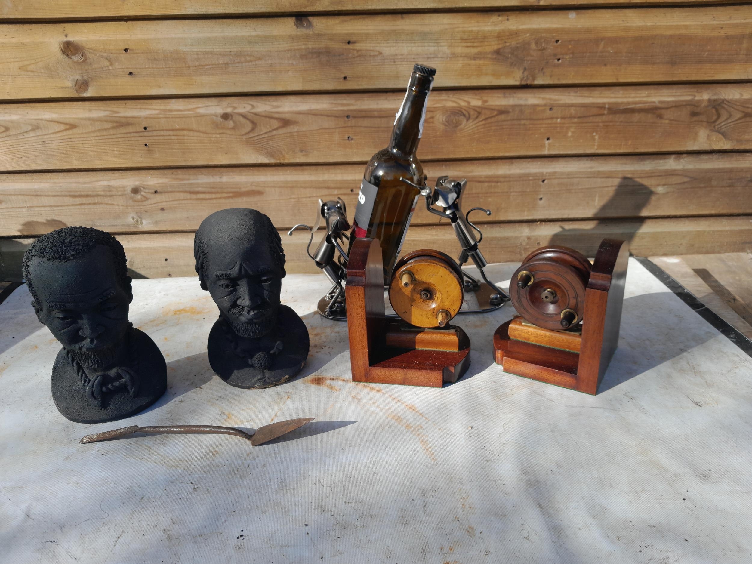Vintage fishing reel bookends, pair of African pottery busts and bottle holder