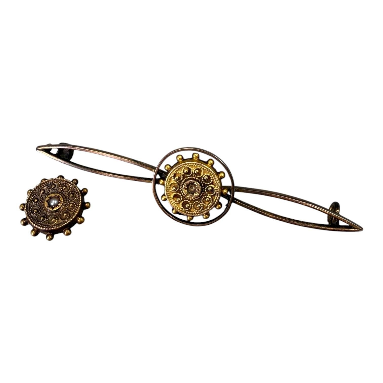 Hallmarked Birmingham, 1889, converted ends of stickpins rope and bead decoration, mounted on a later 9ct gold bar mount.