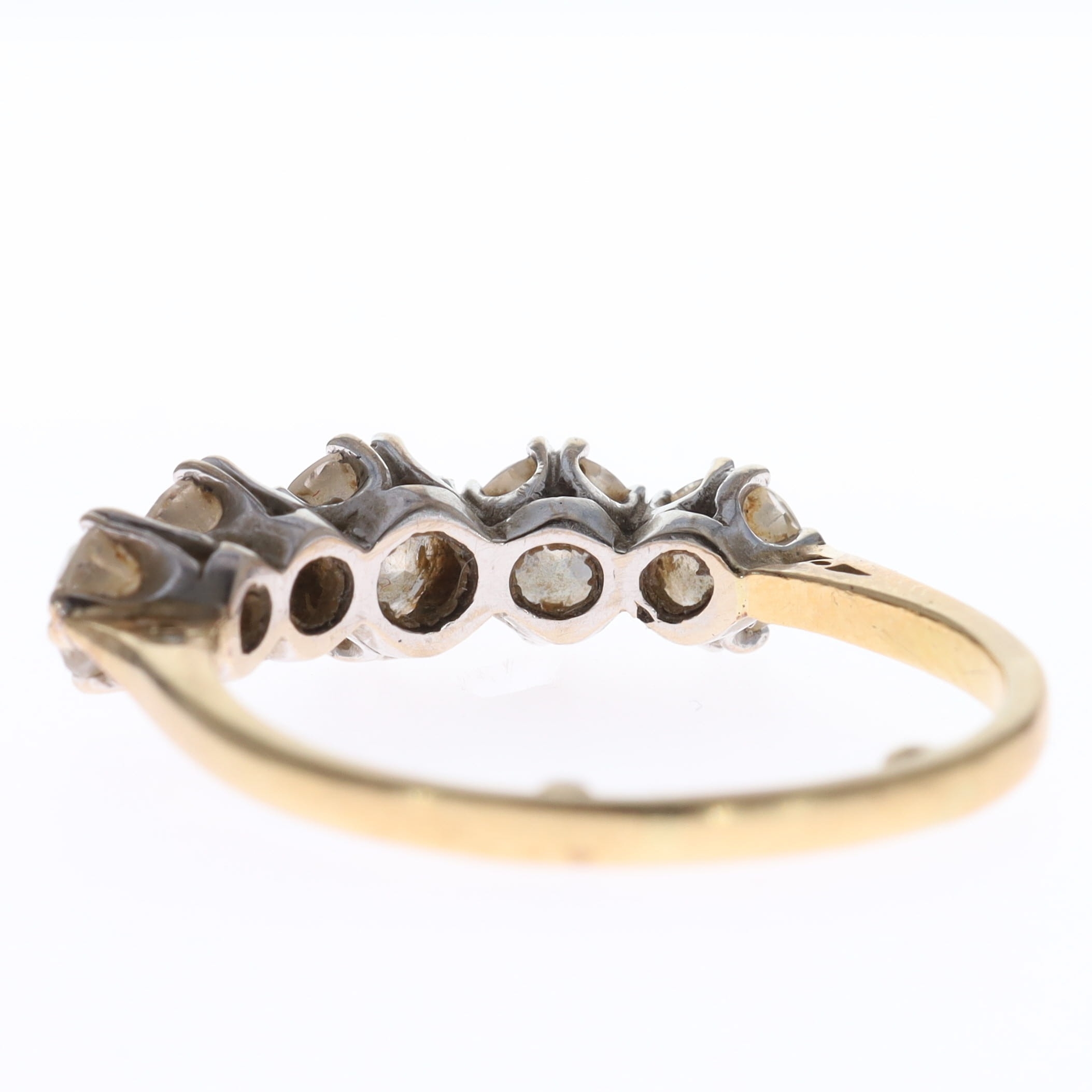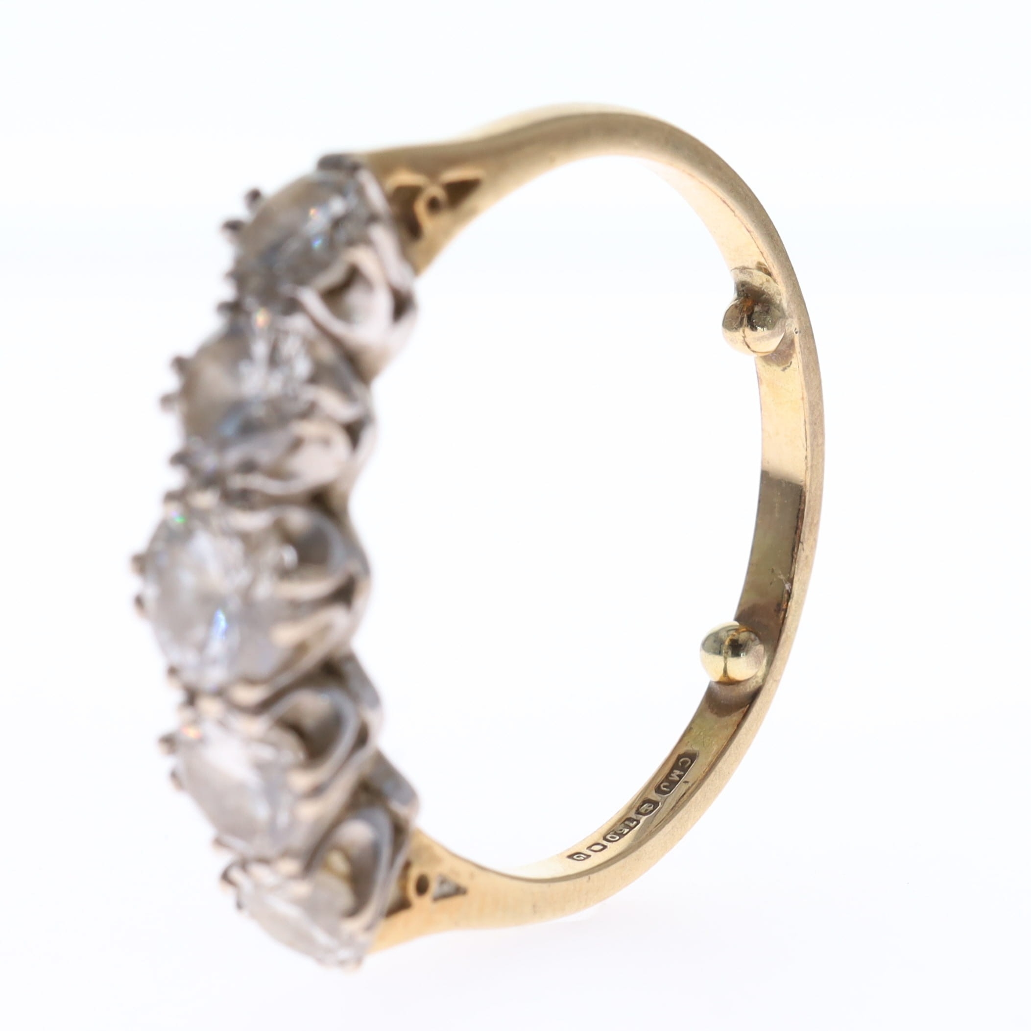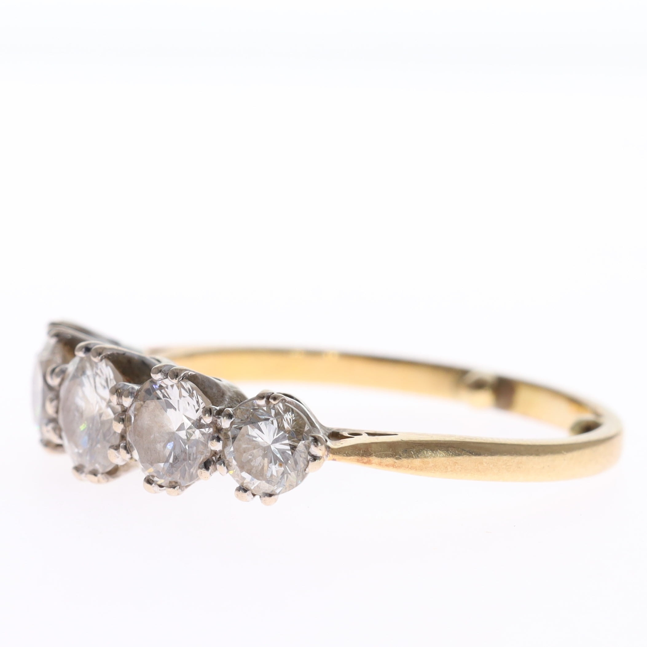 Diamond Five Stone 18ct Gold Ring. Estimated 1.6ct total diamond weight. The ring is stamped 750 on the inner band. UK ring size R. Resizing points have been added by a previous owner meaning the original size is unknown. Weighs in total 3.6g.
