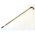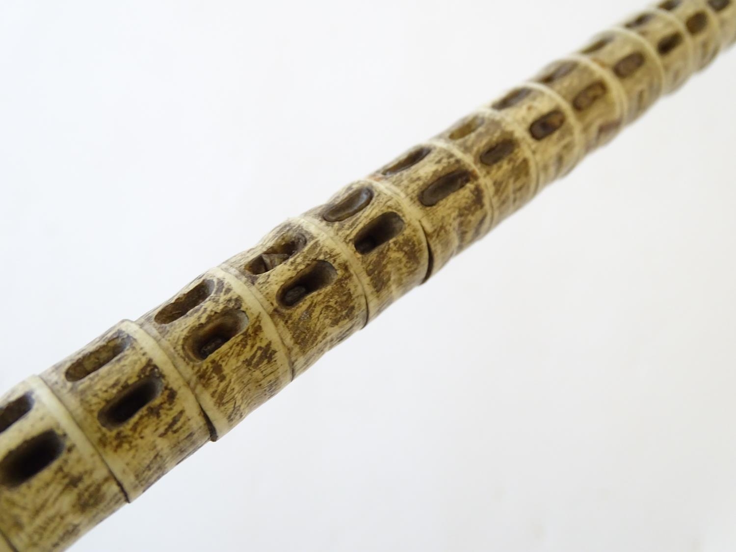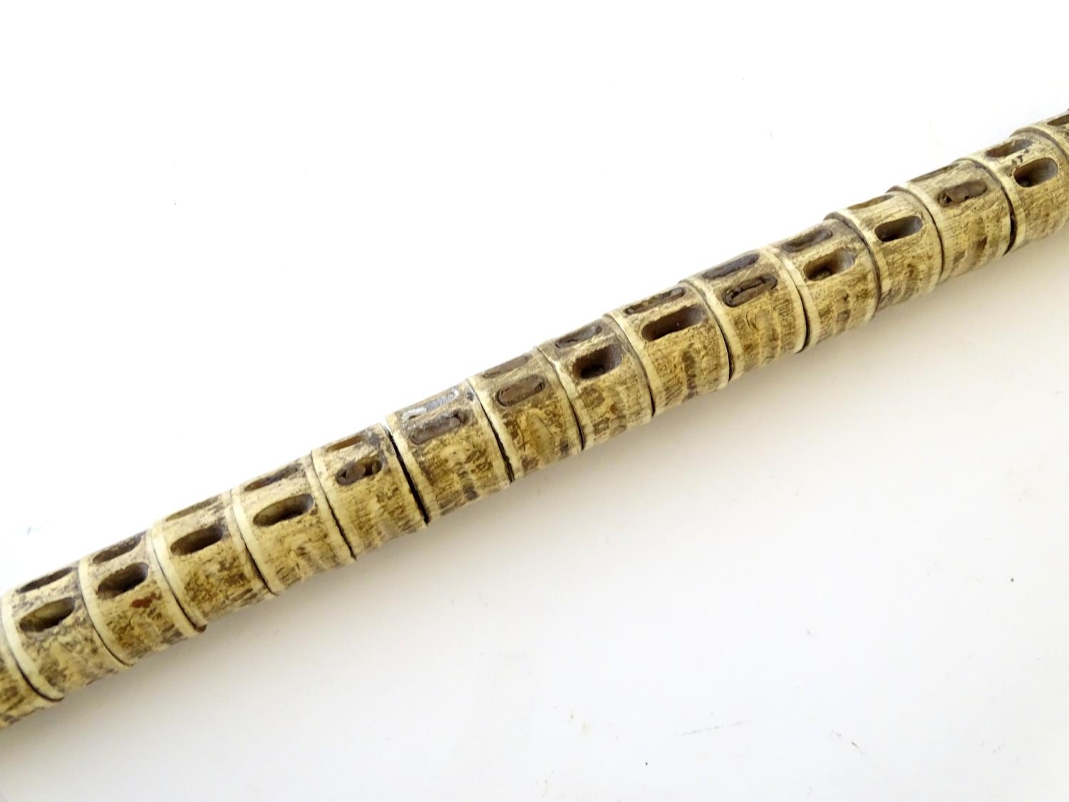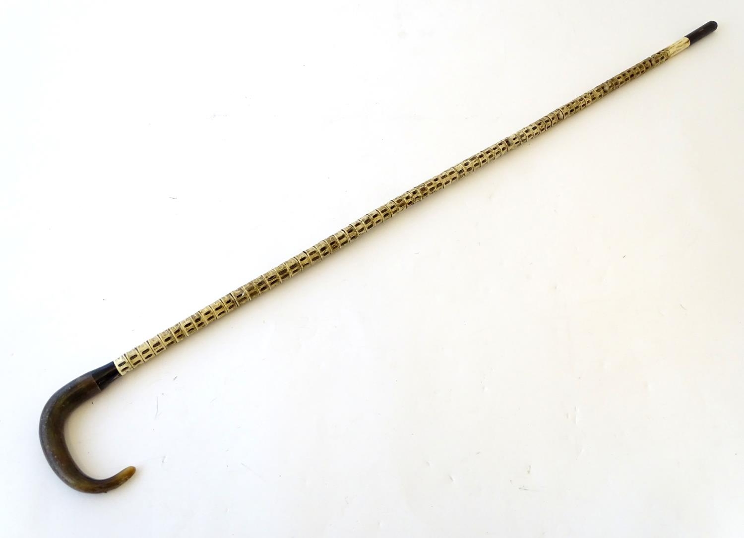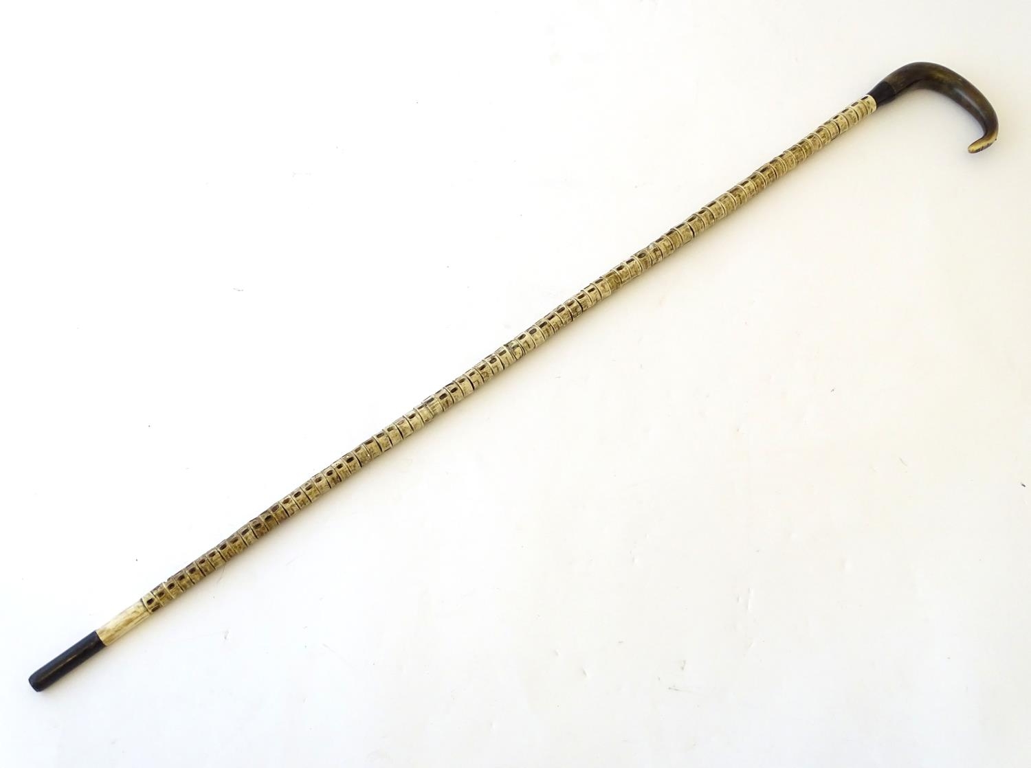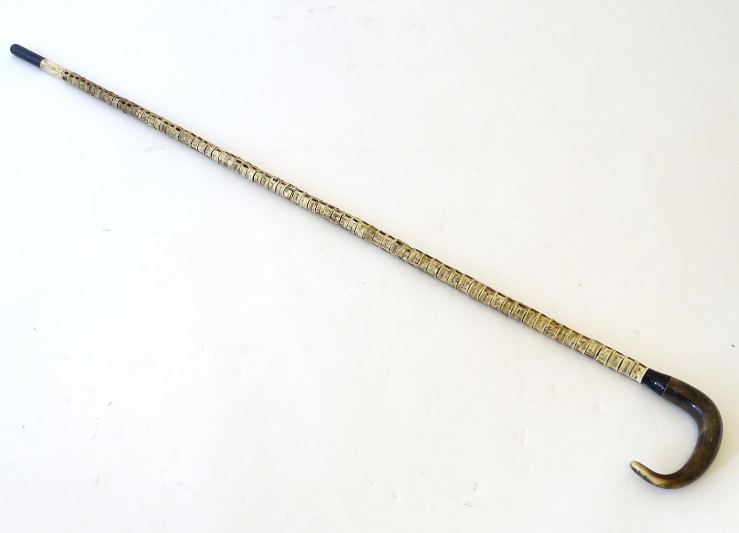 Taxidermy: a 19thC walking cane, mounted with shark vertebrae, with ebony and bone ferrule, buffalo horn collar and ram's horn handle. 33 1/2" long