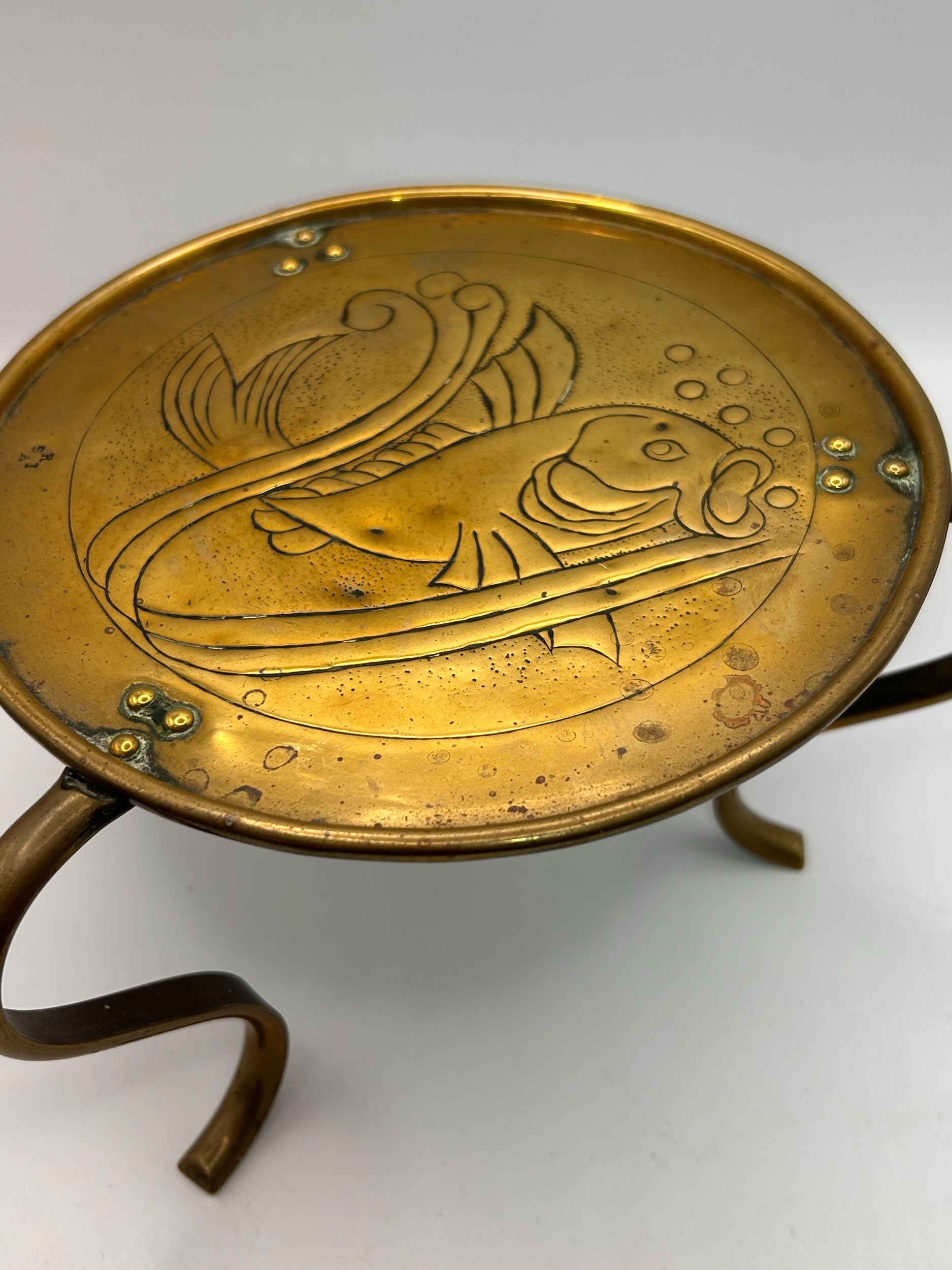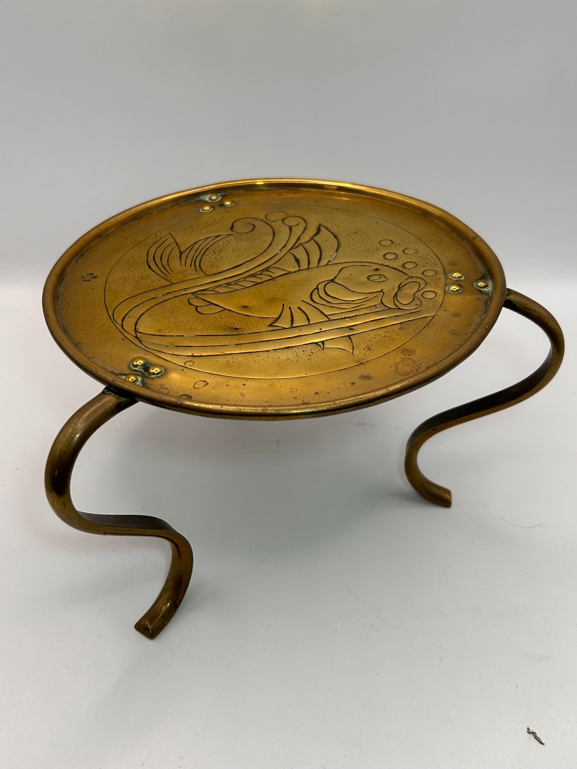 A single stand constructed of brass, likely serving as a trivet or a base for a small table gong, consistent with the Art Nouveau or Arts and Crafts periods. The circular top features an etched or engraved design depicting a stylized fish swimming amidst flowing aquatic elements and bubbles. The round plate is supported by three separate, scrolling legs, which are attached beneath the rim using small brass rivets. The object exhibits a faint stamped inscription near the edge of the central design field reading S & A I.