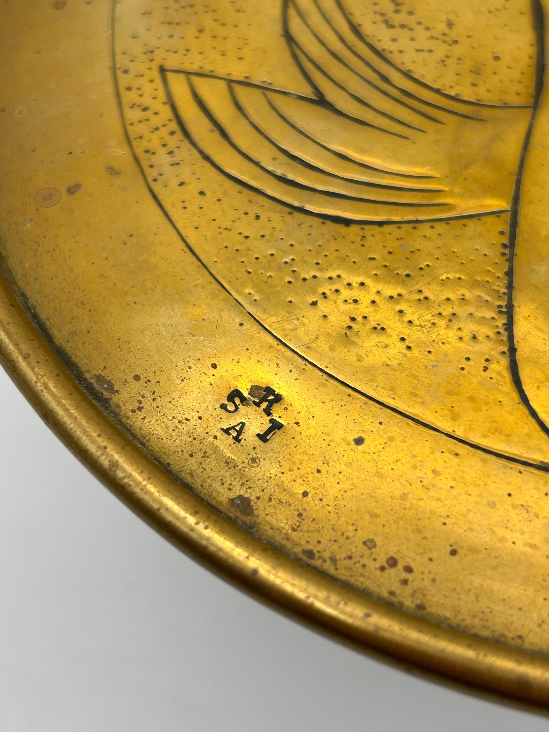 Art Nouveau Brass Gong Stand or Trivet with Etched Fish Design