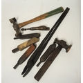 Small collection of various cobbler's hammers and hand tools, together with a pair of ironmonger's tongs
