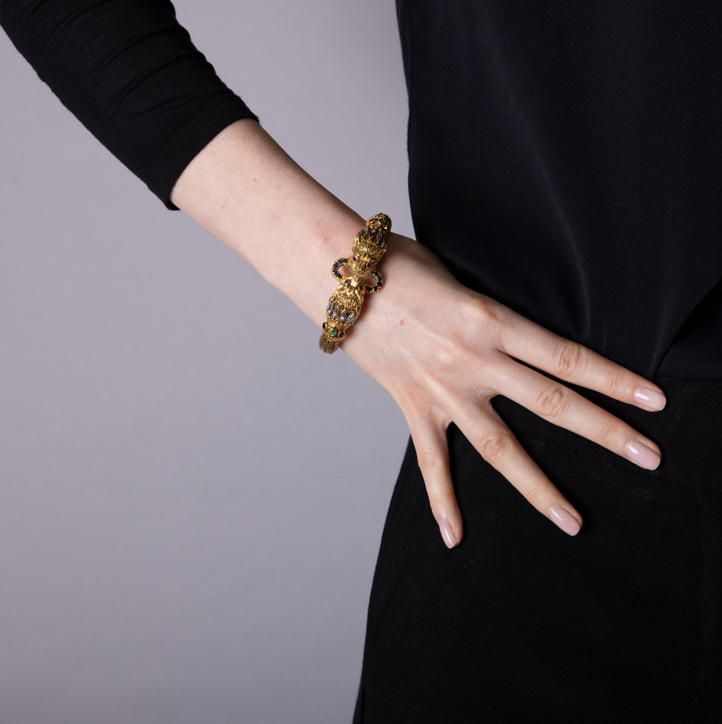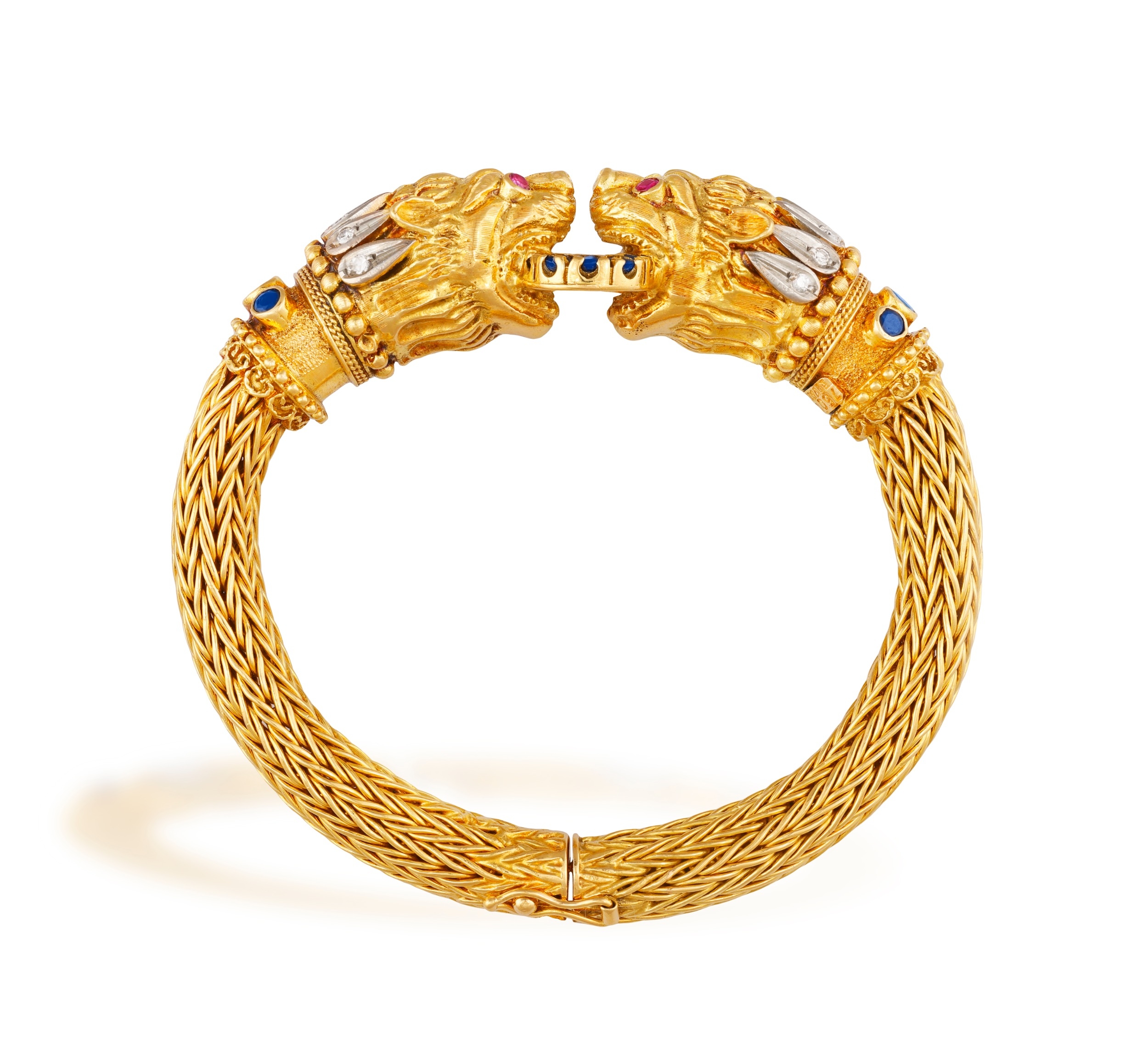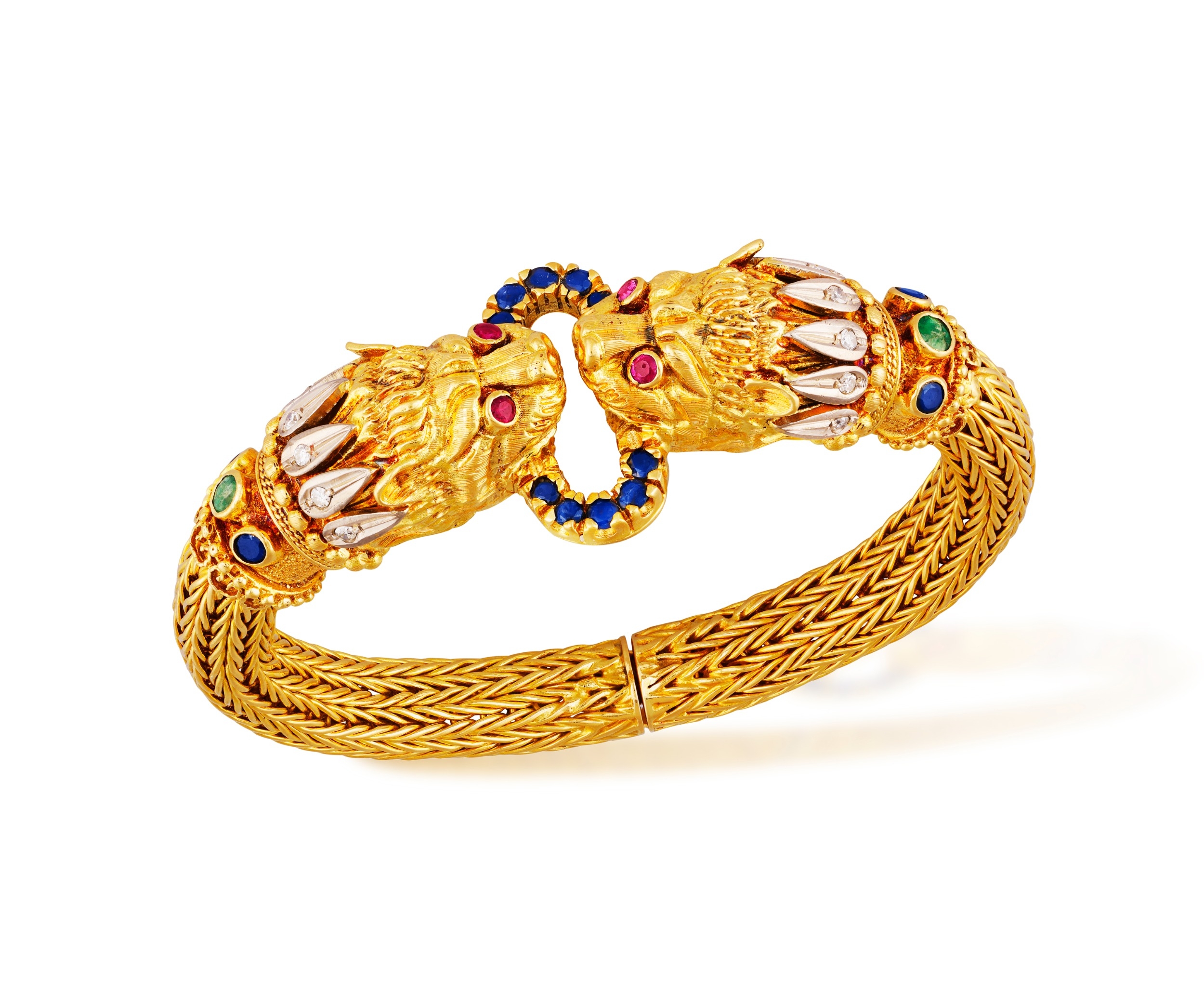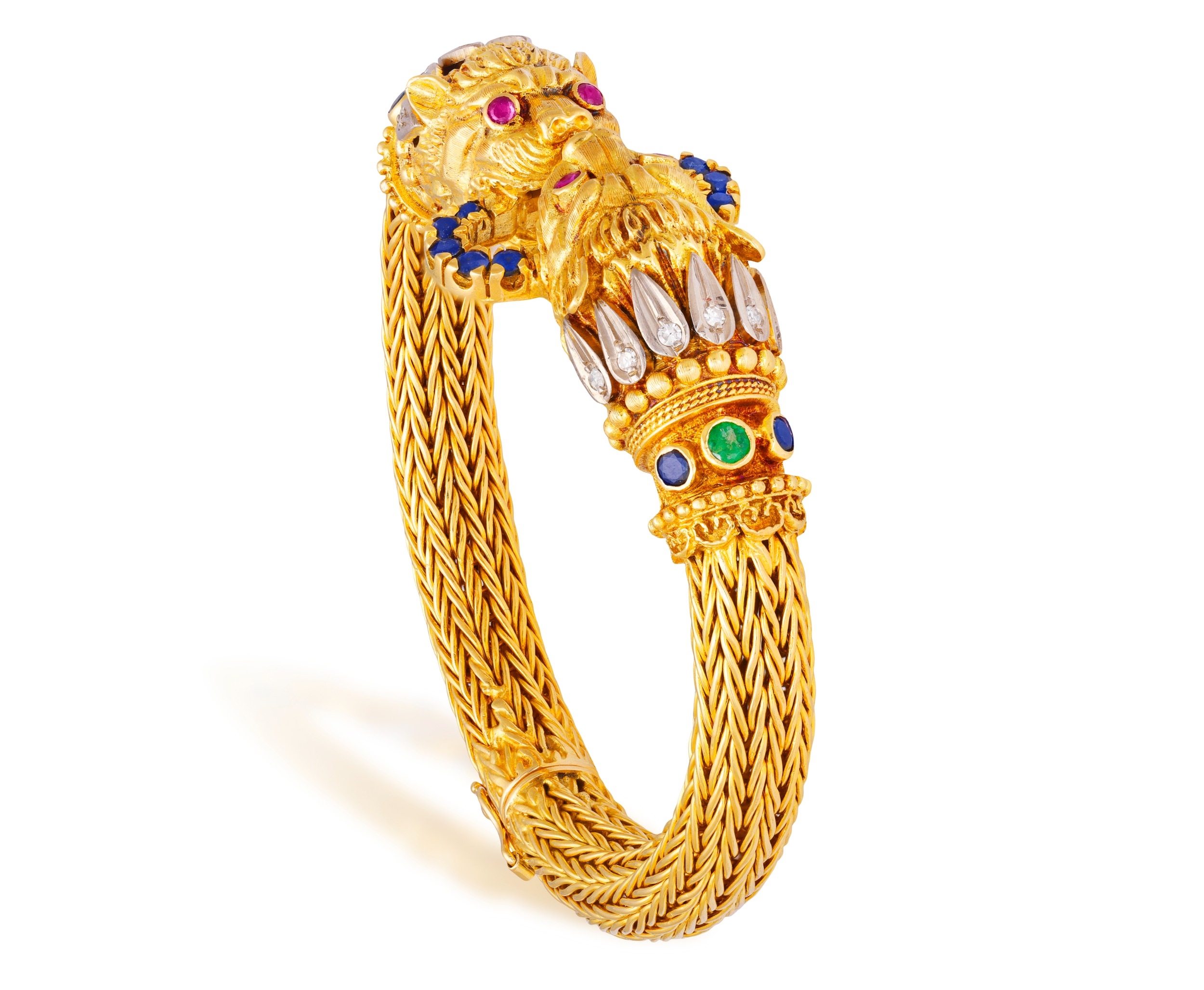 LALAOUNIS: A GOLD AND GEM-SET BANGLE Of woven foxtail linking, terminating in lion's head motifs at the centre, with engraved detail, beaded and ropetwist decoration, accented with single-cut diamonds, circular-cut emeralds, sapphires and rubies, mounted in 18K gold, signed Lalaounis, numbered A.21, with maker's mark, inner length approximately 17cm, inner diameter 5.7cm Ilias Lalaounis (1920–2013) was among the most original jewellers of the twentieth century, who transformed the buried forms of antiquity into jewels of striking, wearable modernity. Born in Athens into a family of goldsmiths with roots in Delphi, he came of age within the celebrated Zolotas firm before establishing his own house and, in time, becoming the only jeweller ever elected to the Académie des Beaux-Arts of the Institut de France. His Archaeological Collection of 1957 announced the terms of his ambition: that ancient Greek ornament, Mycenaean, Minoan, Hellenistic, could be not reproduced but genuinely reimagined. Granulation, filigree, hand-hammering and woven gold were treated not as historical curiosities but as living techniques, applied with sculptural confidence and a sure sense of presence. The results carried the gravity of the ancient world without its weight. What brought the house its international reach was the social world that gathered around it. Aristotle Onassis was among the first significant patrons, purchasing jewels for Maria Callas and later for Jacqueline Kennedy: a pair of names that placed Lalaounis simultaneously at the centre of Aegean glamour, operatic legend and American political history. Elizabeth Taylor, Barbra Streisand, Charlize Theron and Scarlett Johansson followed across subsequent decades, each lending the house a different register of cultural authority. In 1976, Empress Farah of Iran commissioned an entire collection inspired by Persian art, displayed at the Imperial Palace in Tehran. His connections extended beyond patronage into creative friendship. When Salvador Dalí became too frail to continue designing the ceremonial swords presented to new members of the Académie des Beaux-Arts, he named Lalaounis to carry on the work; a detail that speaks to the esteem in which he was held among the wider artistic world. His retrospective was staged at the Sorbonne Chapel; his Helen of Troy collection toured the Penn Museum in Philadelphia; in 1992 he designed the Olympic torch. When he formally founded Ilias Lalaounis – Greek Gold S.A. in 1969, the house expanded steadily: Paris near Place Vendôme, then Zurich, Geneva, London, Tokyo and Hong Kong, each opening accompanied by a collection drawn from the local cultural inheritance. He founded the Greek Jewellers' Association and trained hundreds of goldsmiths, shaping the broader language of modern Greek jewellery as much as his own. His legacy found lasting form in the Ilias Lalaounis Jewelry Museum, opened in 1994 at the foot of the Acropolis, housing more than 4,500 pieces alongside a gallery dedicated to his commissions for international figures. The house continues today under the direction of his four daughters.