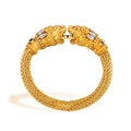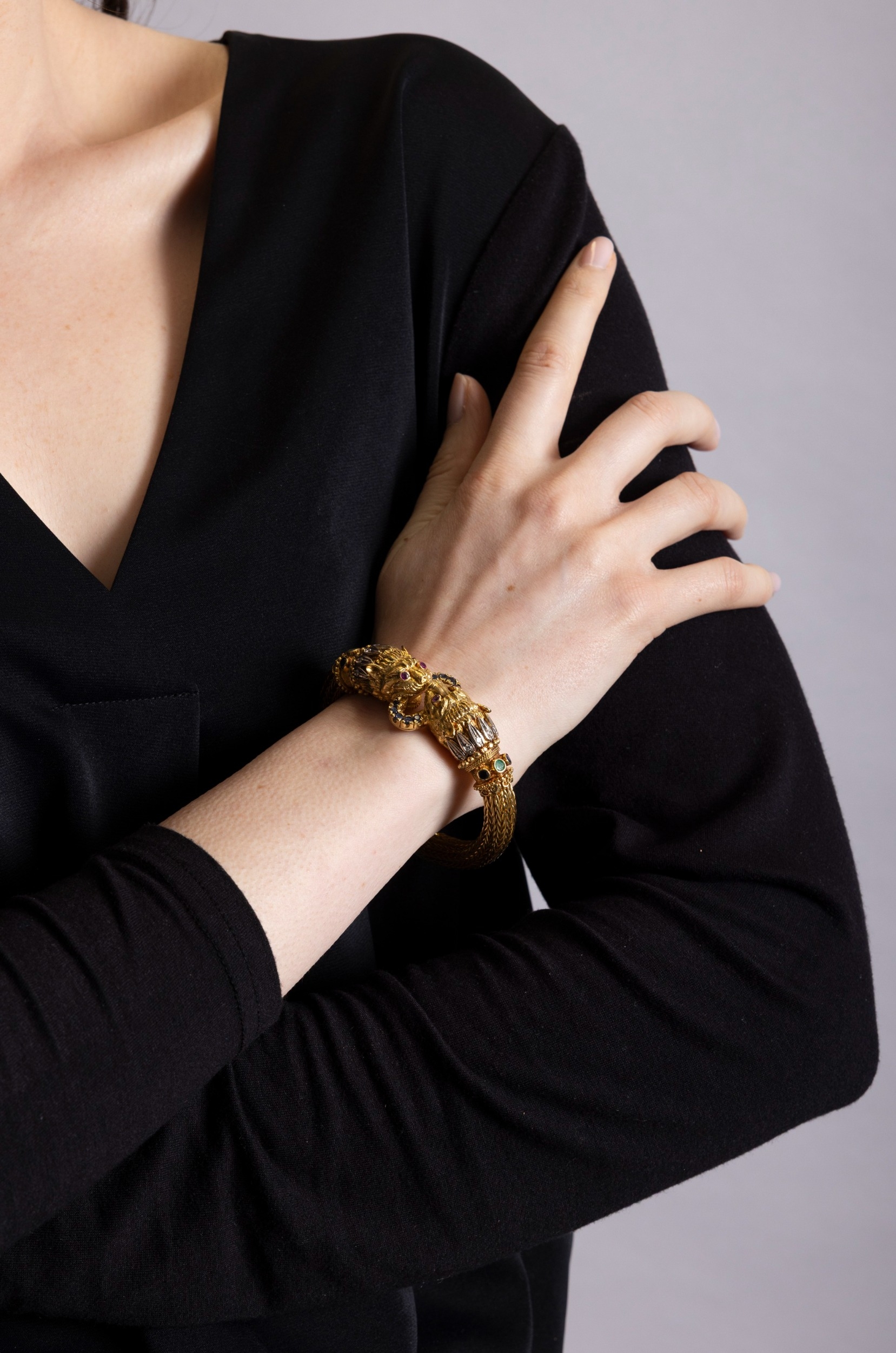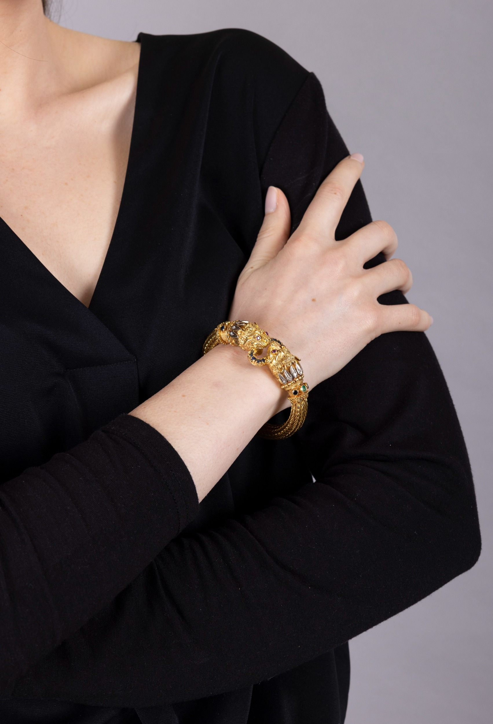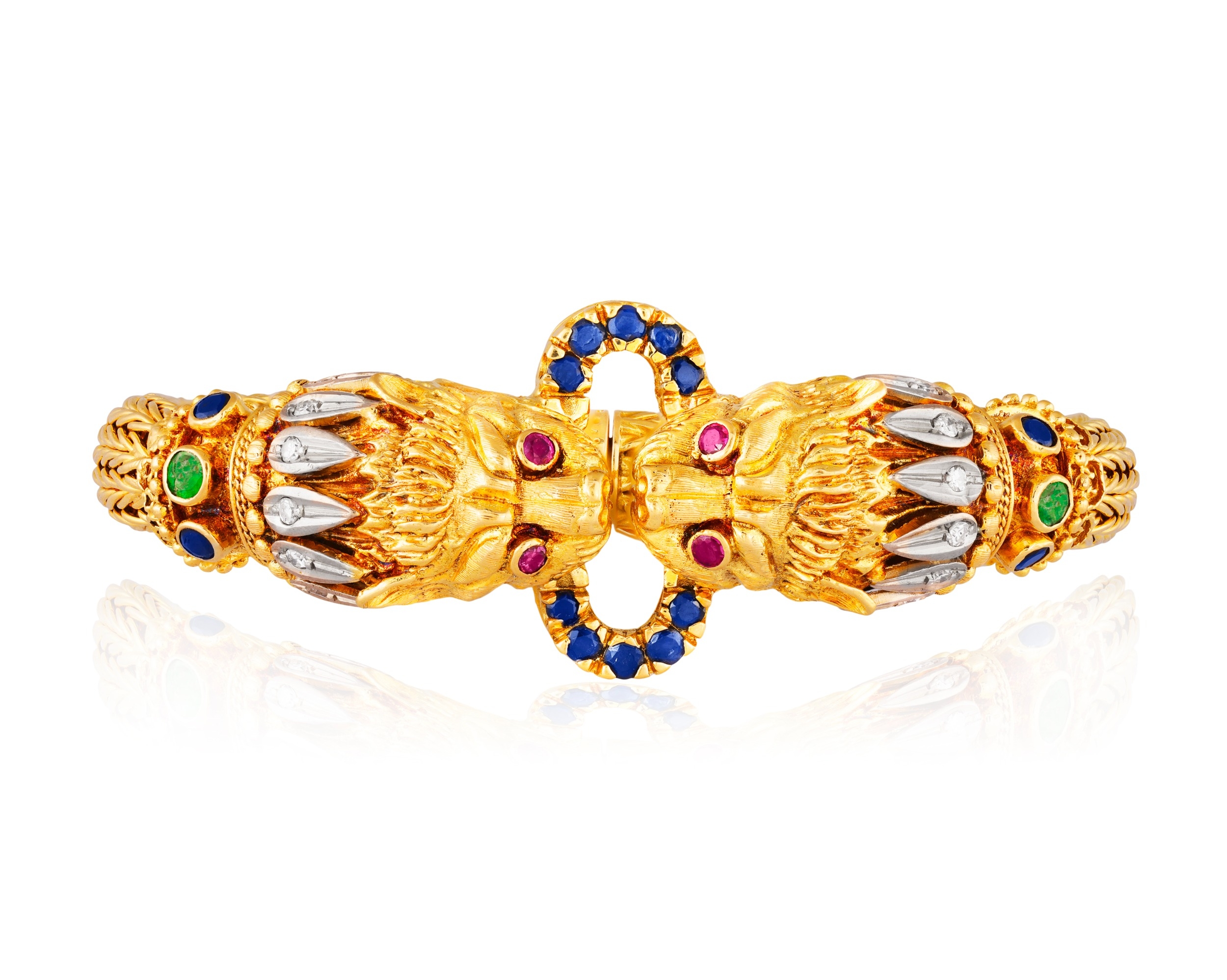 LALAOUNIS: A GOLD AND GEM-SET BANGLE Of woven foxtail linking, terminating in lion's head motifs at the centre, with engraved detail, beaded and ropetwist decoration, accented with single-cut diamonds, circular-cut emeralds, sapphires and rubies, mounted in 18K gold, signed Lalaounis, numbered A.21, with maker's mark, inner length approximately 17cm, inner diameter 5.7cm Ilias Lalaounis (1920–2013) was among the most original jewellers of the twentieth century, who transformed the buried forms of antiquity into jewels of striking, wearable modernity. Born in Athens into a family of goldsmiths with roots in Delphi, he came of age within the celebrated Zolotas firm before establishing his own house and, in time, becoming the only jeweller ever elected to the Académie des Beaux-Arts of the Institut de France. His Archaeological Collection of 1957 announced the terms of his ambition: that ancient Greek ornament, Mycenaean, Minoan, Hellenistic, could be not reproduced but genuinely reimagined. Granulation, filigree, hand-hammering and woven gold were treated not as historical curiosities but as living techniques, applied with sculptural confidence and a sure sense of presence. The results carried the gravity of the ancient world without its weight. What brought the house its international reach was the social world that gathered around it. Aristotle Onassis was among the first significant patrons, purchasing jewels for Maria Callas and later for Jacqueline Kennedy: a pair of names that placed Lalaounis simultaneously at the centre of Aegean glamour, operatic legend and American political history. Elizabeth Taylor, Barbra Streisand, Charlize Theron and Scarlett Johansson followed across subsequent decades, each lending the house a different register of cultural authority. In 1976, Empress Farah of Iran commissioned an entire collection inspired by Persian art, displayed at the Imperial Palace in Tehran. His connections extended beyond patronage into creative friendship. When Salvador Dalí became too frail to continue designing the ceremonial swords presented to new members of the Académie des Beaux-Arts, he named Lalaounis to carry on the work; a detail that speaks to the esteem in which he was held among the wider artistic world. His retrospective was staged at the Sorbonne Chapel; his Helen of Troy collection toured the Penn Museum in Philadelphia; in 1992 he designed the Olympic torch. When he formally founded Ilias Lalaounis – Greek Gold S.A. in 1969, the house expanded steadily: Paris near Place Vendôme, then Zurich, Geneva, London, Tokyo and Hong Kong, each opening accompanied by a collection drawn from the local cultural inheritance. He founded the Greek Jewellers' Association and trained hundreds of goldsmiths, shaping the broader language of modern Greek jewellery as much as his own. His legacy found lasting form in the Ilias Lalaounis Jewelry Museum, opened in 1994 at the foot of the Acropolis, housing more than 4,500 pieces alongside a gallery dedicated to his commissions for international figures. The house continues today under the direction of his four daughters.