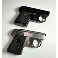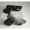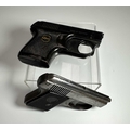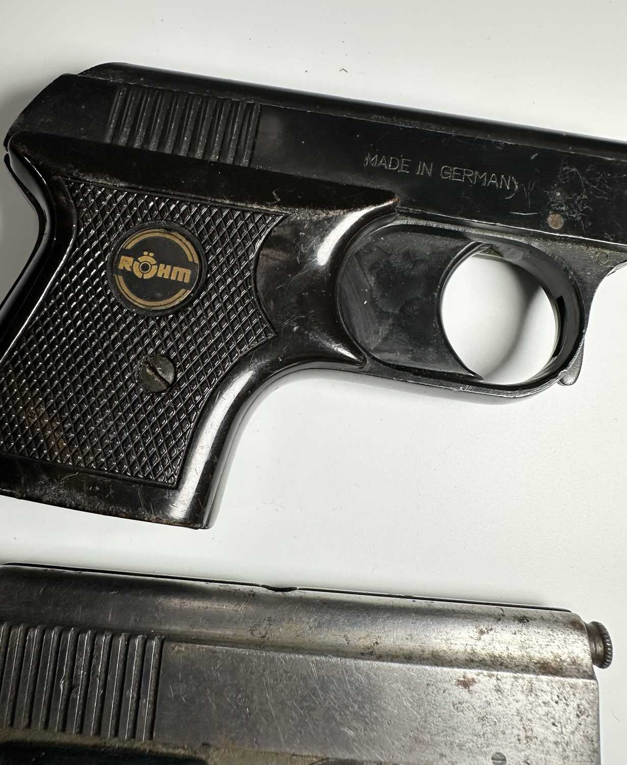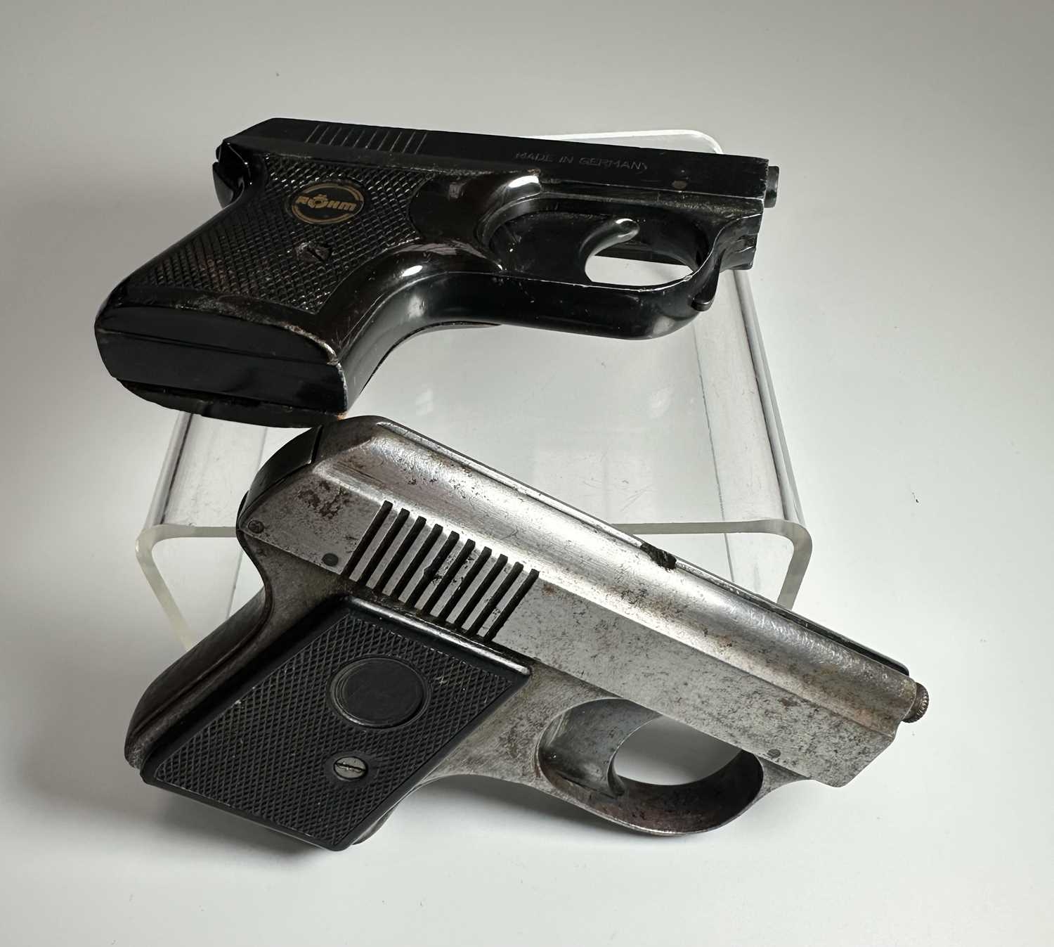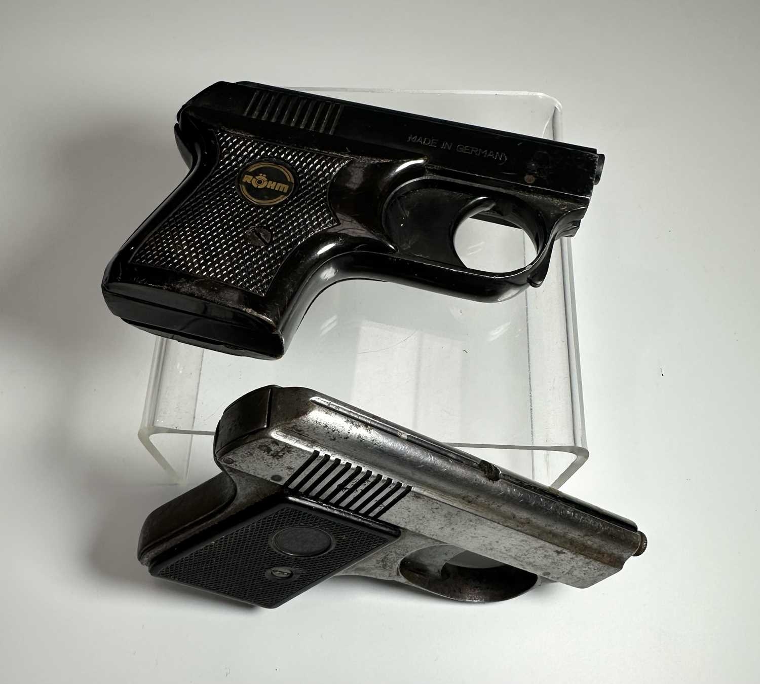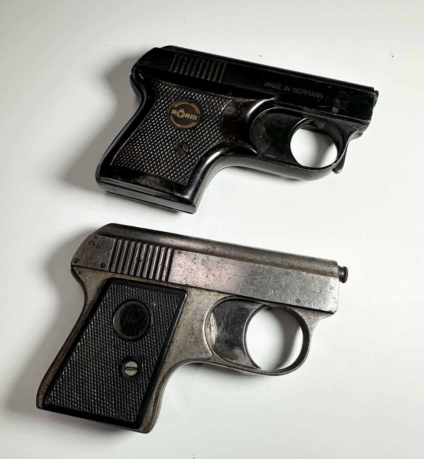 Two vintage starter pistols, one in black steel and marked 'ROHM RG2' with a mock-tortoiseshell handle, height 7cm, length 10cm, the other silvered steel (2)