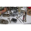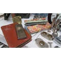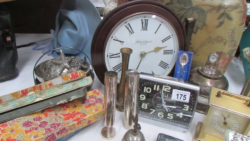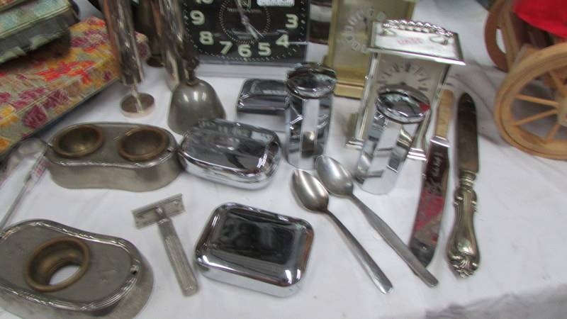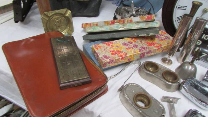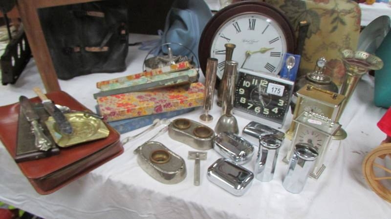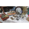 A mixed lot of vintage boxes, silver sugar tongs, clocks etc., (Collect only)