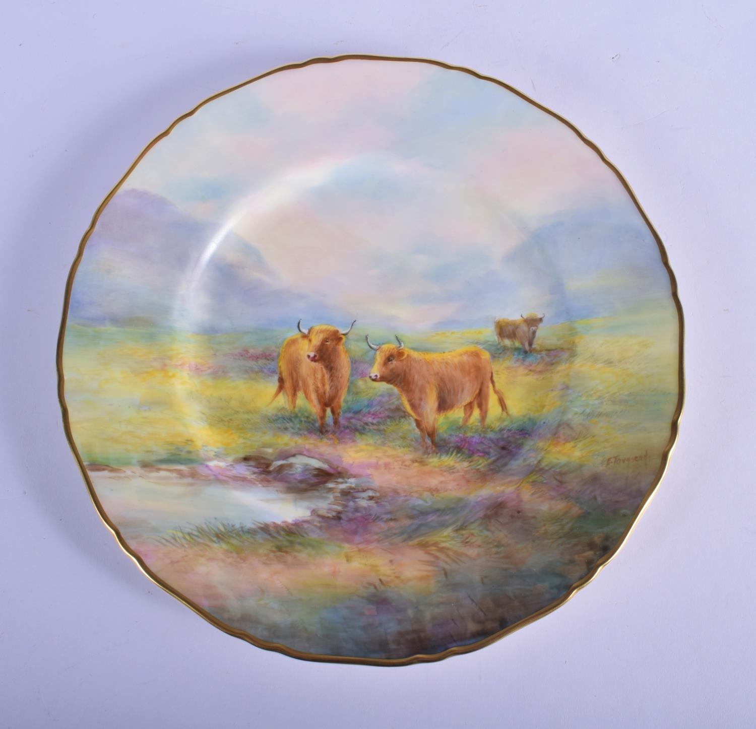 Royal Worcester fine large plate or charger fully hand painted with Highland cattle in a mountainous scene signed by E. Townsend, black mark. 27cm Diameter