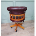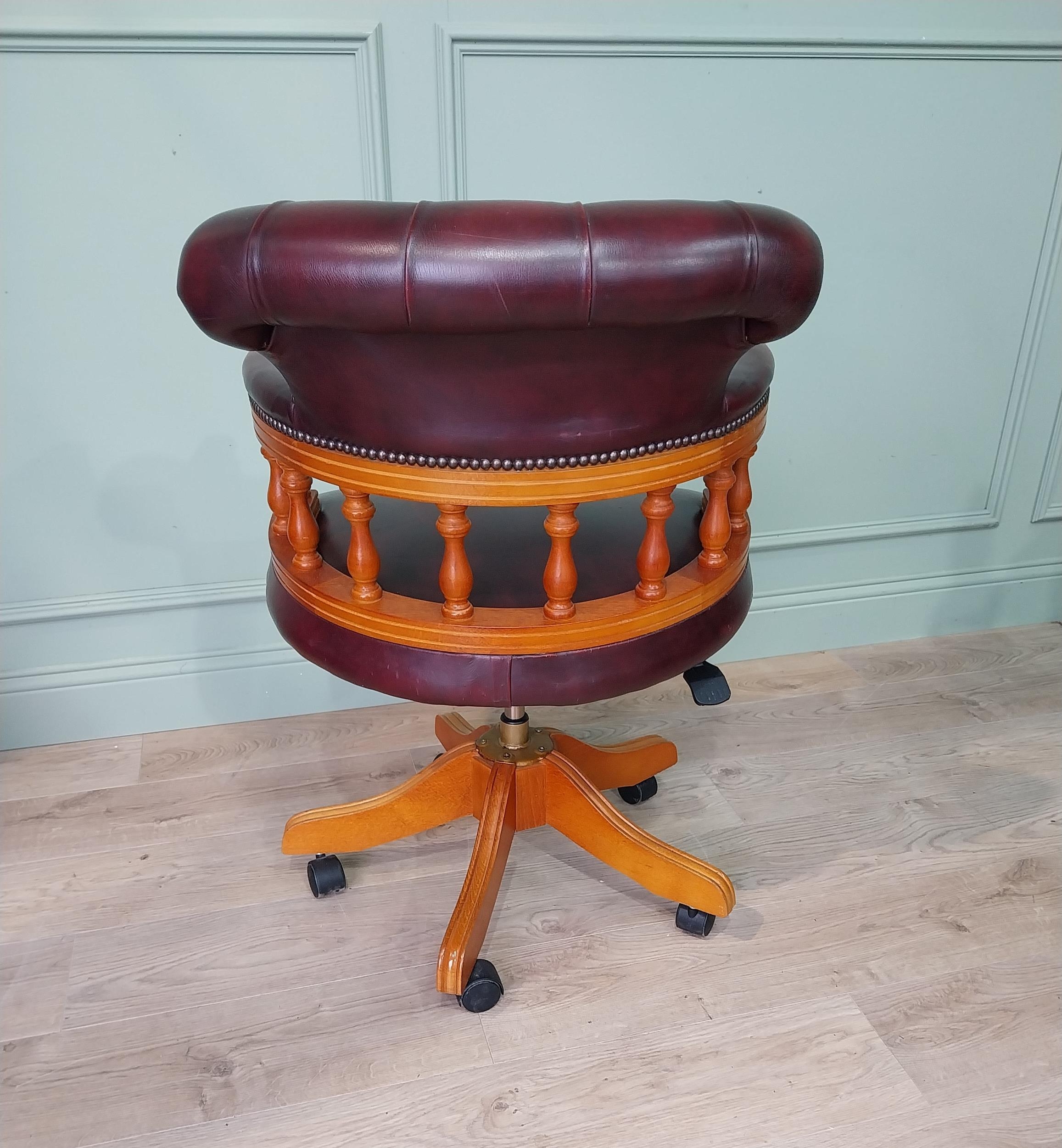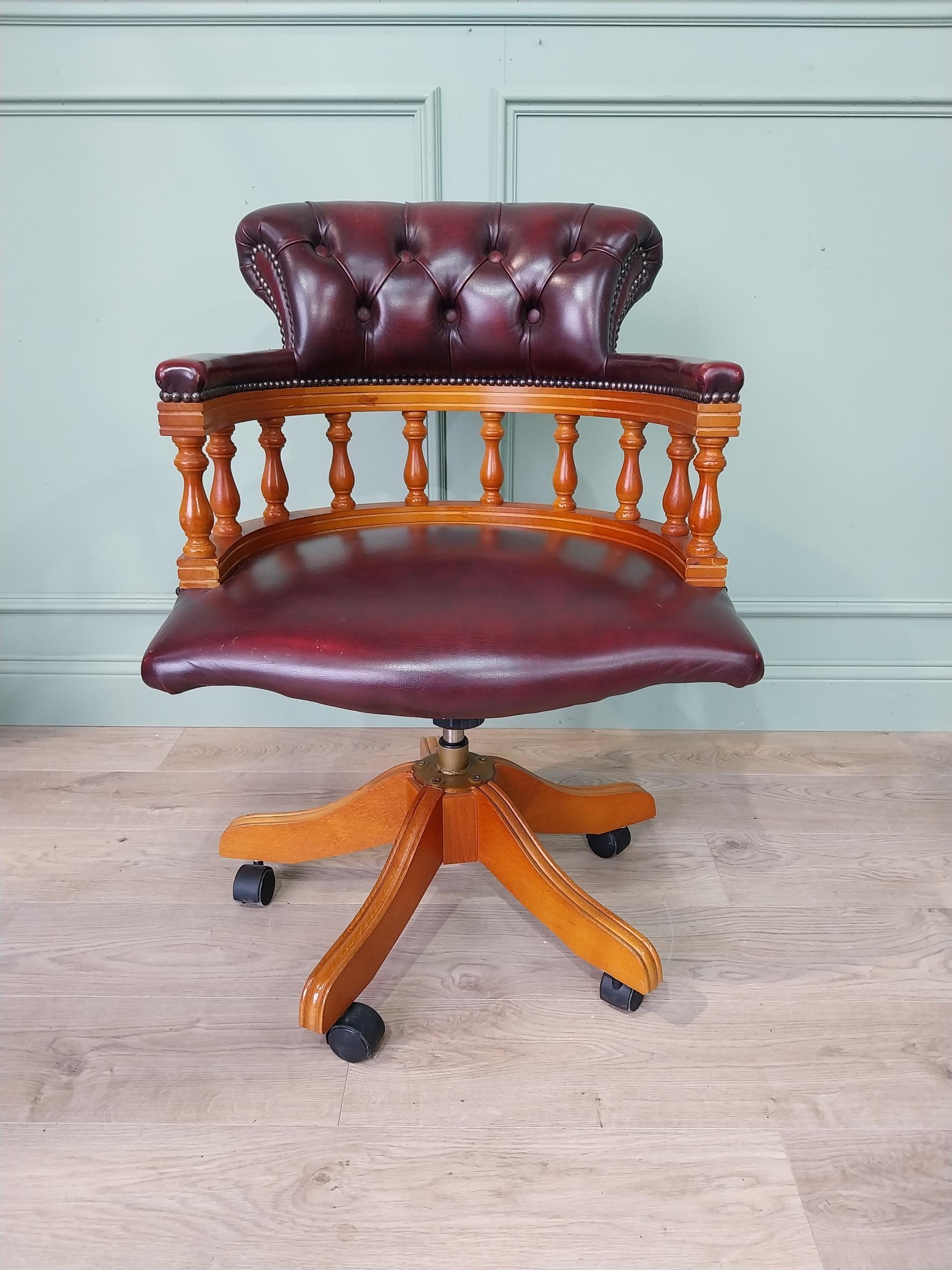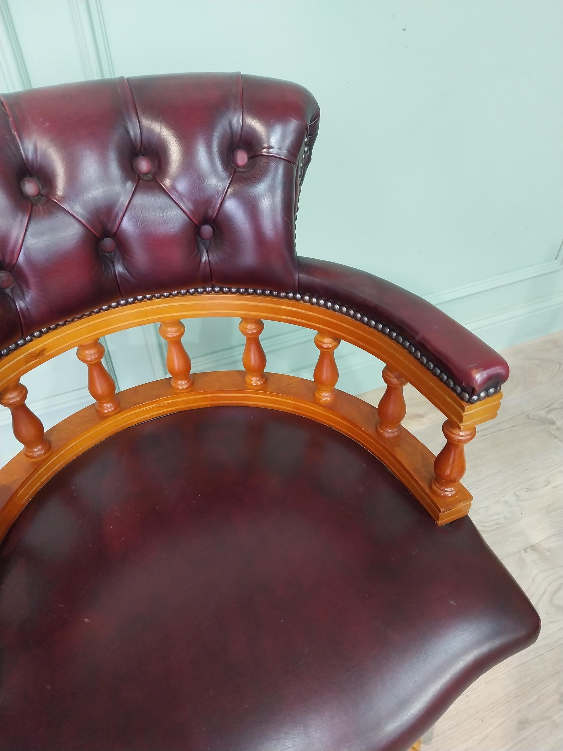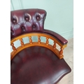 Mahogany and deep buttoned leather upholstered office chair. {90 cm H x 63 cm W x 55 cm D}.
