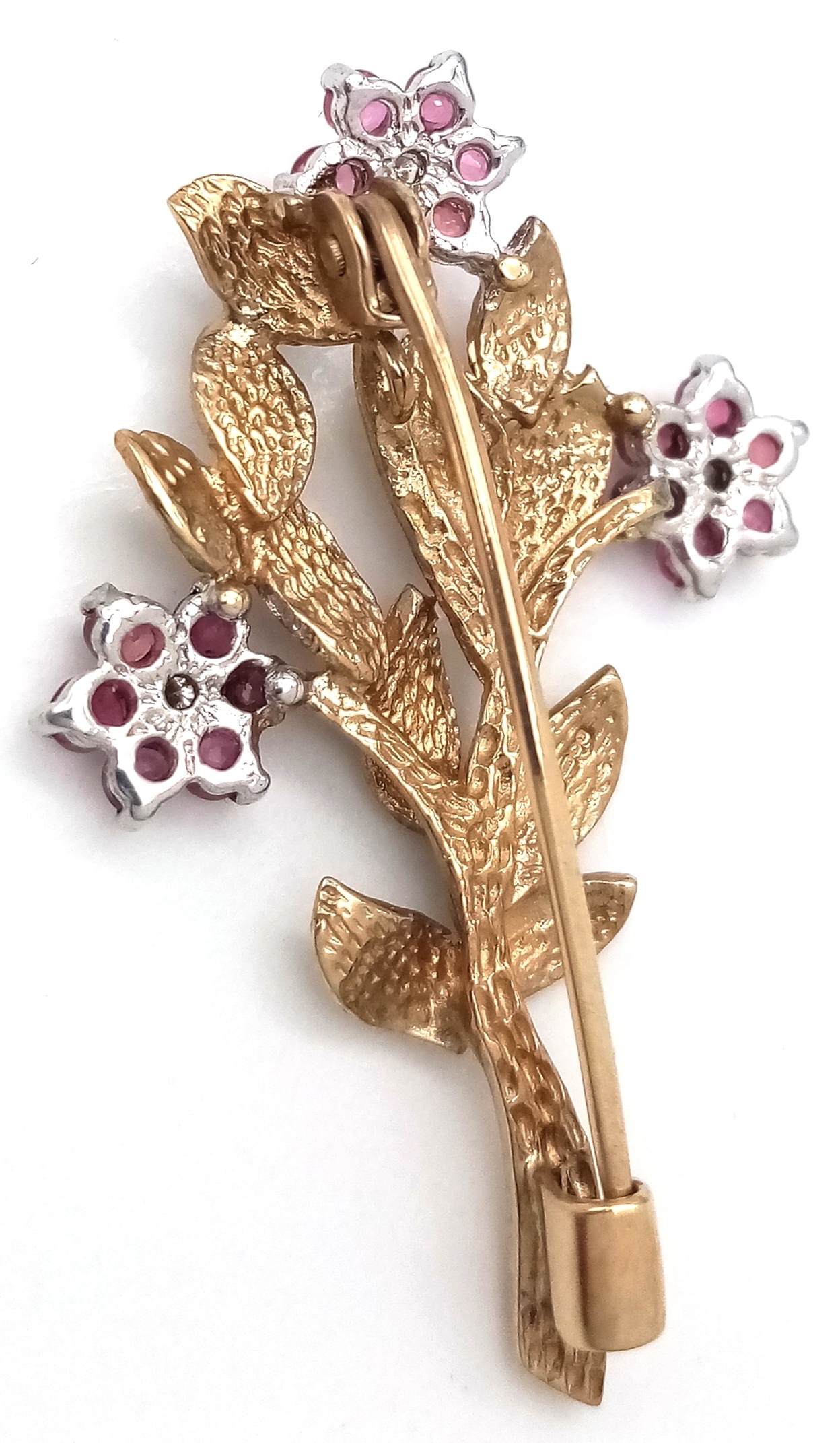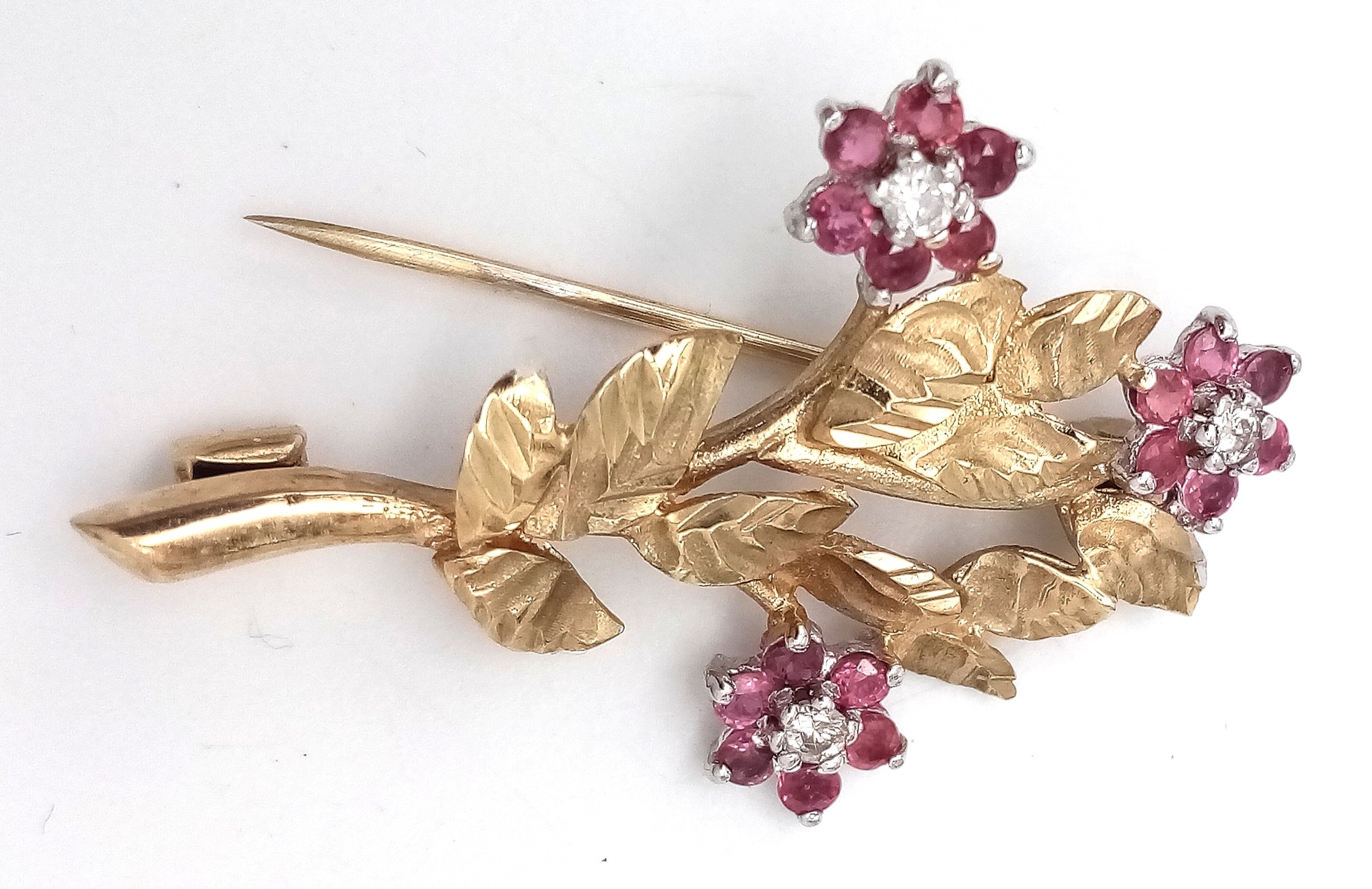 Vintage 9 CARAT GOLD DIAMOND and RUBY BROOCH. Full UK hallmark . Complete with original H. Samuel Jewellery Case. 2.8 Grams. 3.5 cm x 2.2 cm. Please see pictures.