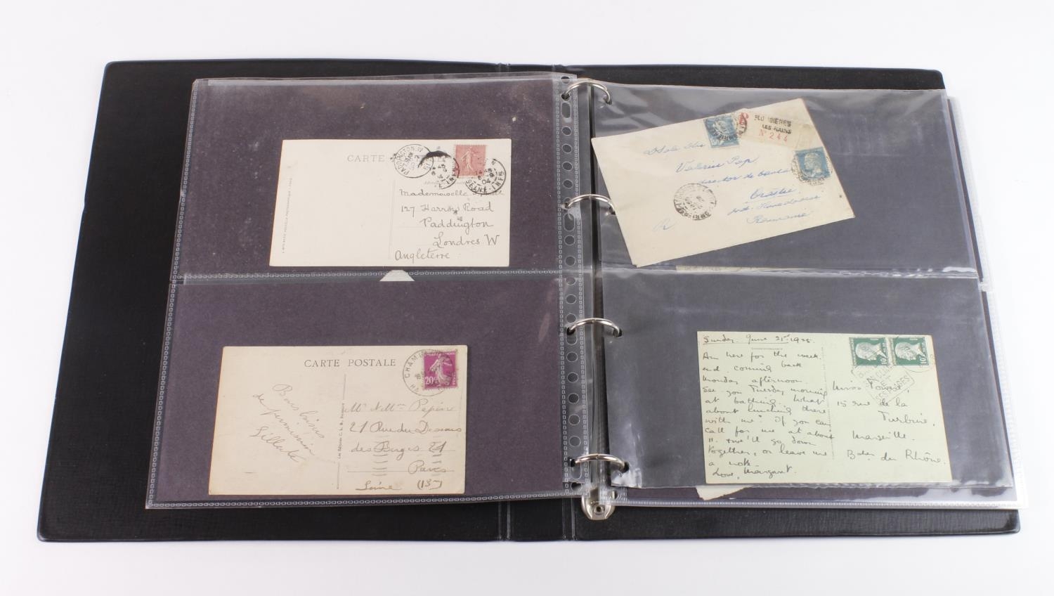 France - black binder of various Postal History + some postcards, pre stamp 1828 to a few modern items. Many 30's airmails inc one 1939 France - Finland. (approx 54 items)