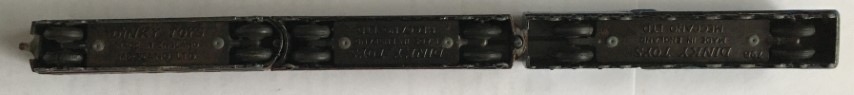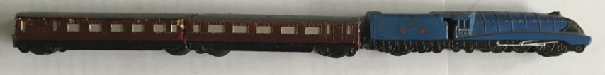 An early Dinky Meccano toy train. Engine model number 798 A4 steam locomotive and two carriages