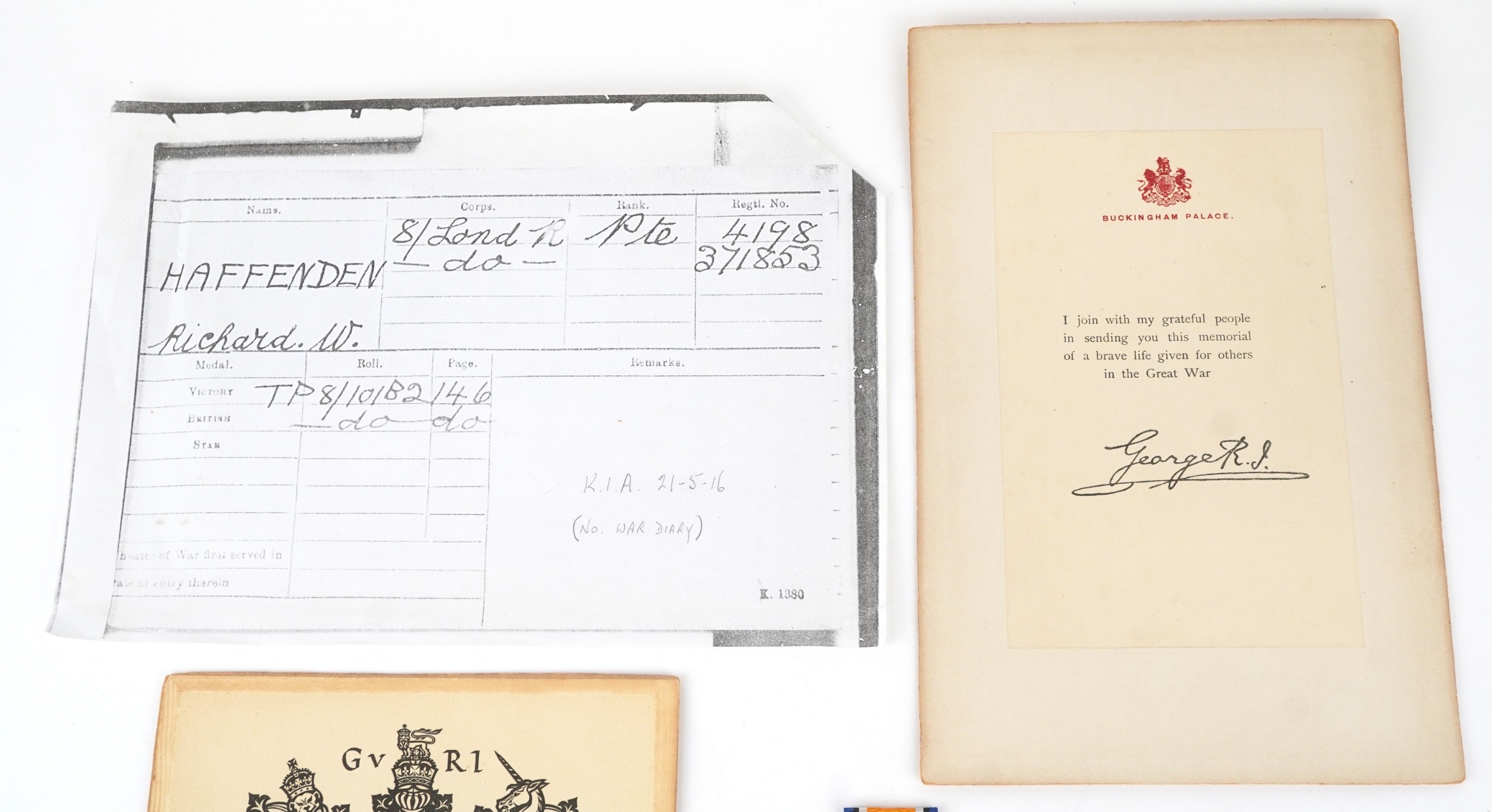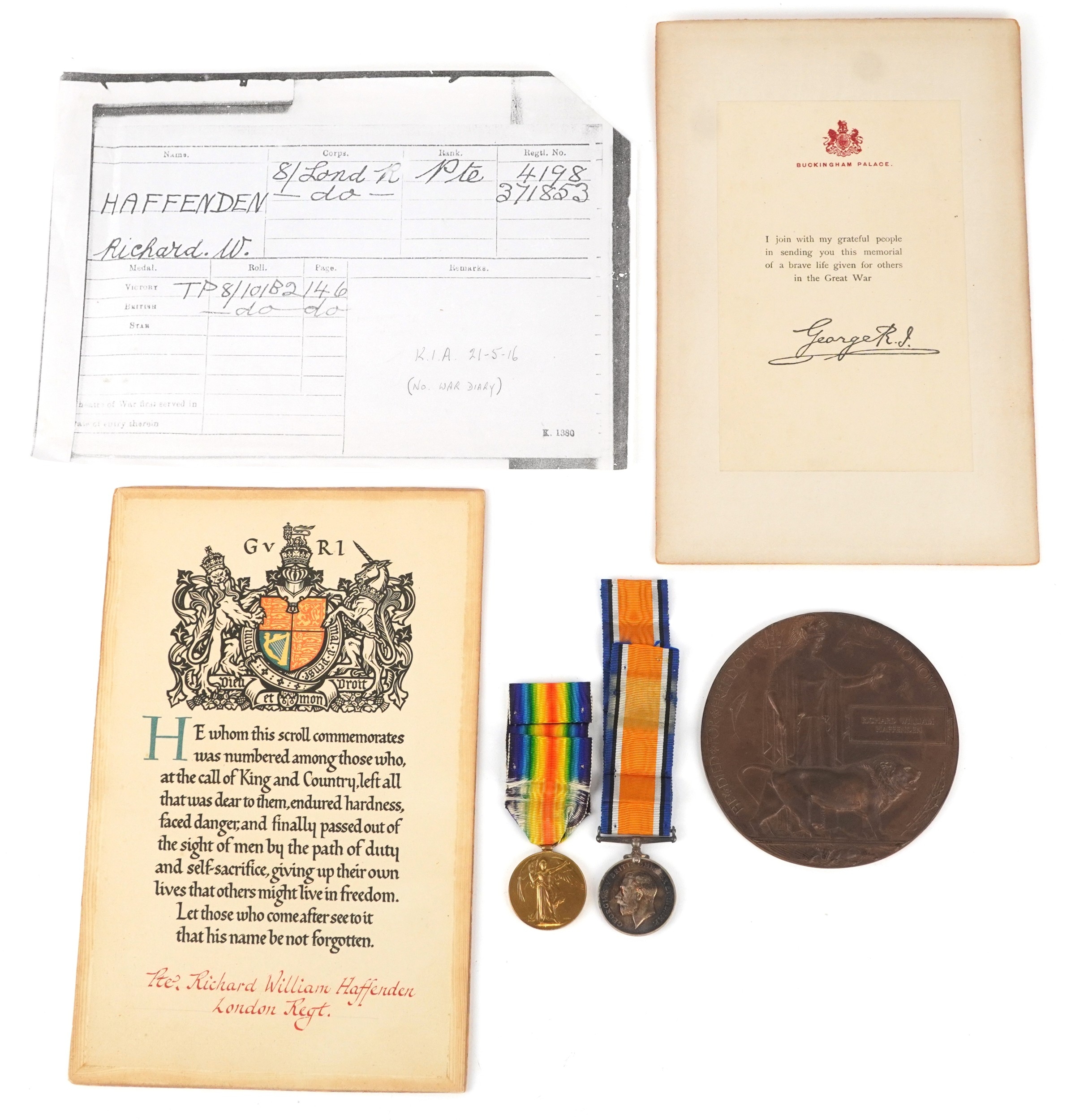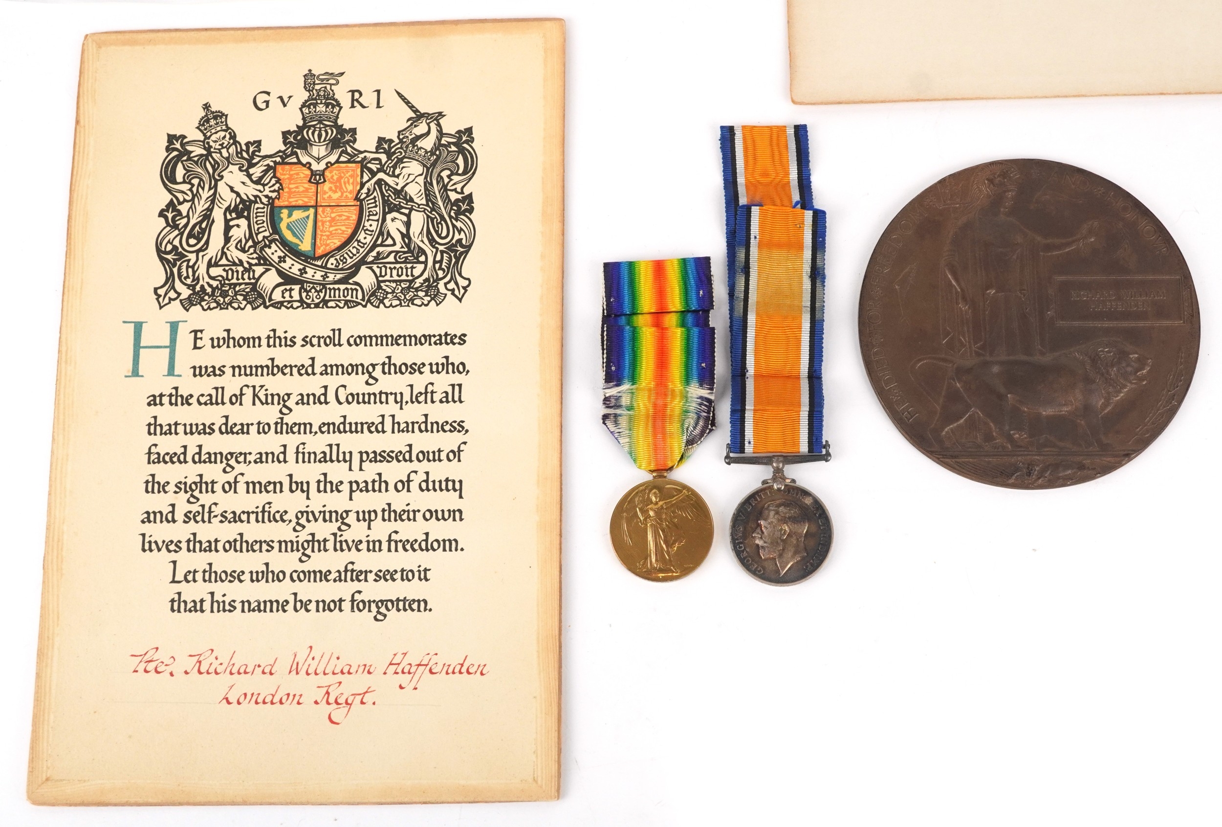 A British military World War I medal pair and death plaque awarded to 4198 PTE RICHARD WILLIAM HAFFENDEN.8-LOND.R. and commemorative death scroll.