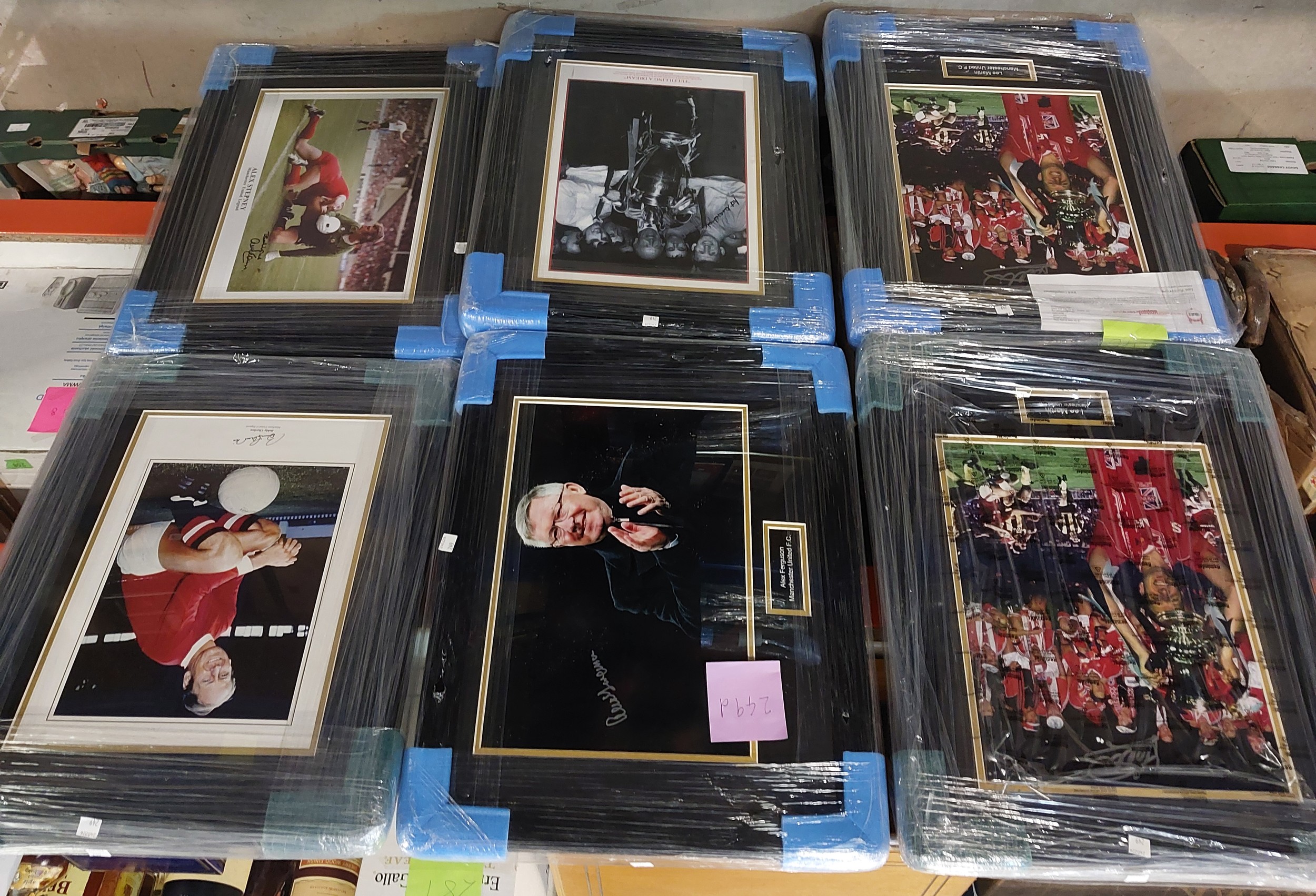 6 signed Manchester United photos including Bobby Charlton, Alex Ferguson, Alex Stepney, Pat Crerand, all with certificates.