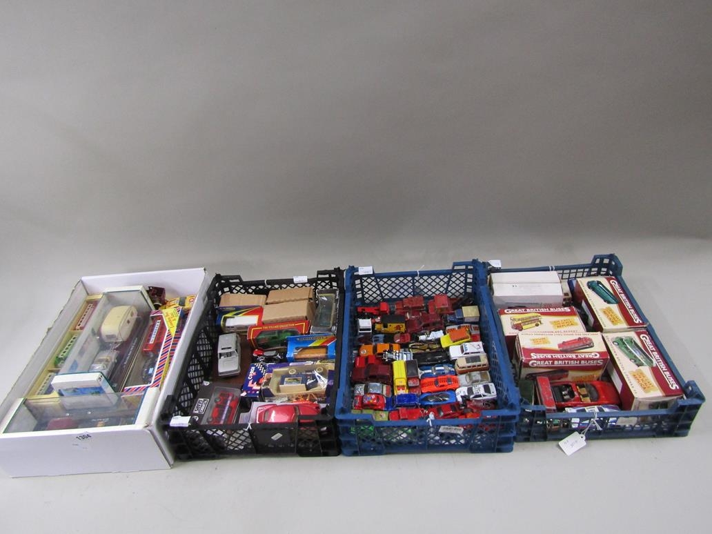 FOUR BOXES OF MIXED DIECAST VEHICLES TO INCL GREAT BRITISH BUSES, DAYS GONE BY ETC