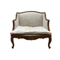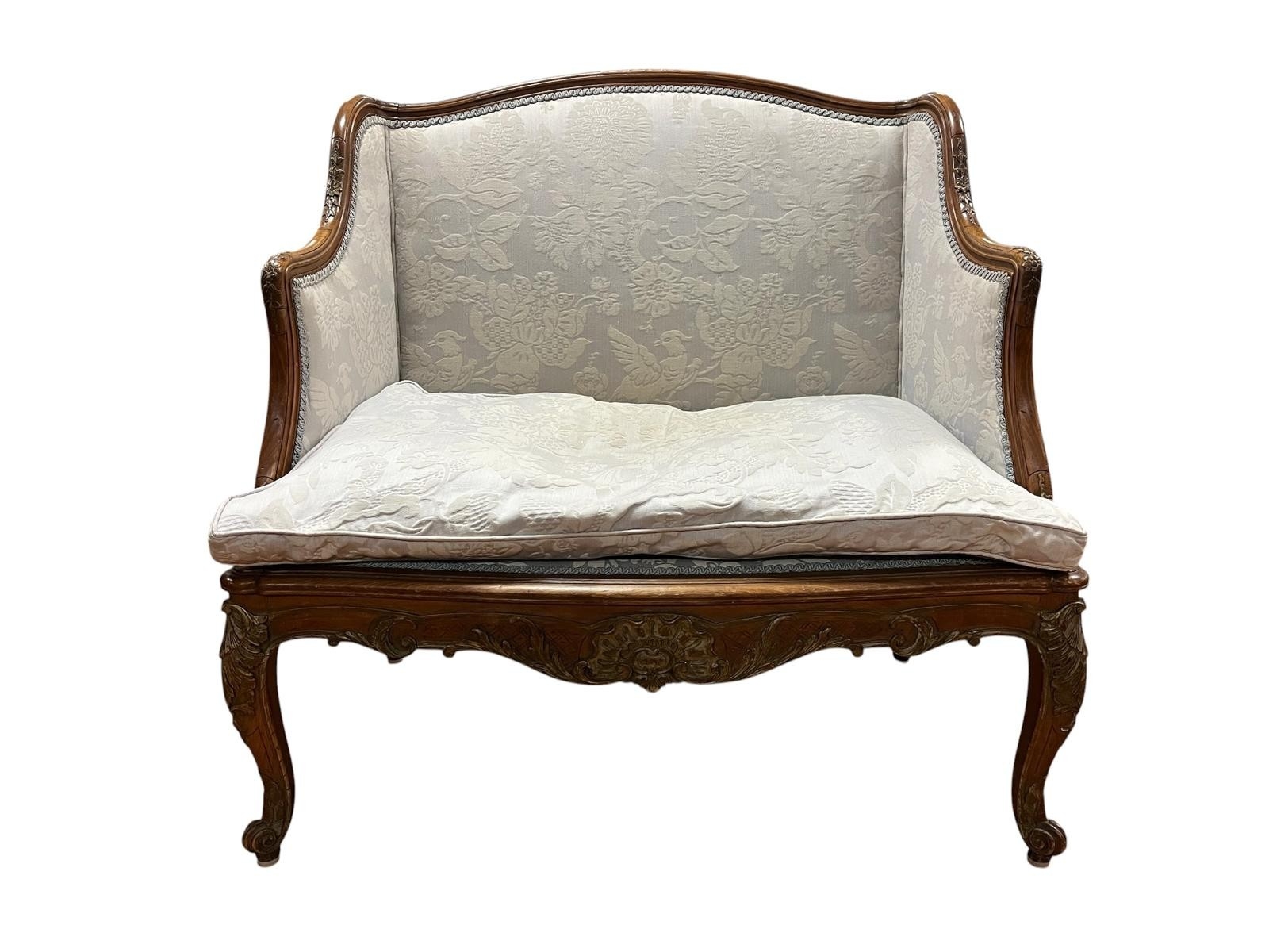 A 19TH CENTURY CONTINENTAL CARVED WALNUT AND UPHOLSTERED SETTEE the serpentine top rail above an upholstered panel and seat with loose cushion with foliate and shell carved apron on cabriole legs 90cm (w)