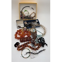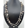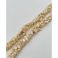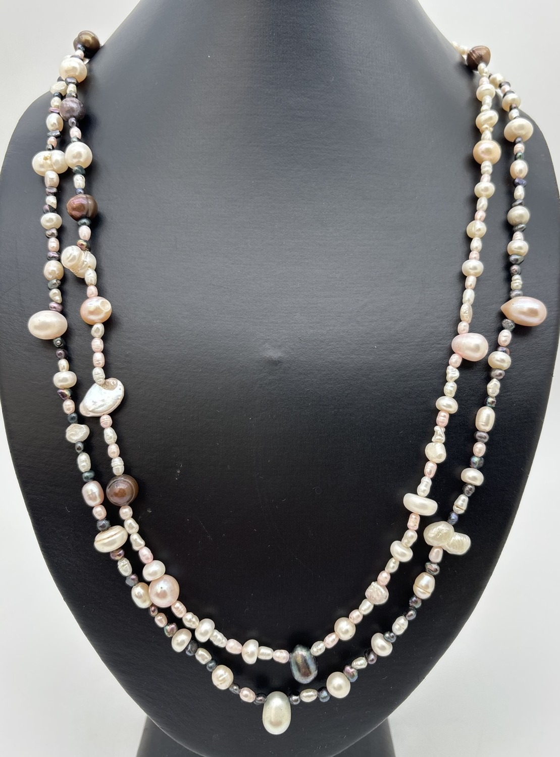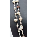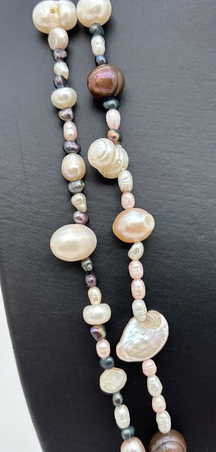 A 50" multicoloured pearl necklace made from cream, peach, peacock and white baroque and keshi pearls, in various sizes.
