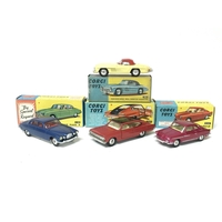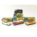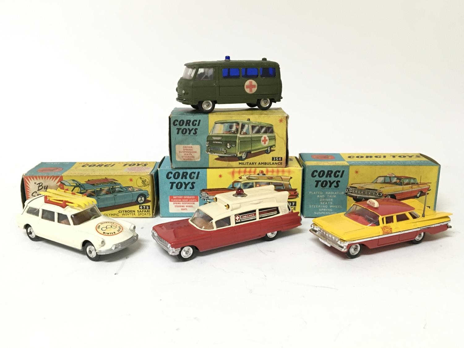 Corgi toys, #354 Military Ambulance, #480 Chevrolet Taxi cab, #475 Citroen Safari, Olympic winter sports and #437 Superior Ambulance , boxed