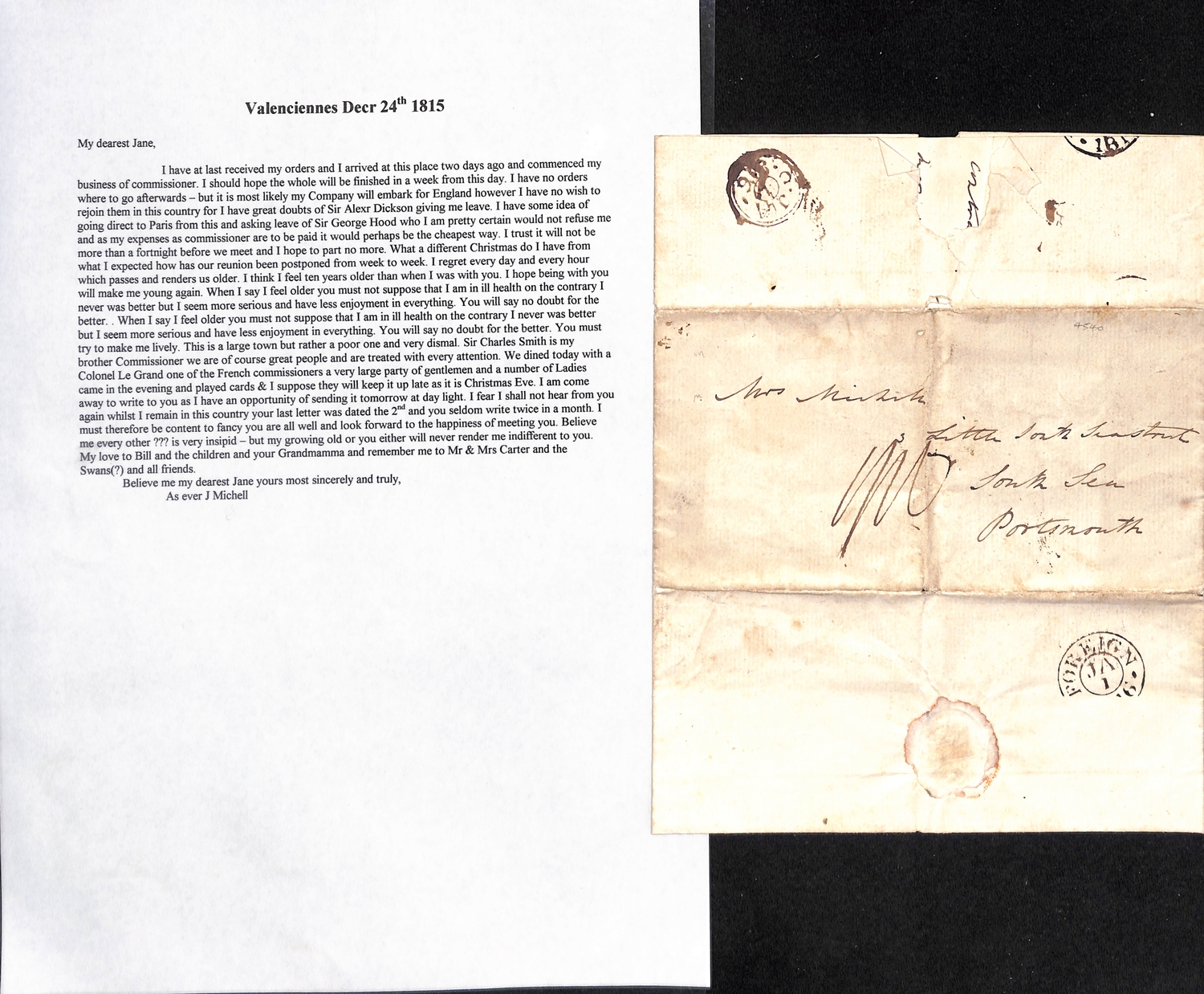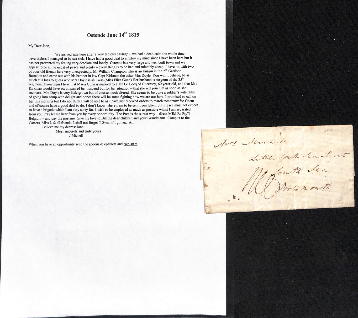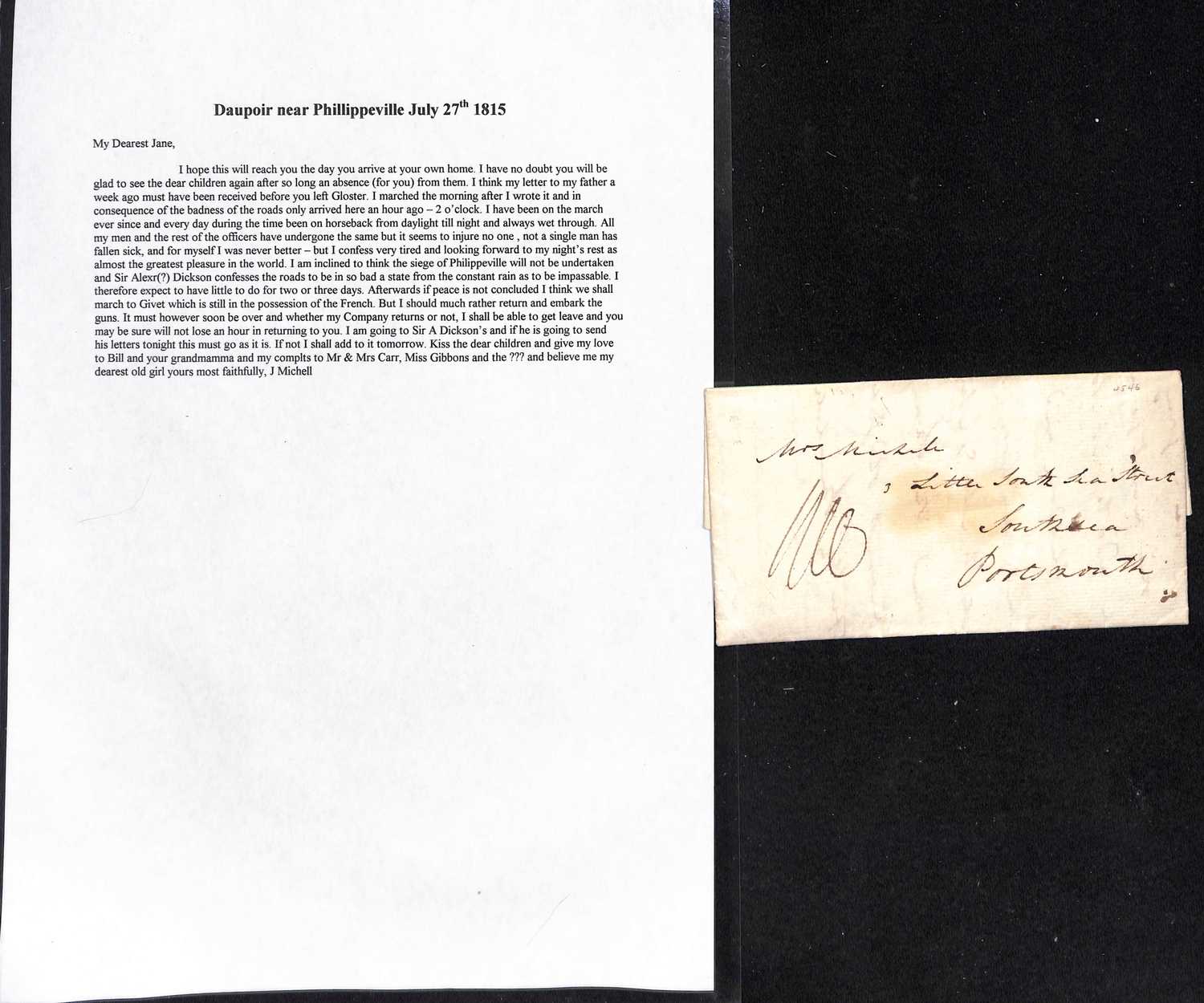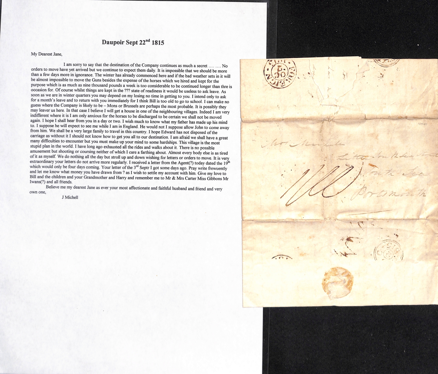 1815 Entire letters from Captain John Michell, Royal Artillery, to his wife in Portsmouth, written from Ostende (June 14, just arrived from England, four days before the Battle of Waterloo), Daupoir near Philippeville (July 27, just arrived after a long march, does not expect the siege of Philippeville to be undertaken, if peace is not concluded will march to Givet, which is still in the possession of the French), Daupoir (Sept. 22) or Valenciennes (Dec. 24, Michell has been appointed joint Commissioner of the town with Sir Charles Smith). A good correspondence. (4).