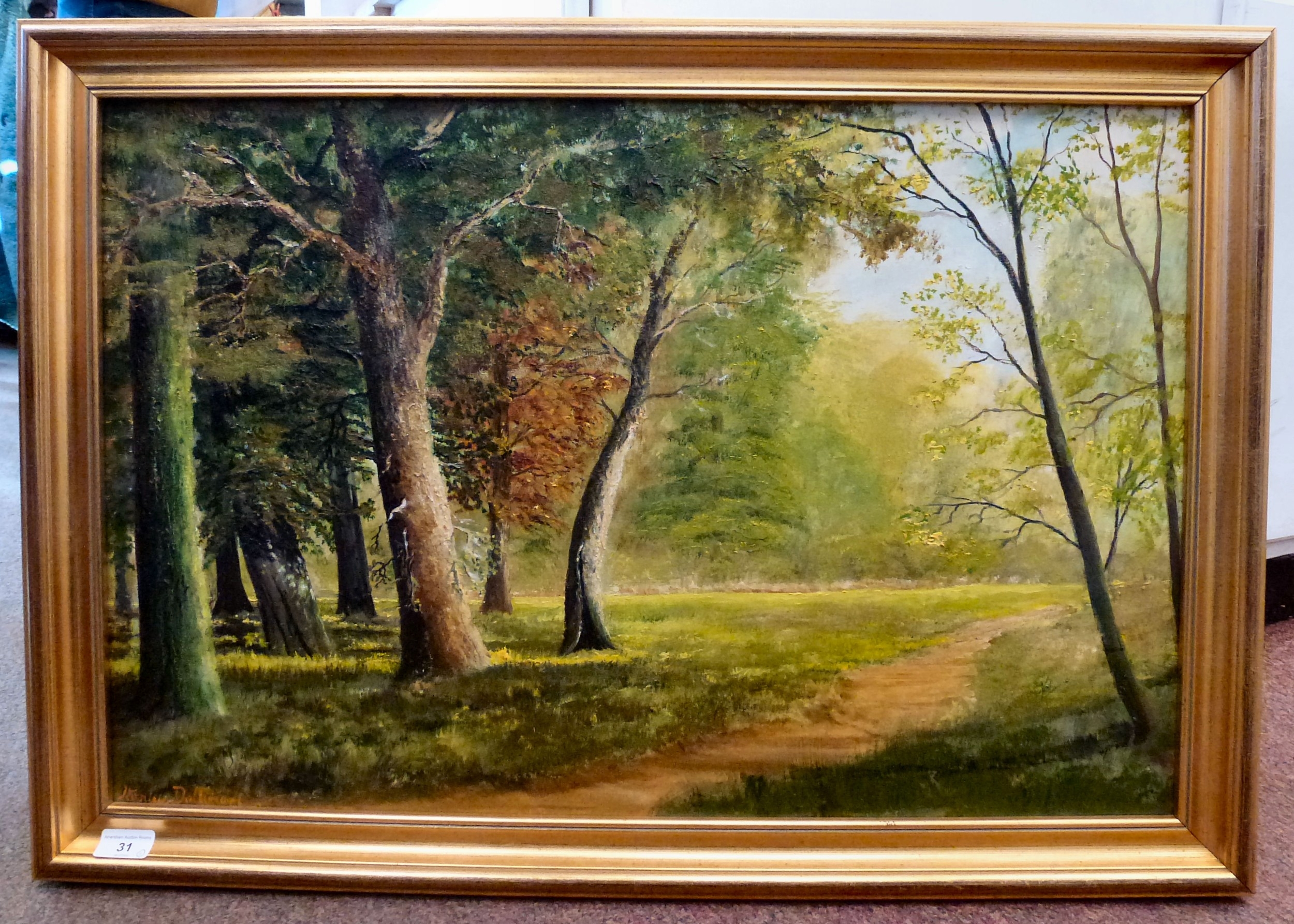 Stanley Dollimore - a woodland scene oil on canvas bears a signature 19" x 29" framed