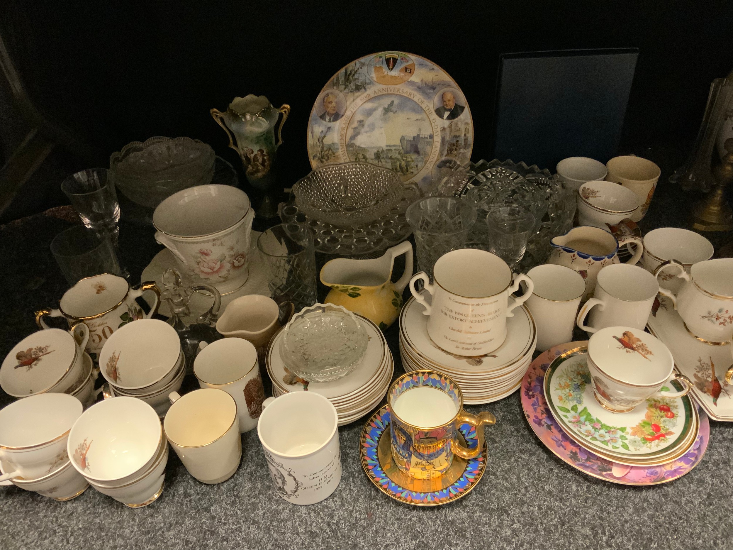A Sheriden Pheasant in Flight tea service; commemorative mugs; The 60th Anniversary of the D Day Landings; glassware; etc