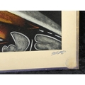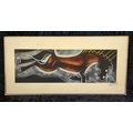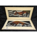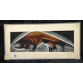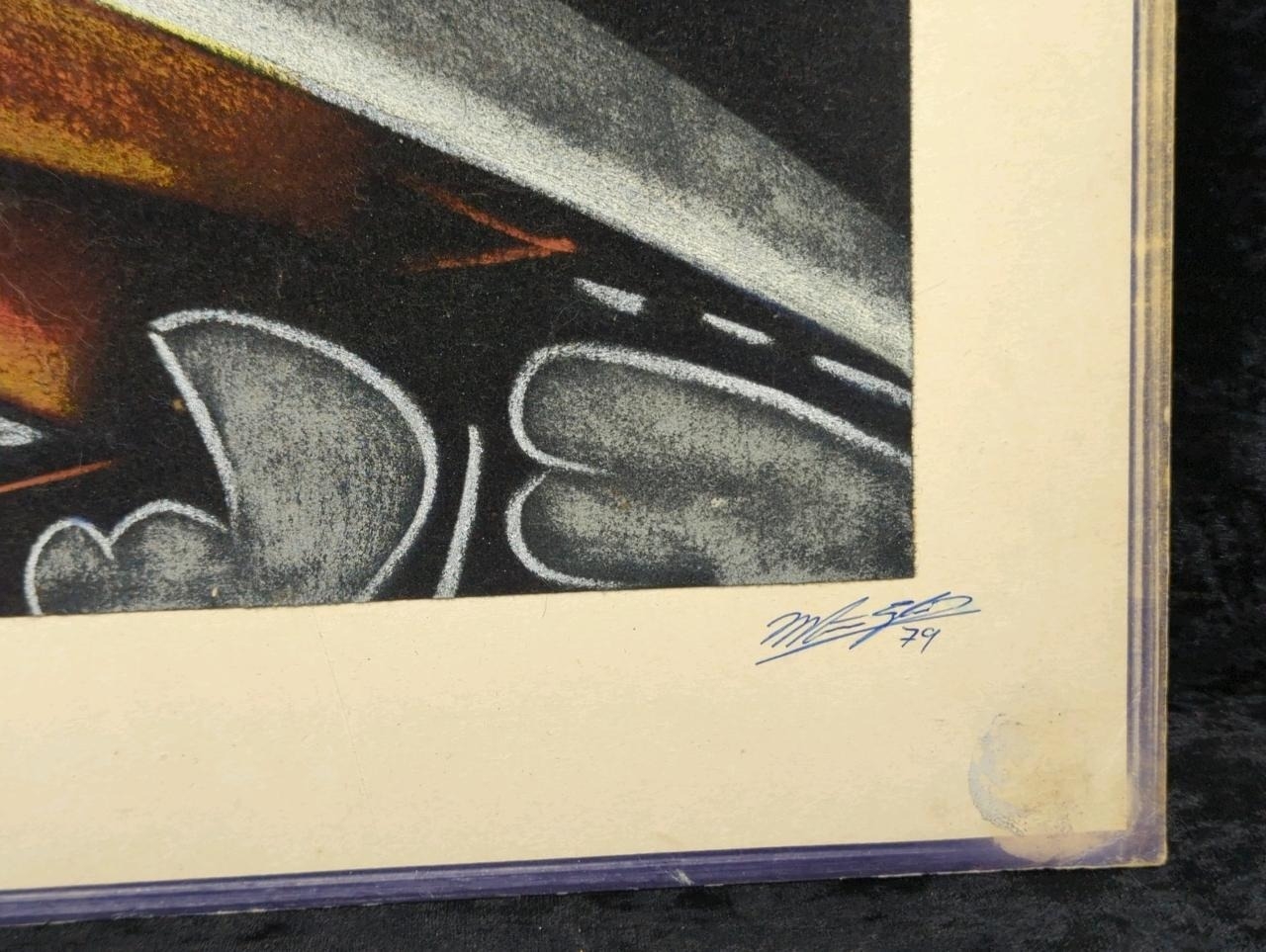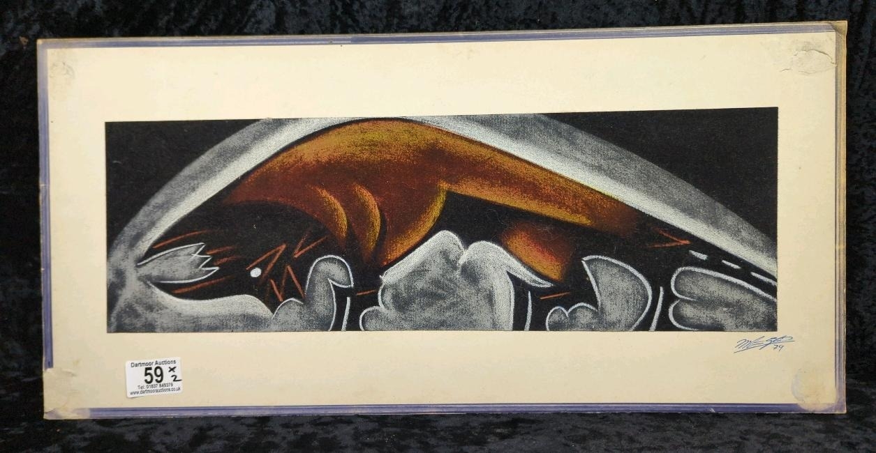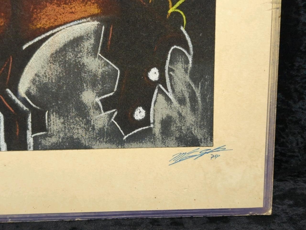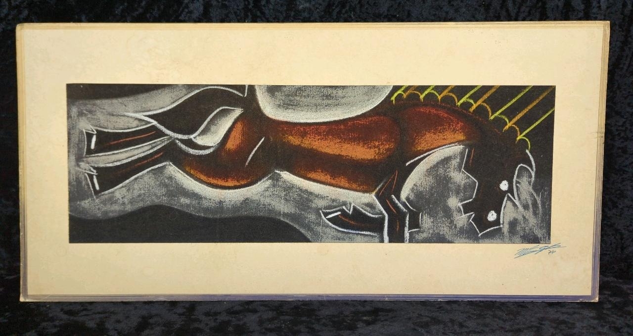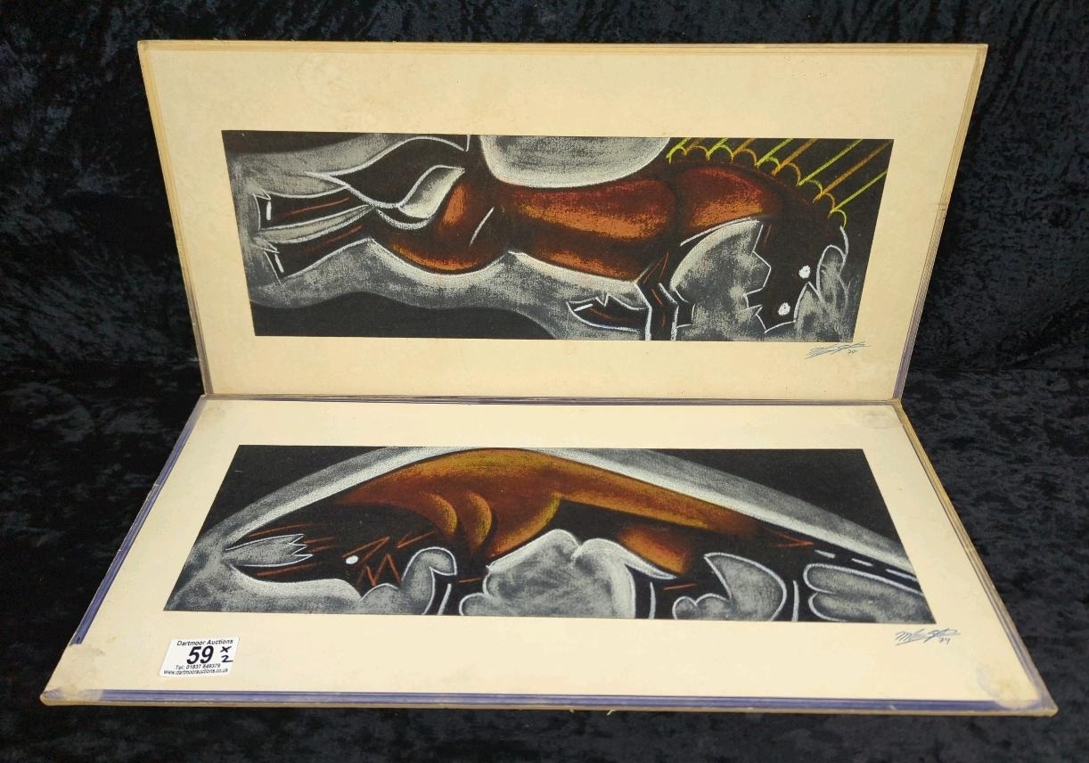 Pair of mixed media pictures on velvet of a horse and a bull - most likely crayon, chalk and charcoal. Both signed by the artist, dated 1979. Each approx H27 x W56cm.