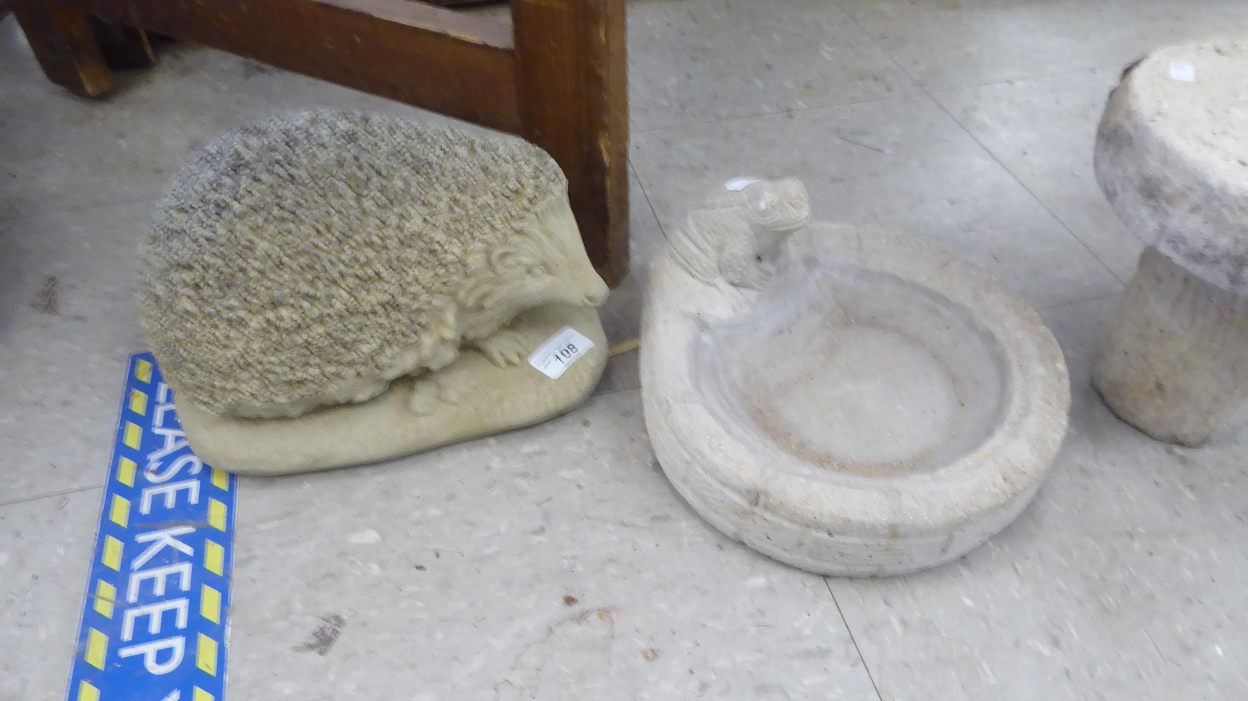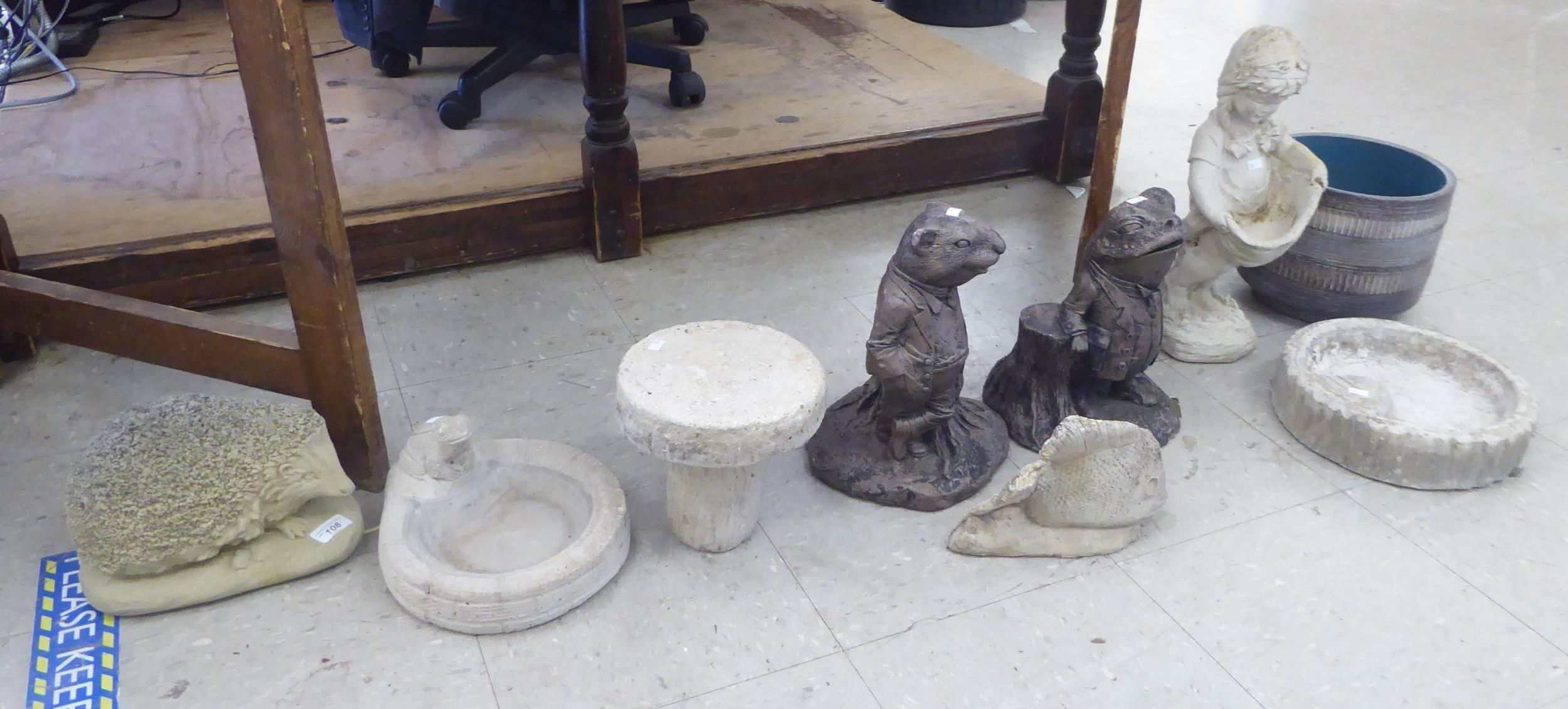 Composition stone ornaments and similar: to include a hedgehog 6"h; and a girl carrying a basket 15"h