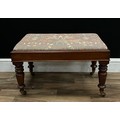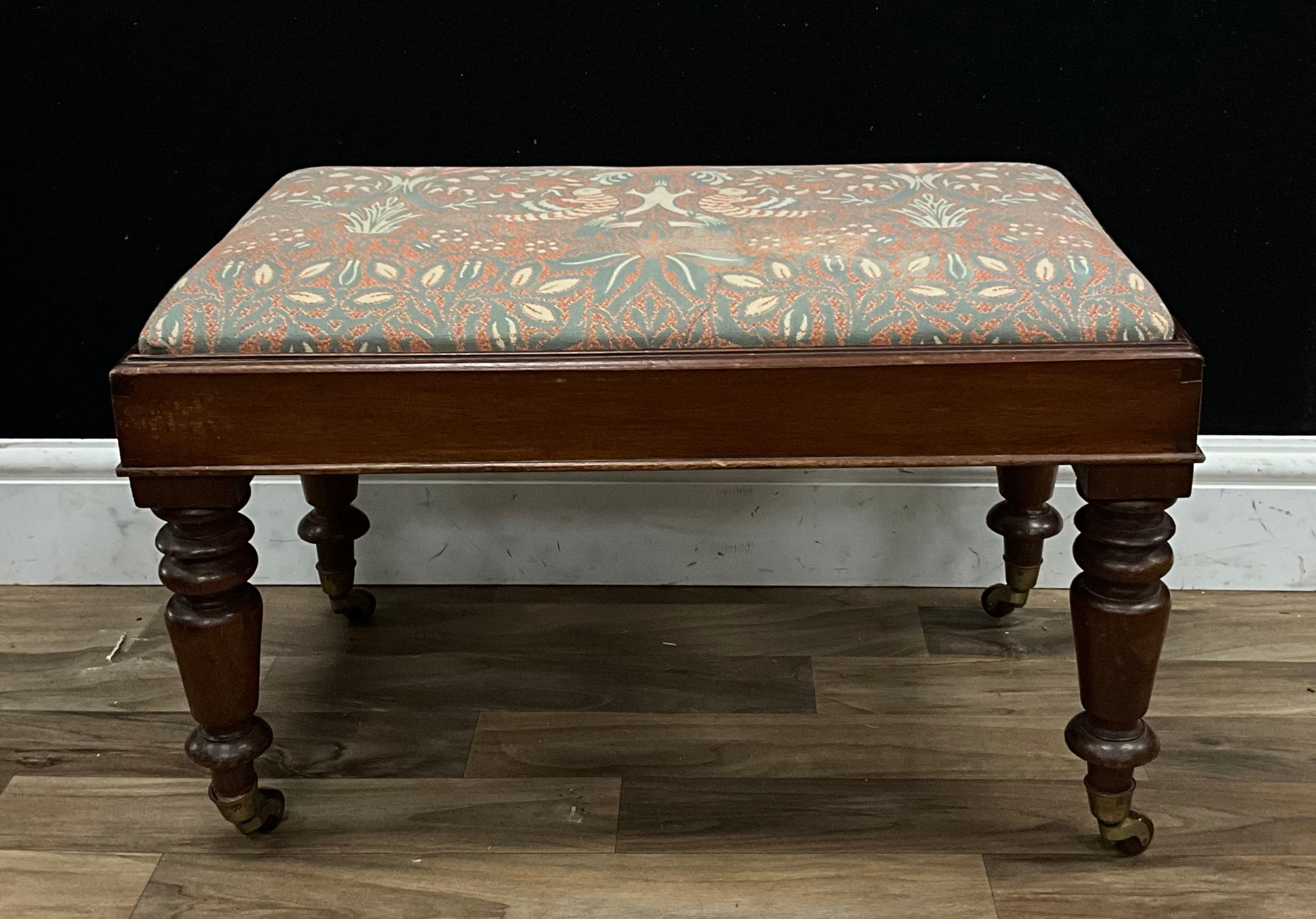A Victorian Cuban mahogany footstool, William Morris type upholstery drop-in seat, turned legs, ceramic castors, 37cm x 59cm x 37cm, c.1880