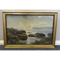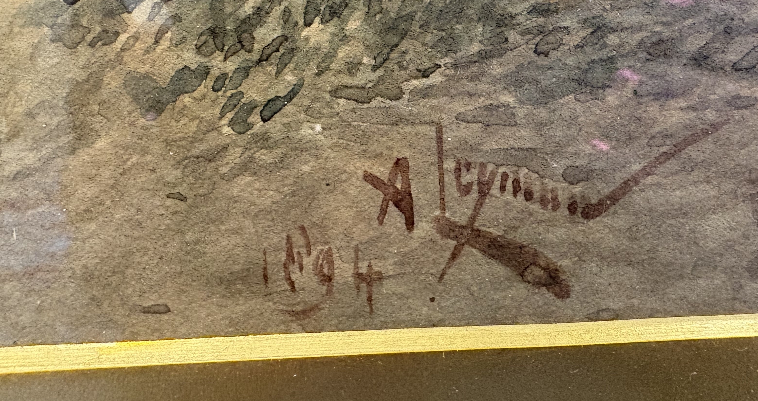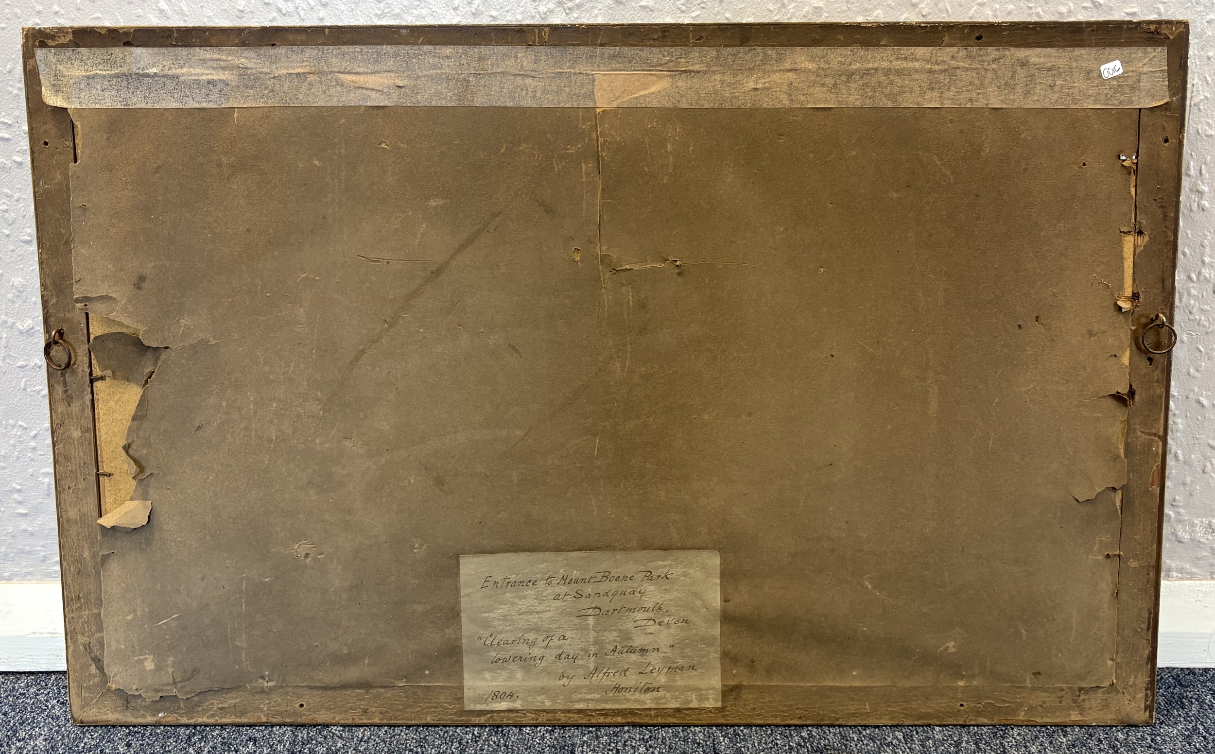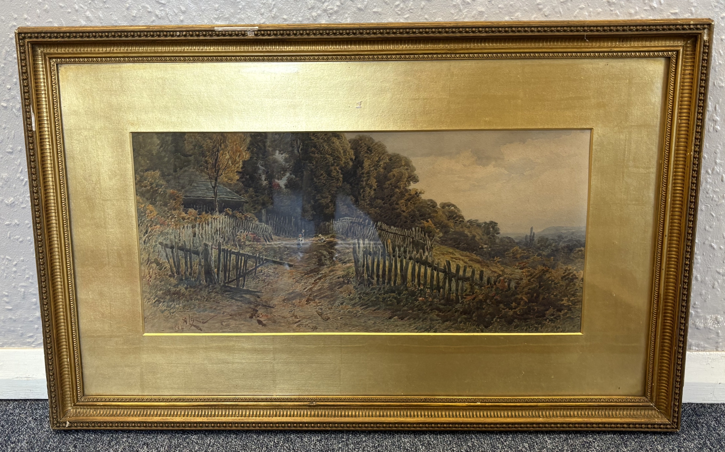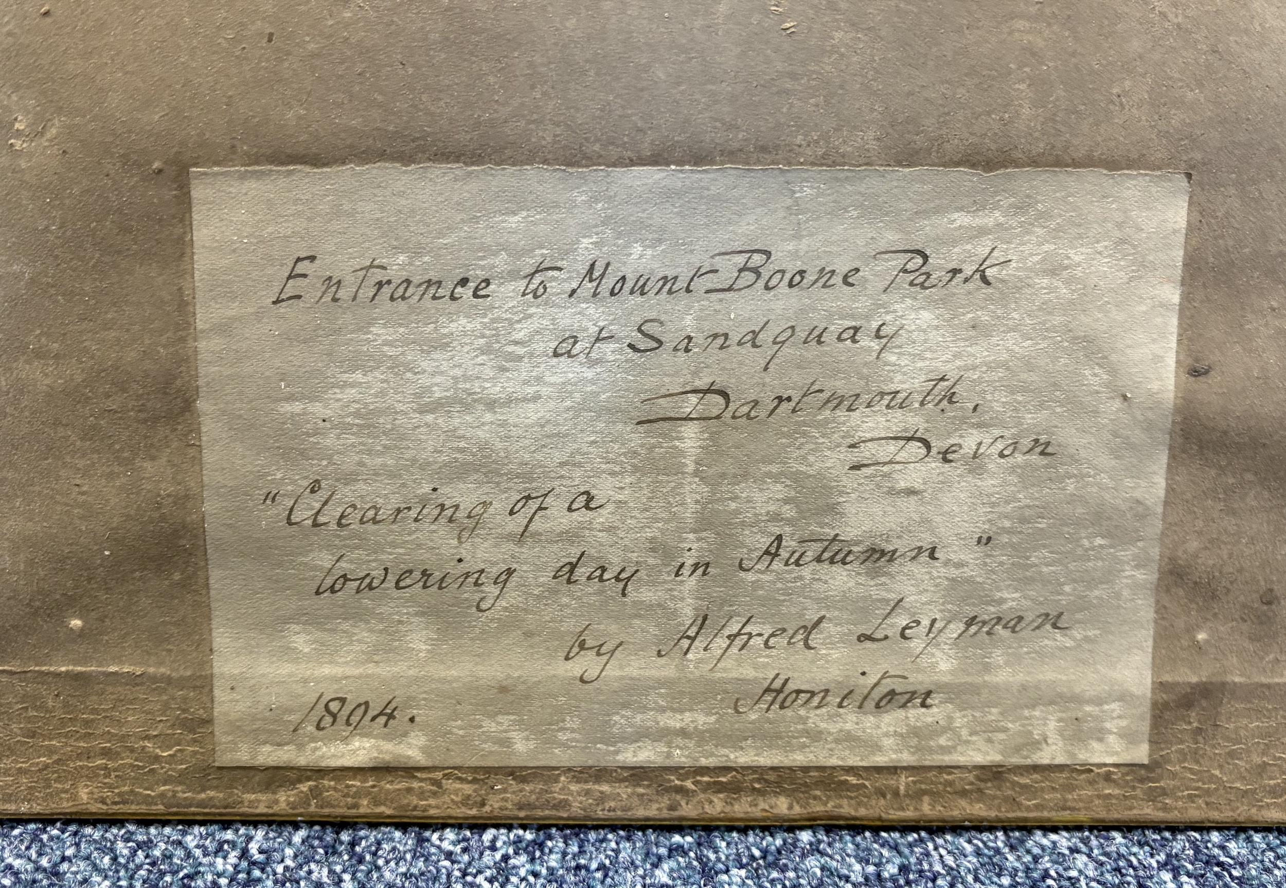 ALFRED LEYMAN: A gilt framed and glazed watercolour entitled 'Clearing of a lowering day in Autumn' depicting the entrance to Mount Boone Park at Sandquay Dartmouth, Devon. Signed to bottom left. Inscribed verso. Approx. 51 cm x 24 cm (ss). Est. £150 - £200.
