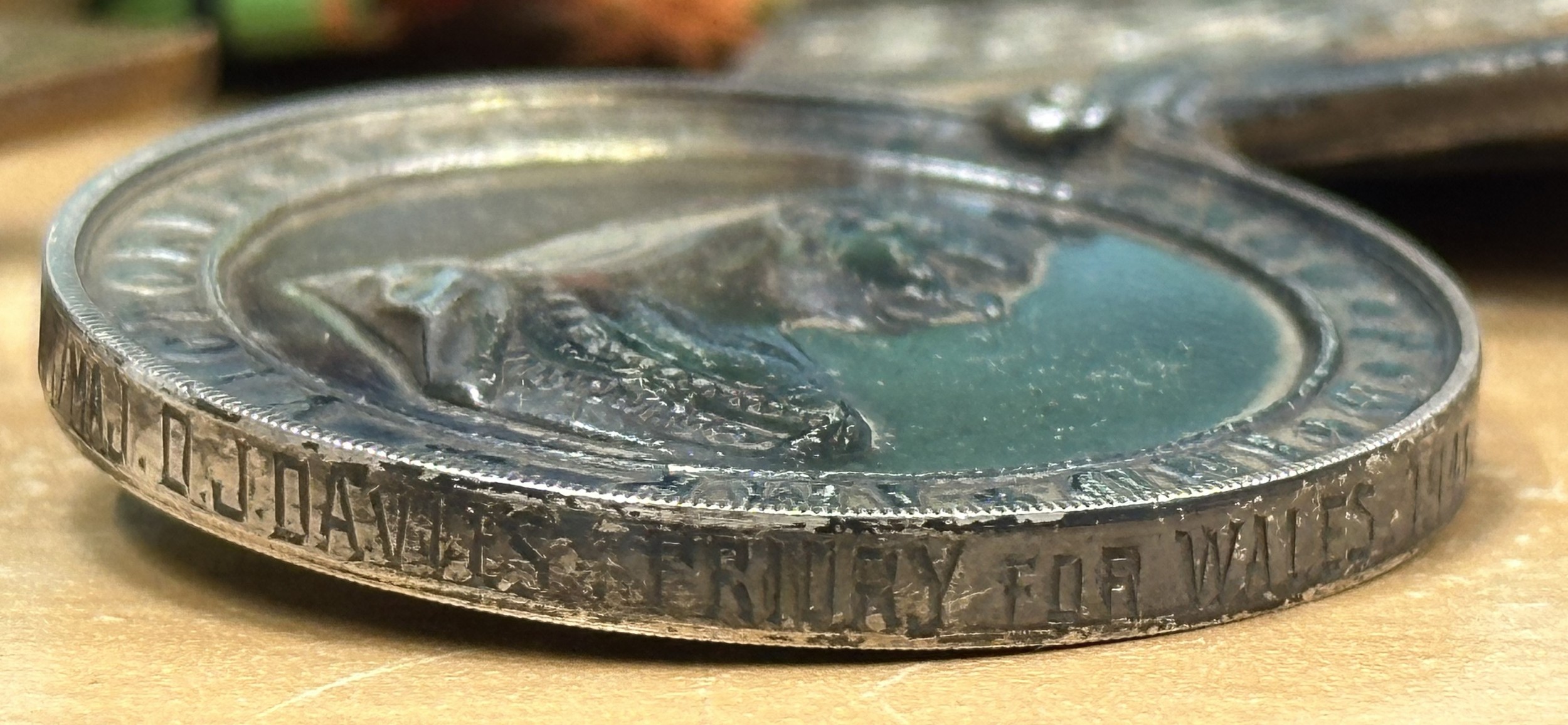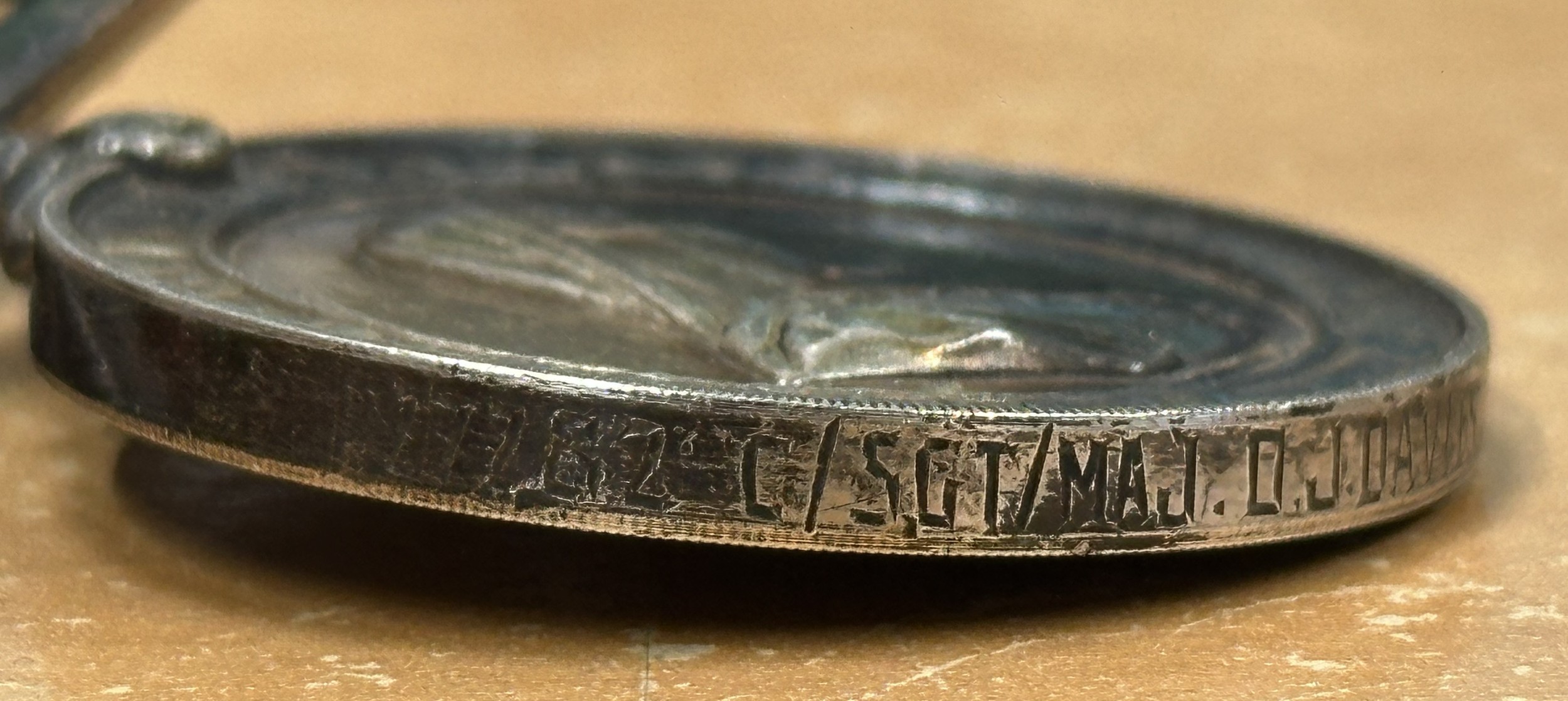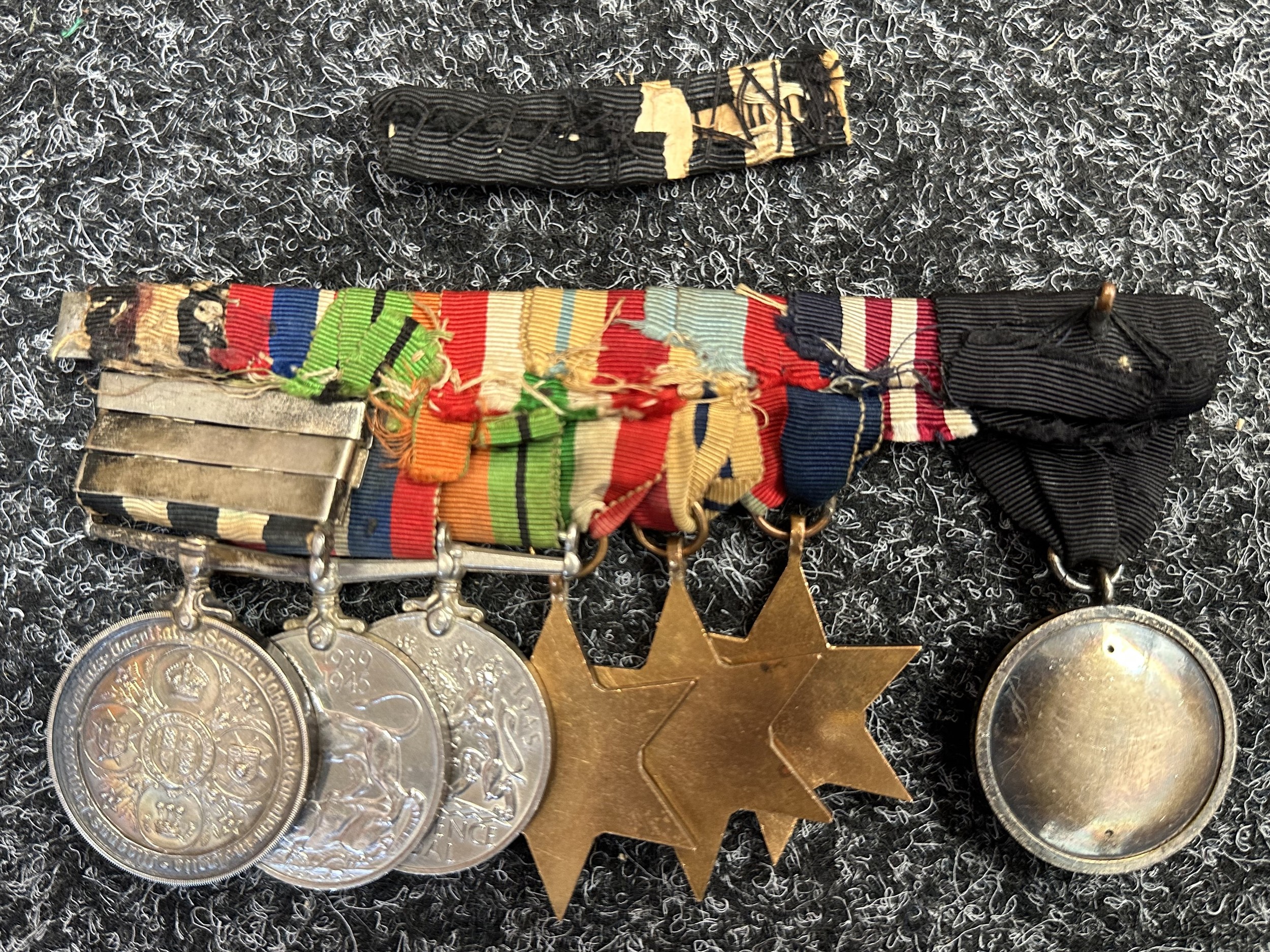 Uncleaned medals, ribbons dusty and faded.