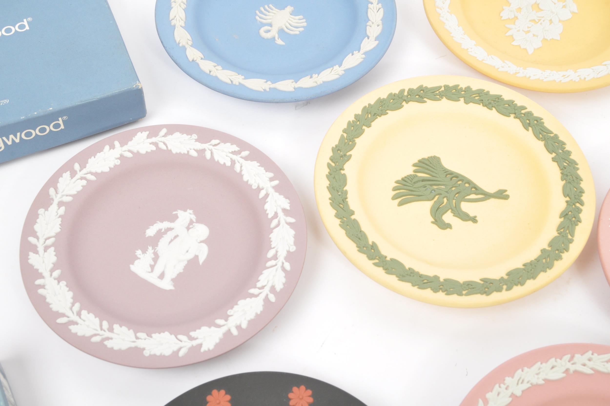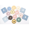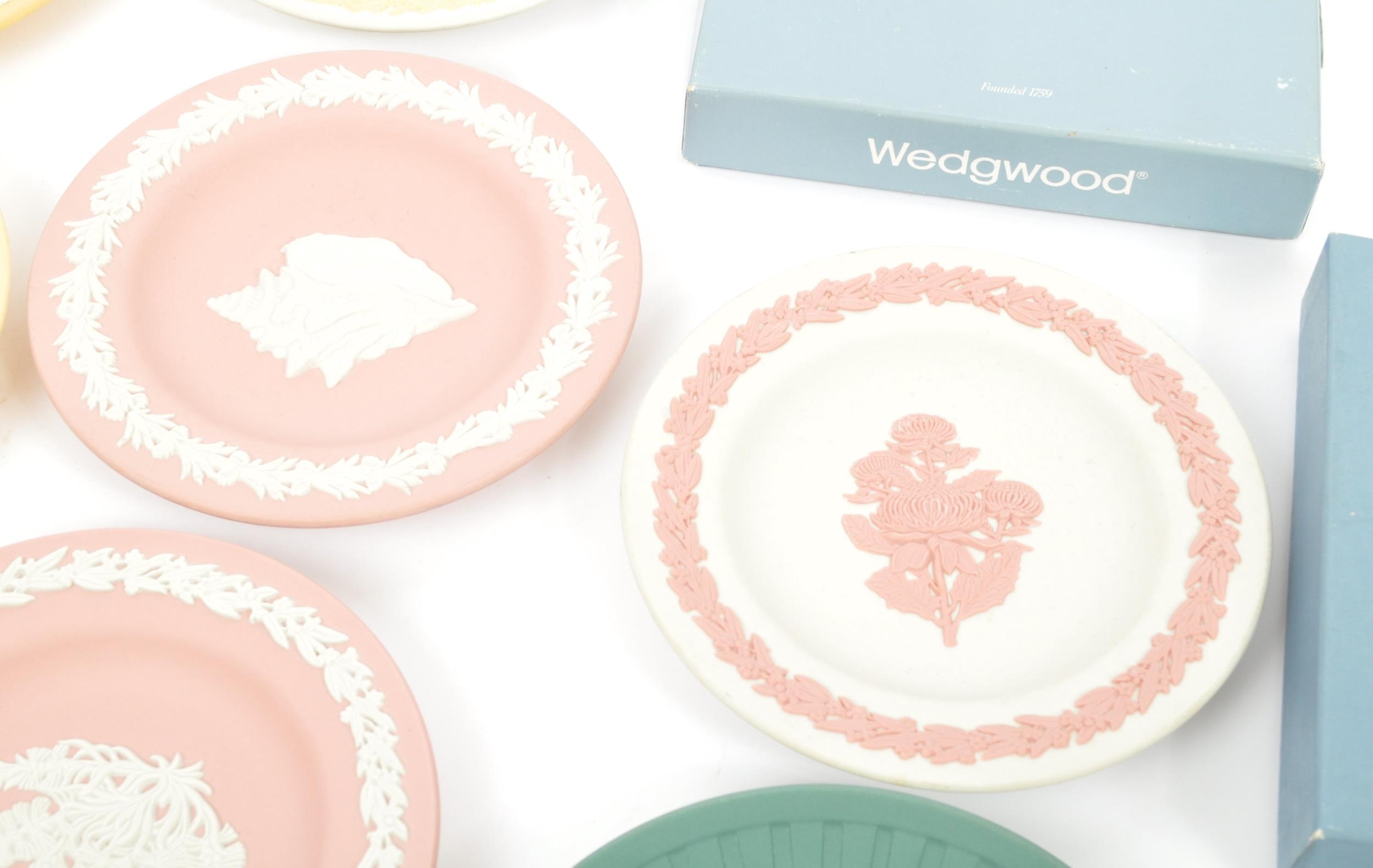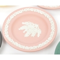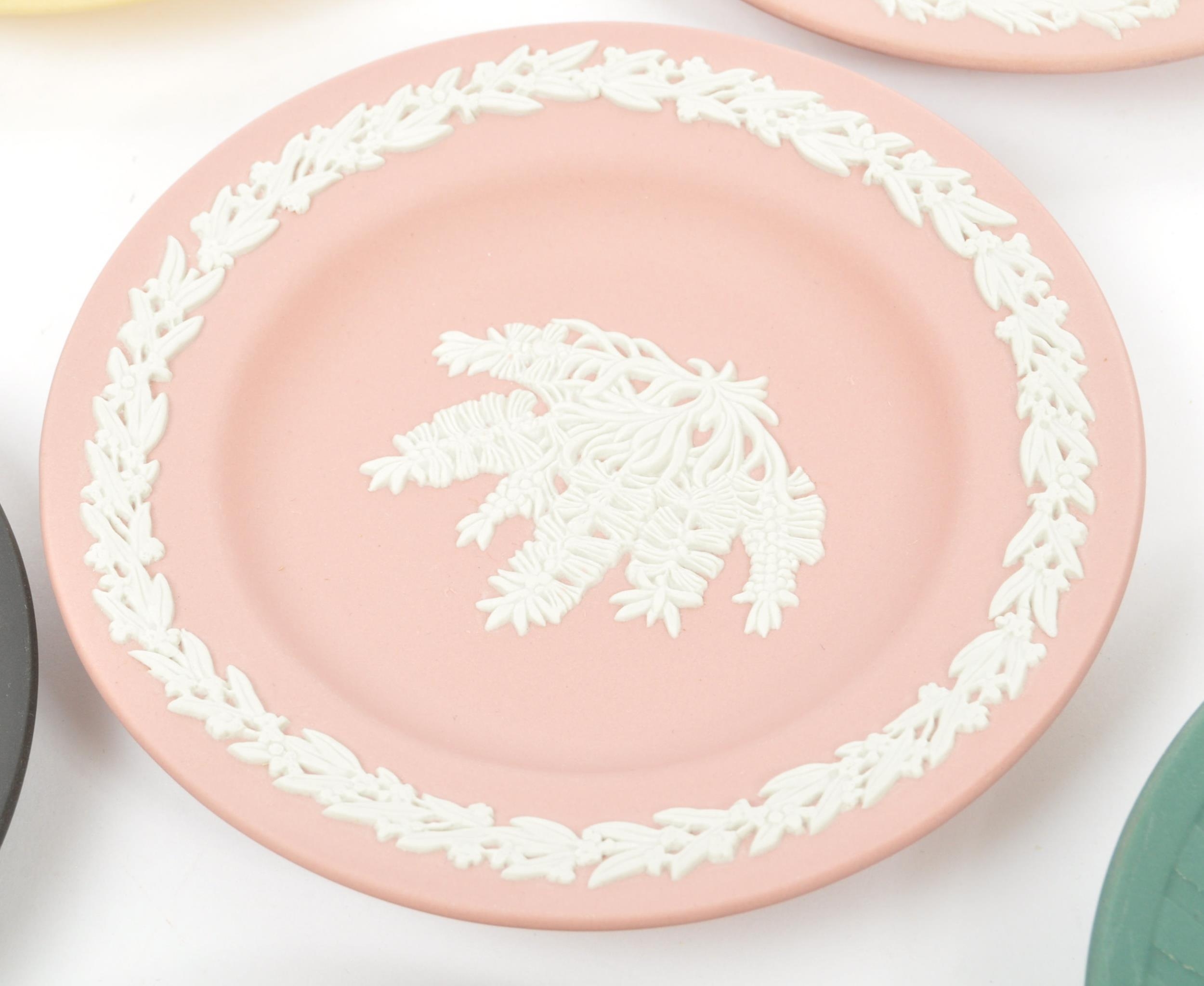 Wedgwood - A series of 20th century Wedgwood jasperware dishes. Each piece having relief work upon various grounds of yellow, white, cane yellow, pink and teal and having sprigged border with central motifs of flowers and shells. Accompanied by Wedgwood presentation boxes.