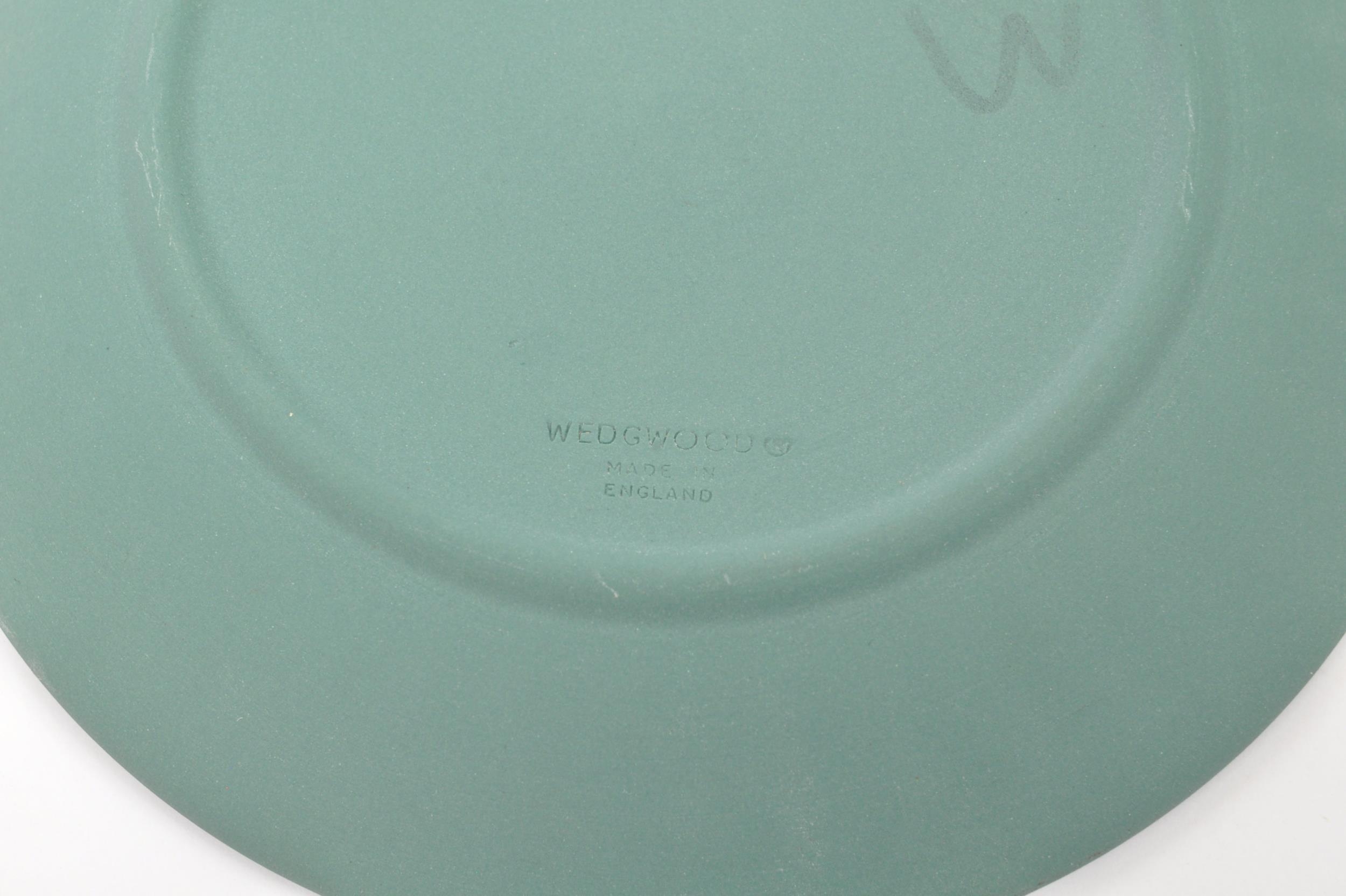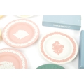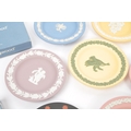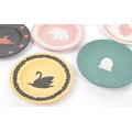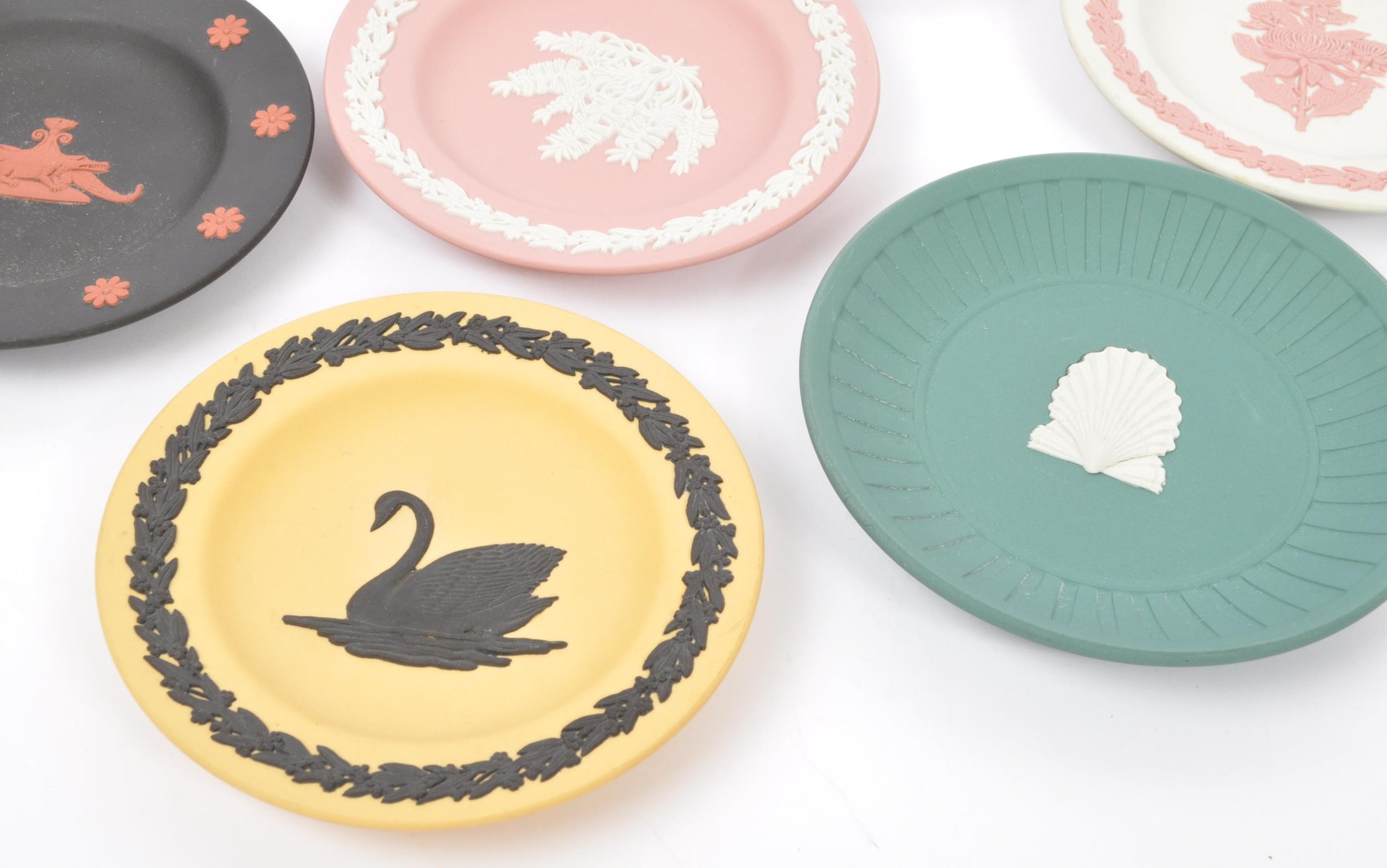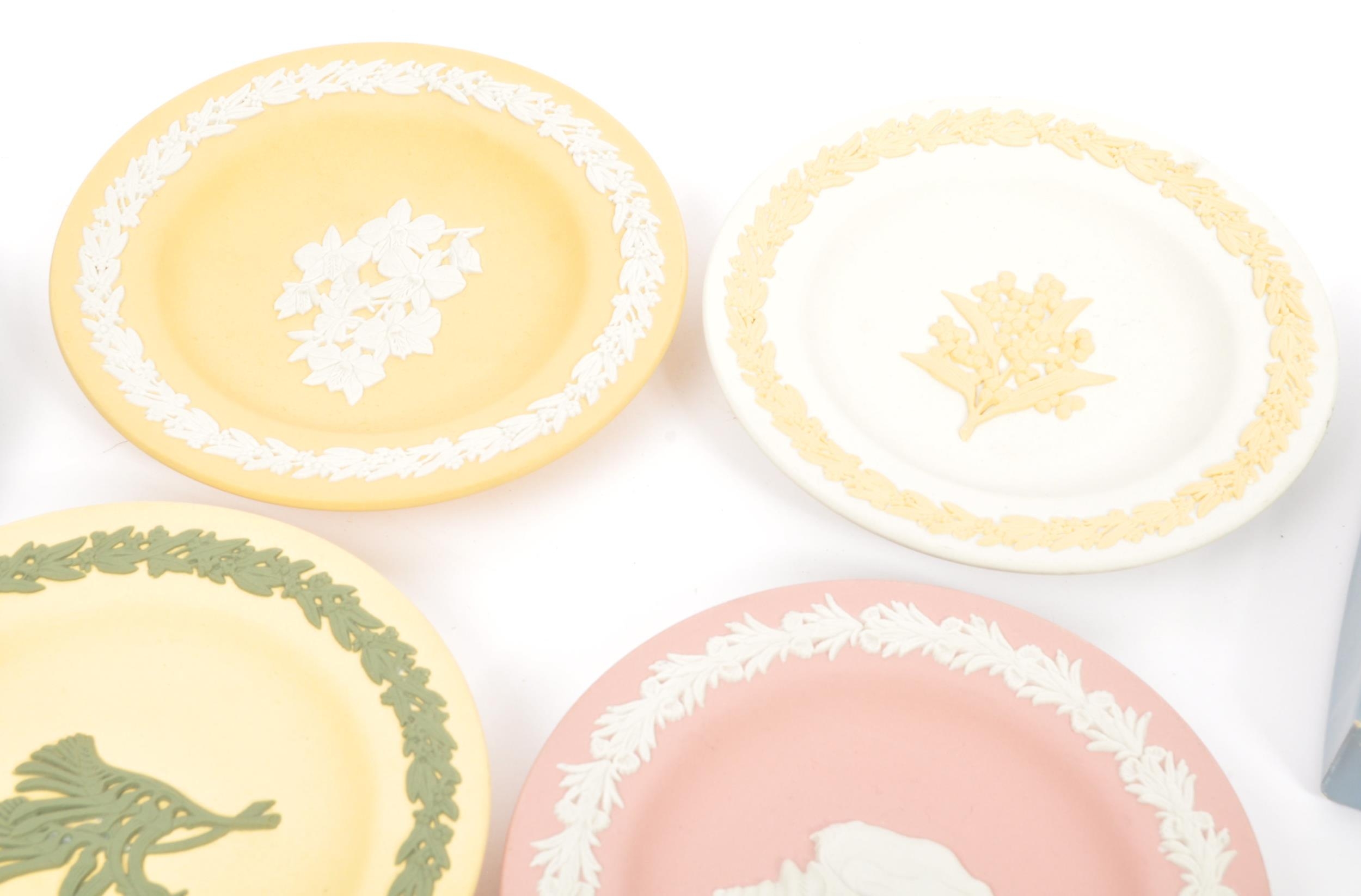 Wedgwood - A series of 20th century Wedgwood jasperware dishes. Each piece having relief work upon various grounds of yellow, white, cane yellow, pink and teal and having sprigged border with central motifs of flowers and shells. Accompanied by Wedgwood presentation boxes.