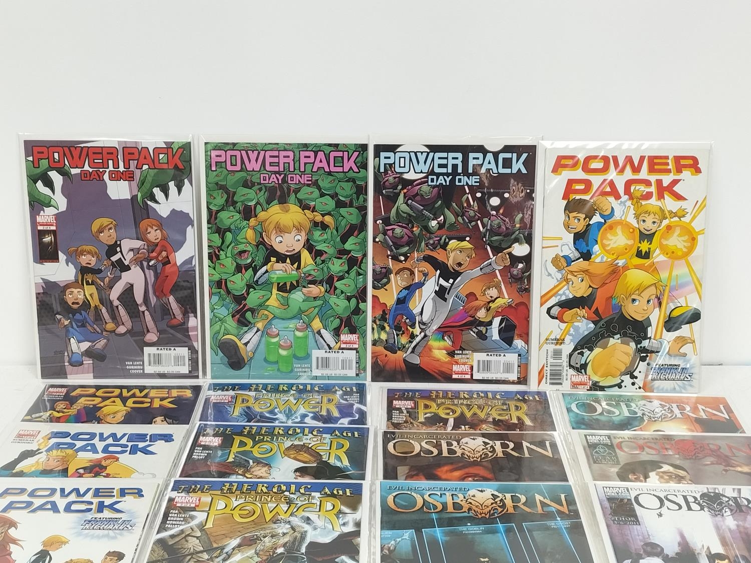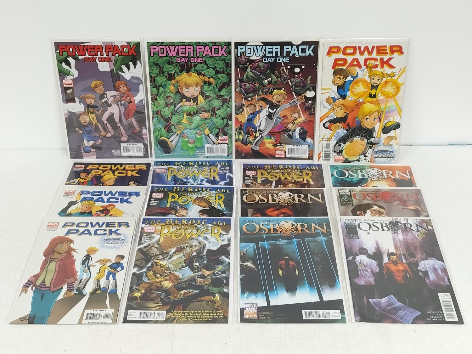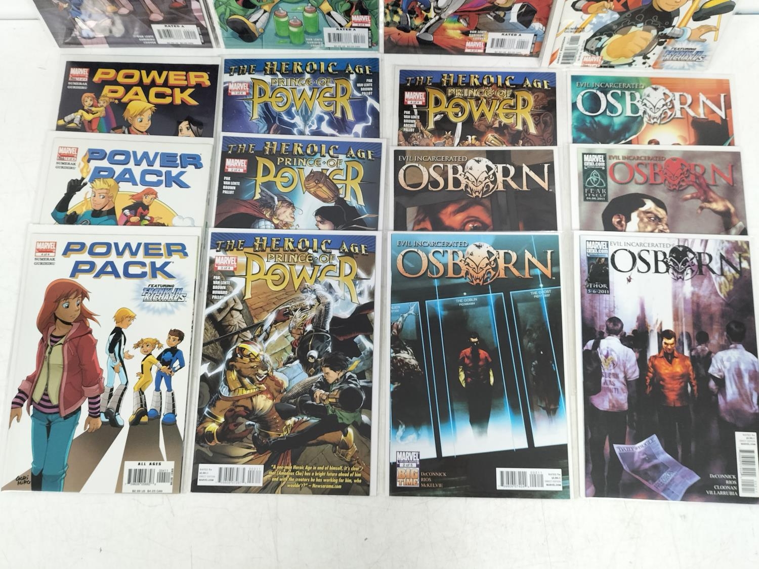 Collection of Marvel Comics (16) to include Osborn Evil Incarcerated Limited Edition of 5 Complete, Prince of Power The Heroic Age 2010 Limited Edition of 4 Complete, Power Pack Day One Limited Edition of 4 Nos 2,3,4 and Power Pack 2005 Limited Edition of 4 Complete. Bagged and Boarded.