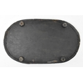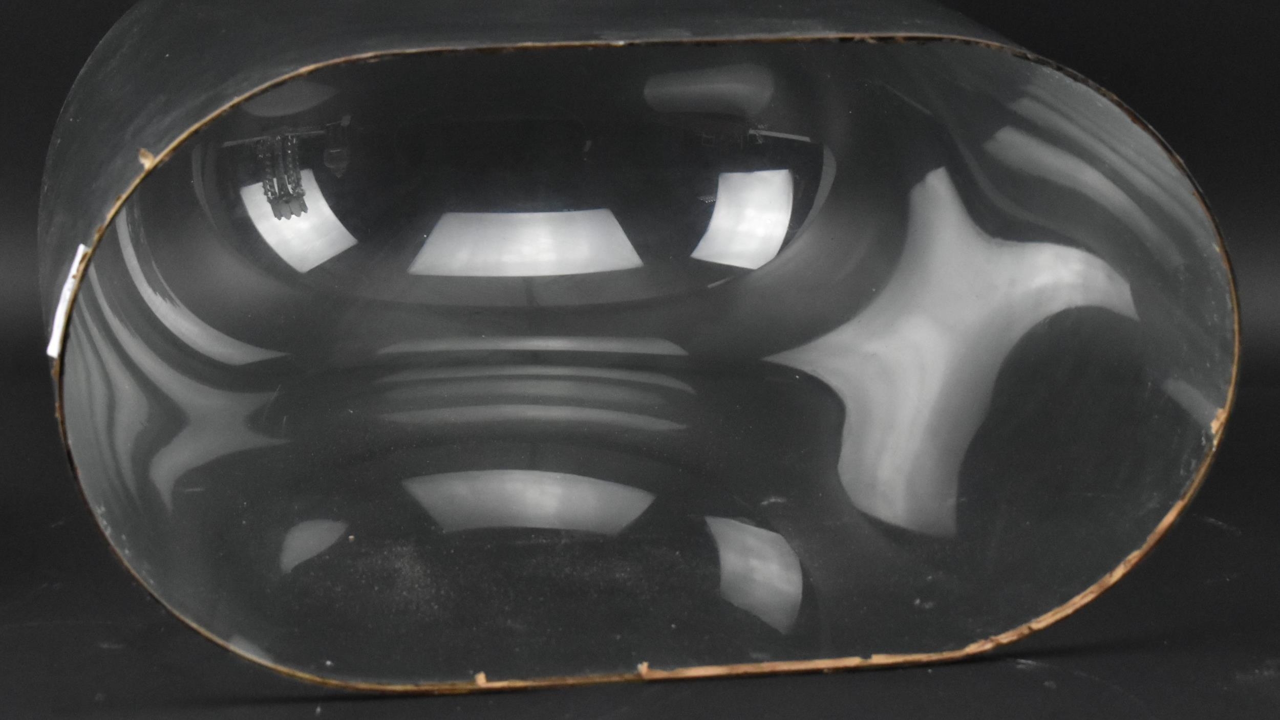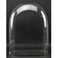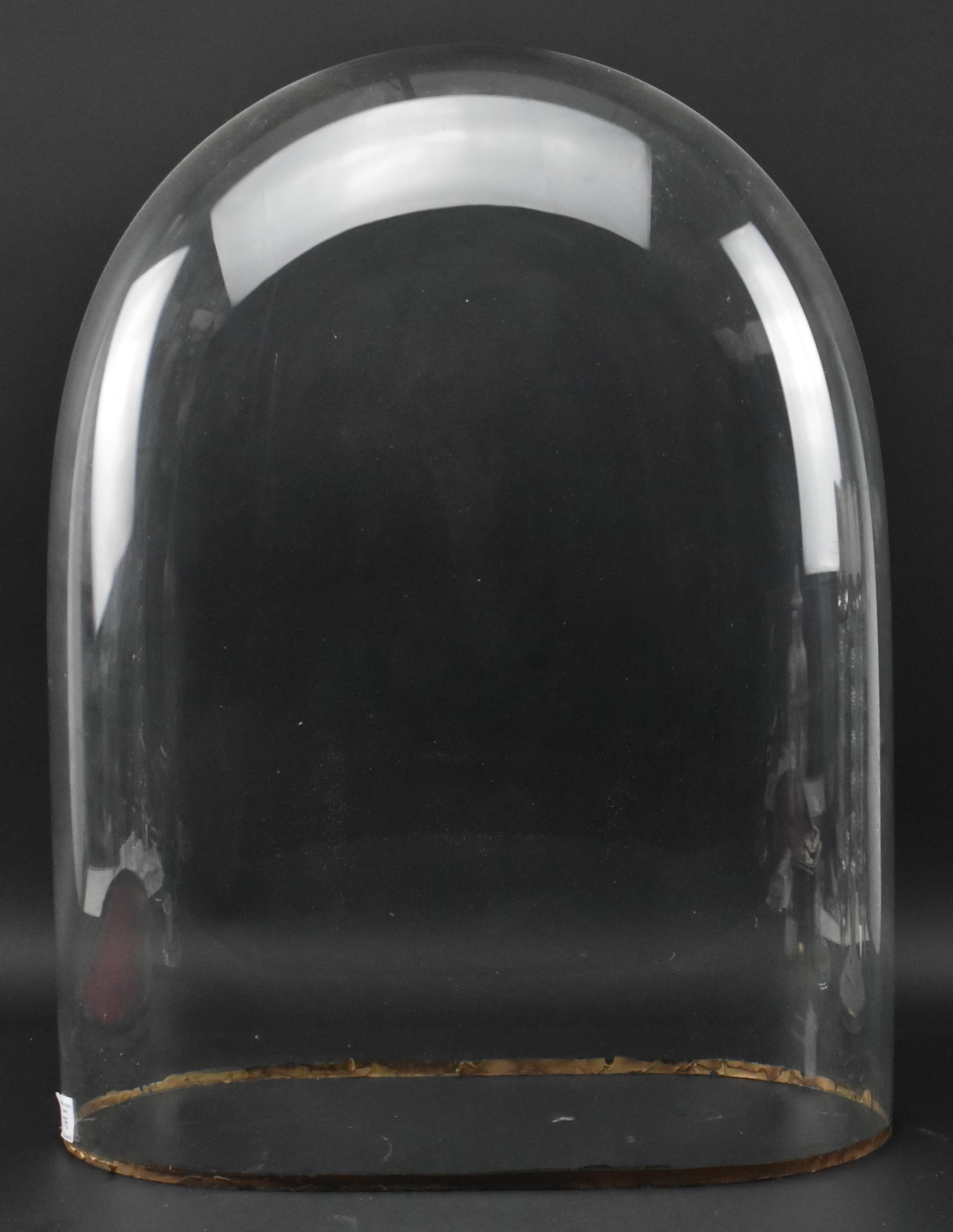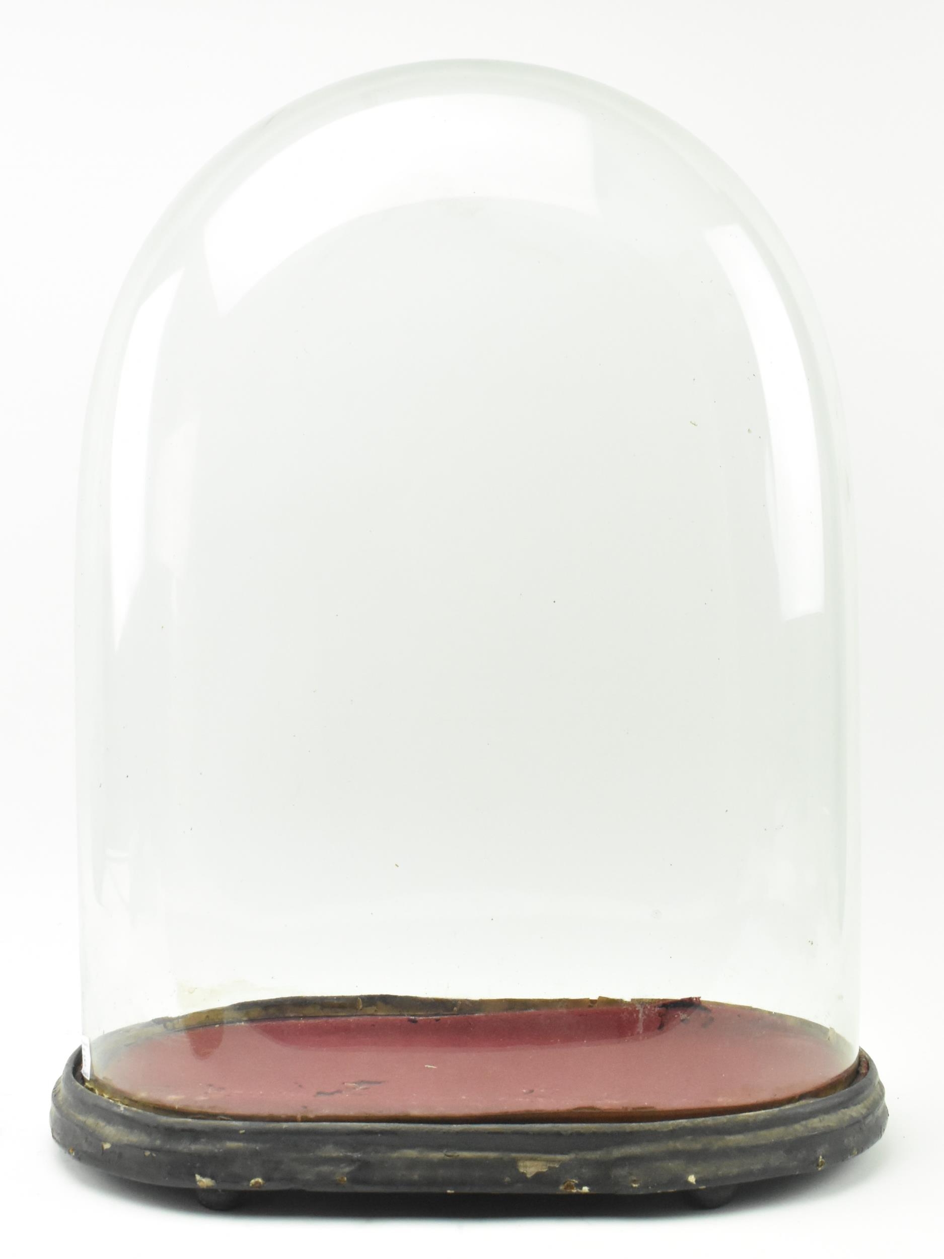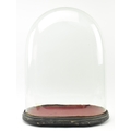 An early 20th century glass dome. The large glass dome raised on a wine colour fabric lined black wooden base. Measures approx. 56cm tall x 38cm wide.