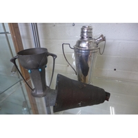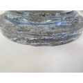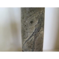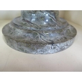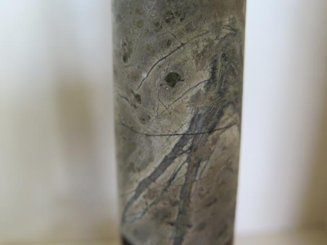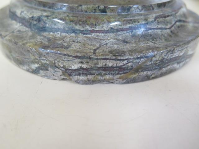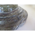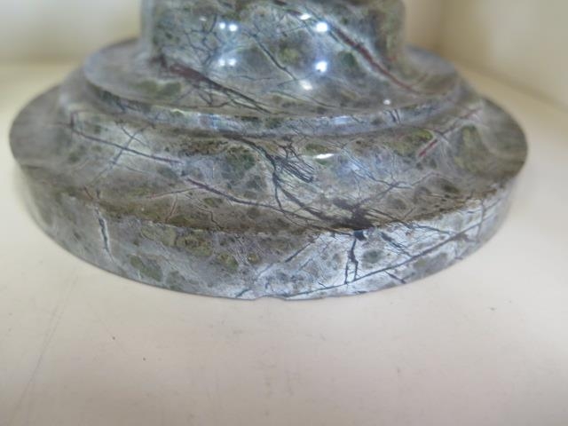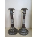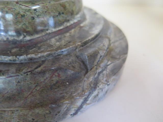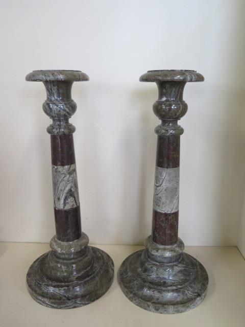 A pair of Cornish serpentine marble candlesticks - 36cm tall, both have chipping, one broken and repaired