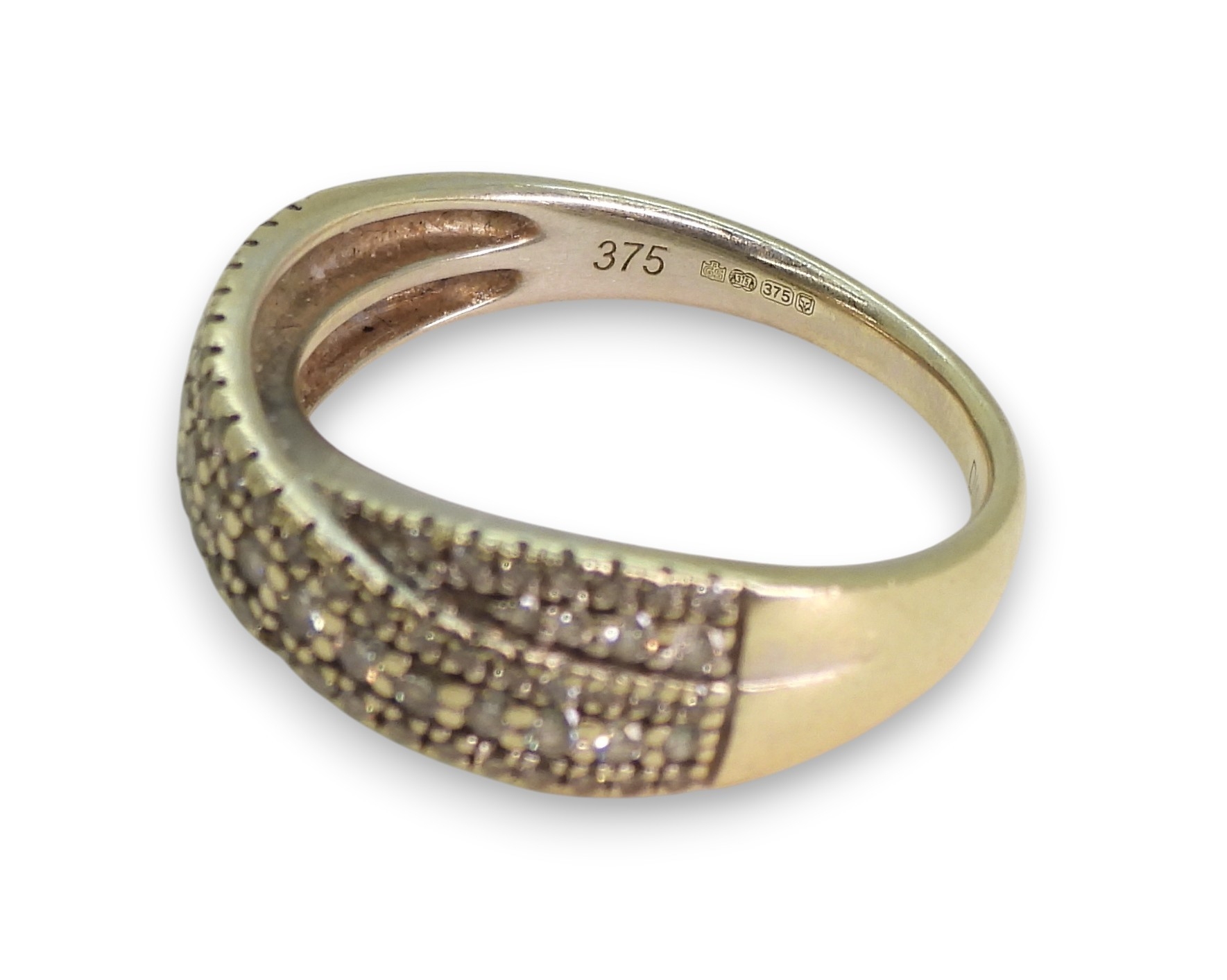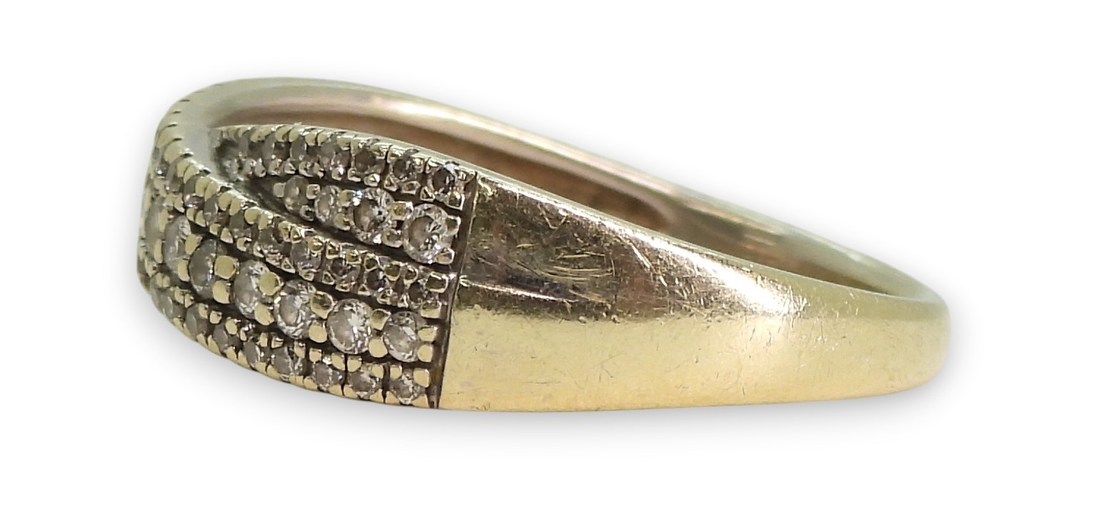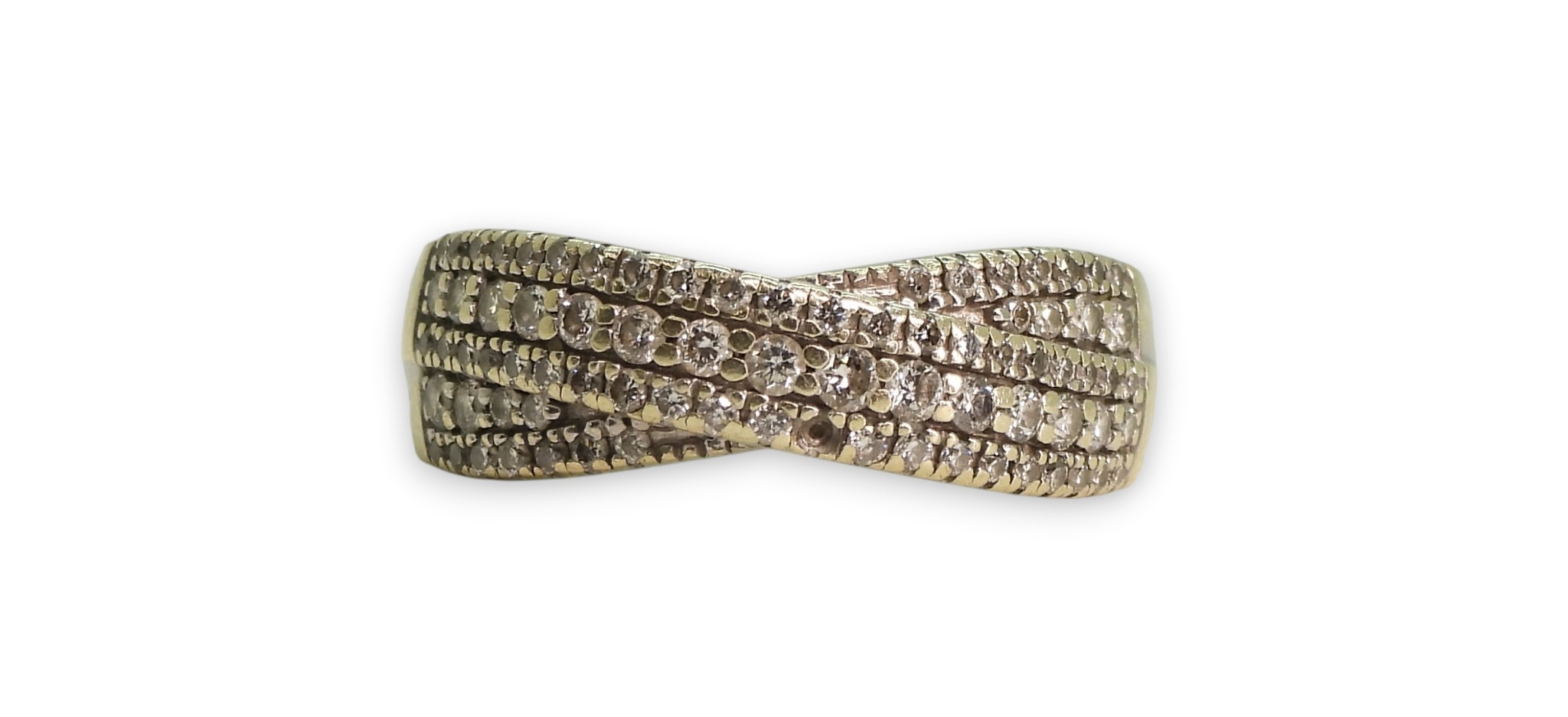 A 9ct white gold pave diamond set cross over ring, set with estimated approx 0.50cts of brilliant cut diamonds, (one diamond missing) size L1/2, weight 3.4gms