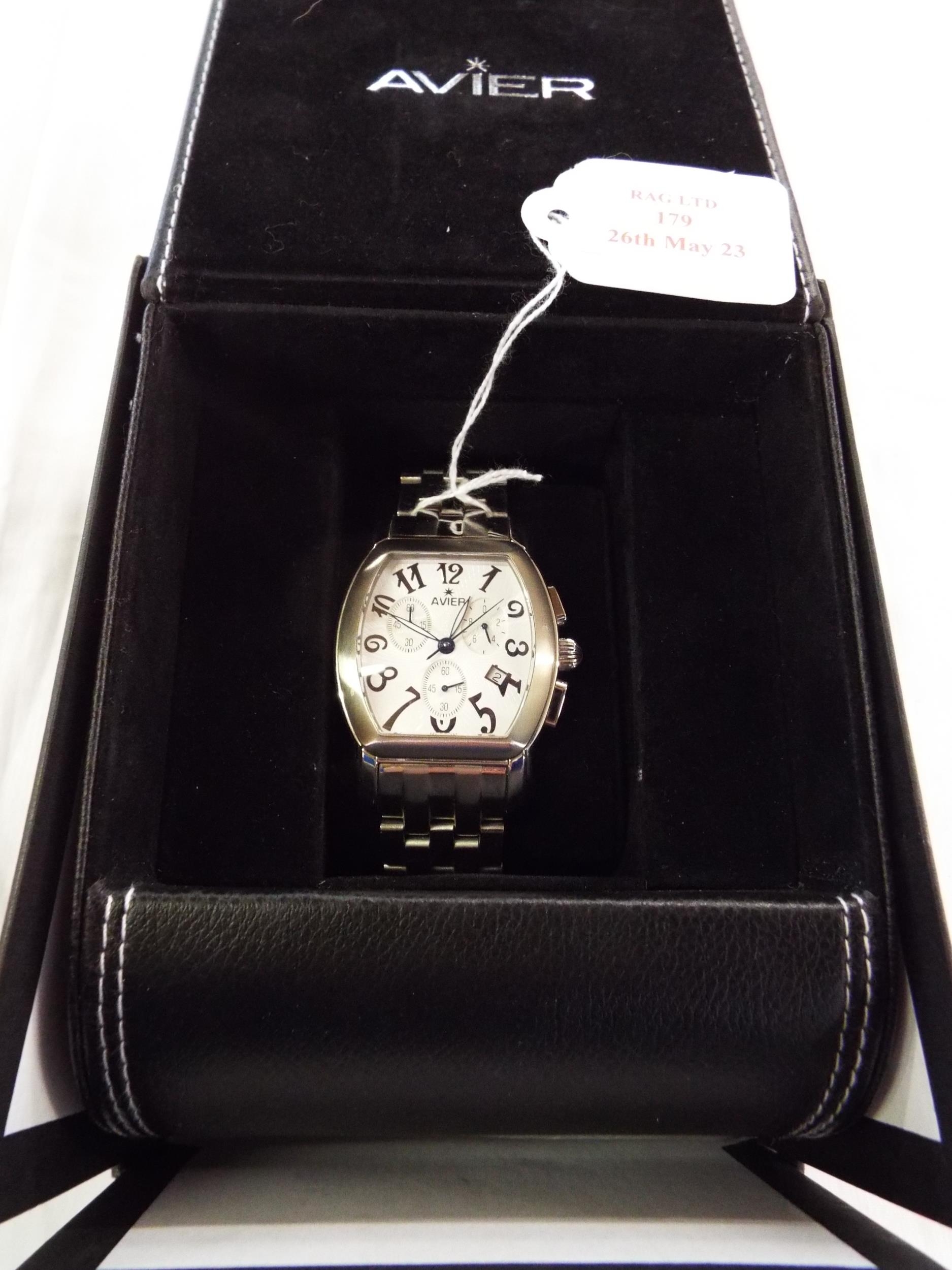 A boxed as new Avier Statesman stainless steel sapphire crystal 50 metre gents wristwatch with date aperture