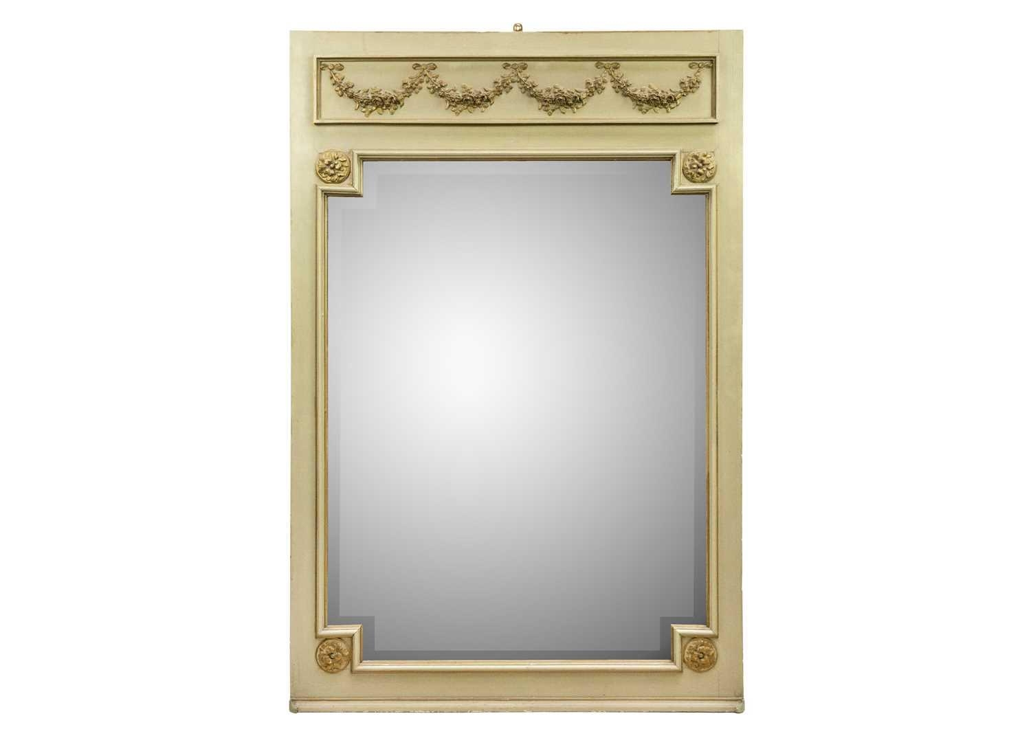 A late 19th century French rectangular green painted and gilt wall mirror. With applied floral decoration, and a bevel edge plate with indented corners, height 136cm, width 90cm.